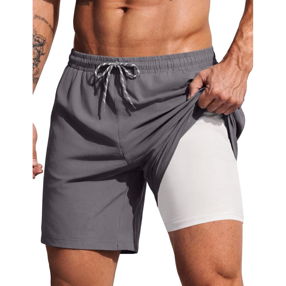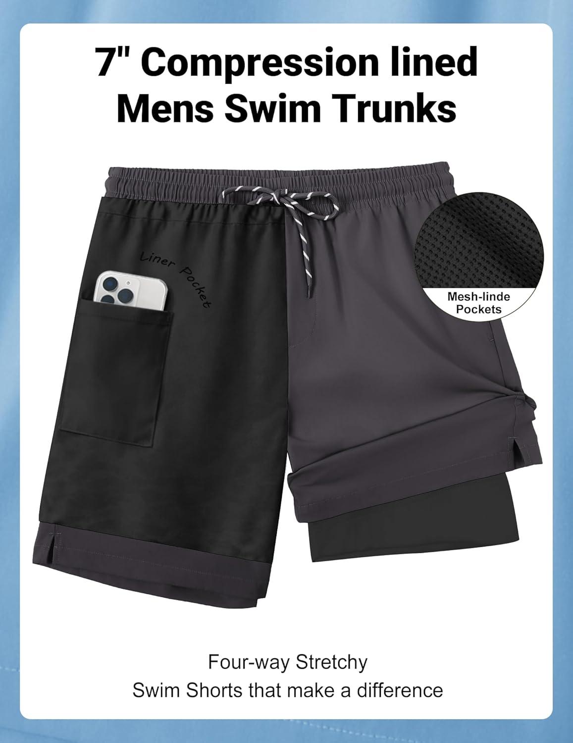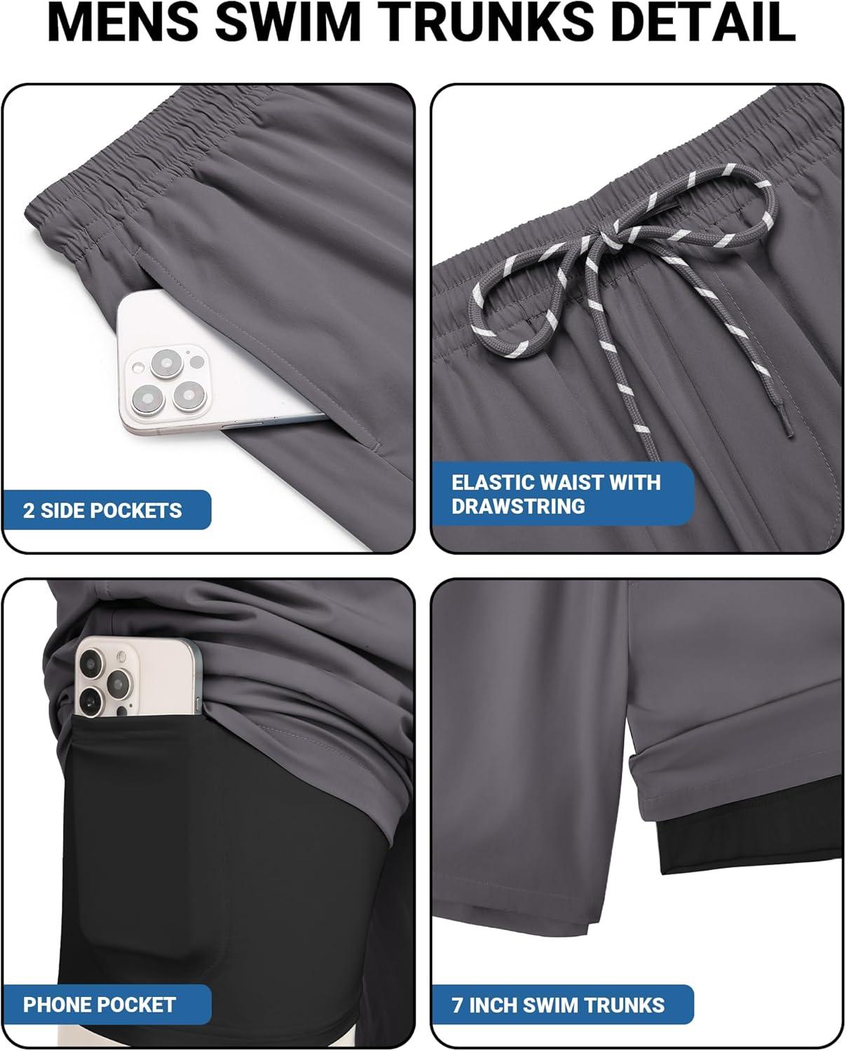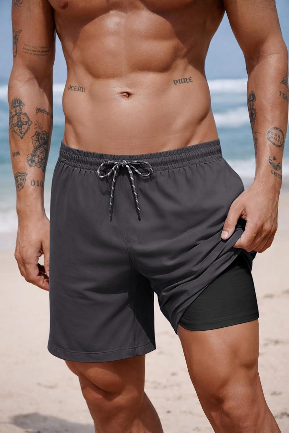 COOFANDY 2 in 1 Mens Swim Trunks 7 Inch Quick Dry Board Shorts Beach Swim Shorts Bathing Suit with Compression Liner(Dark Gray)
