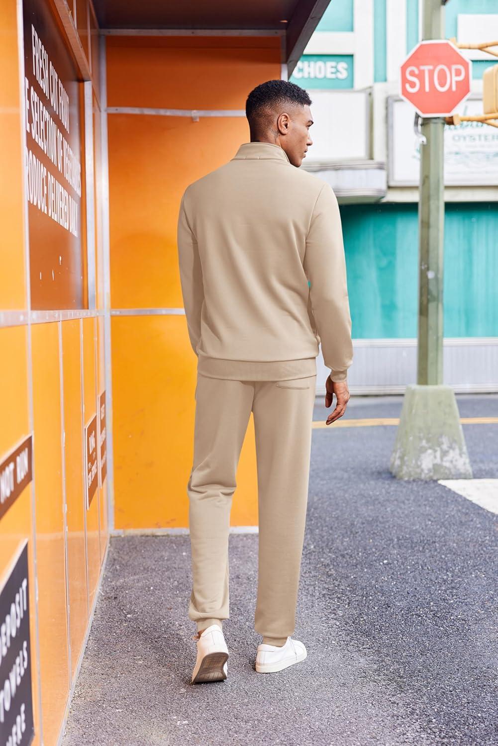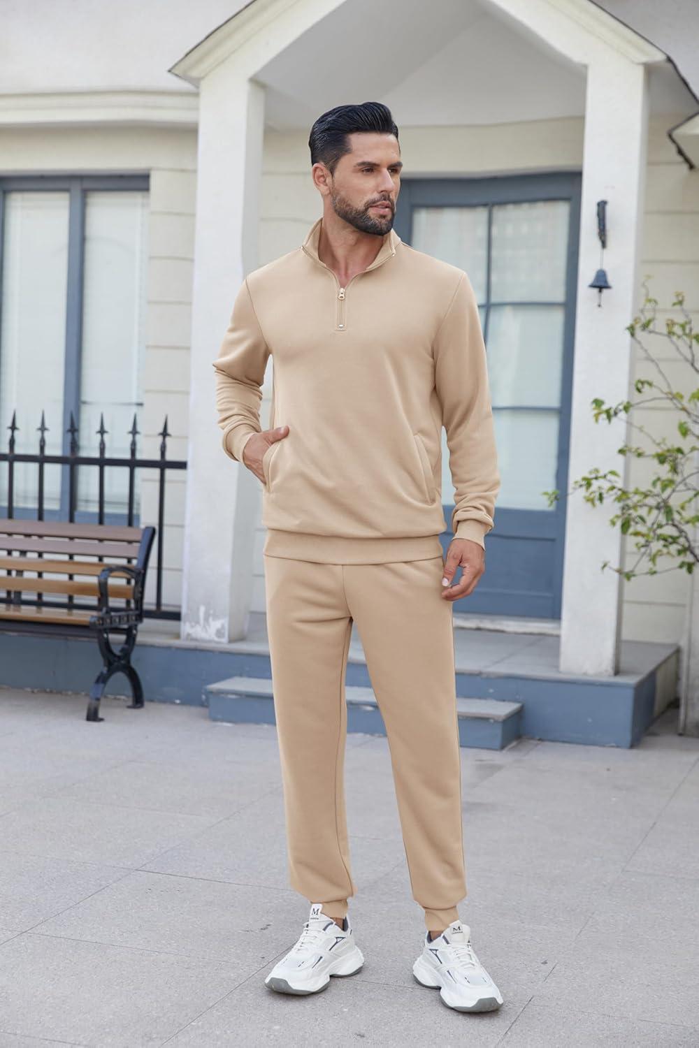 COOFANDY 2 Piece Set for Men Casual 1/4 Zip Track Suits Set Long Sleeve Quarter Pullover Jogging Suits 2025 Fashion Outfits(Cream)