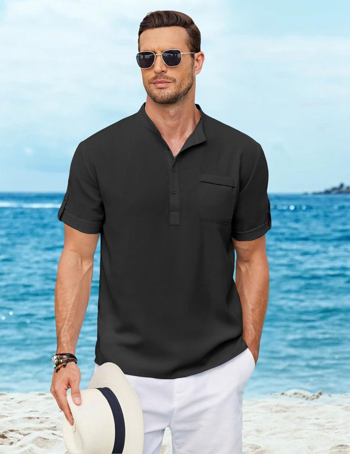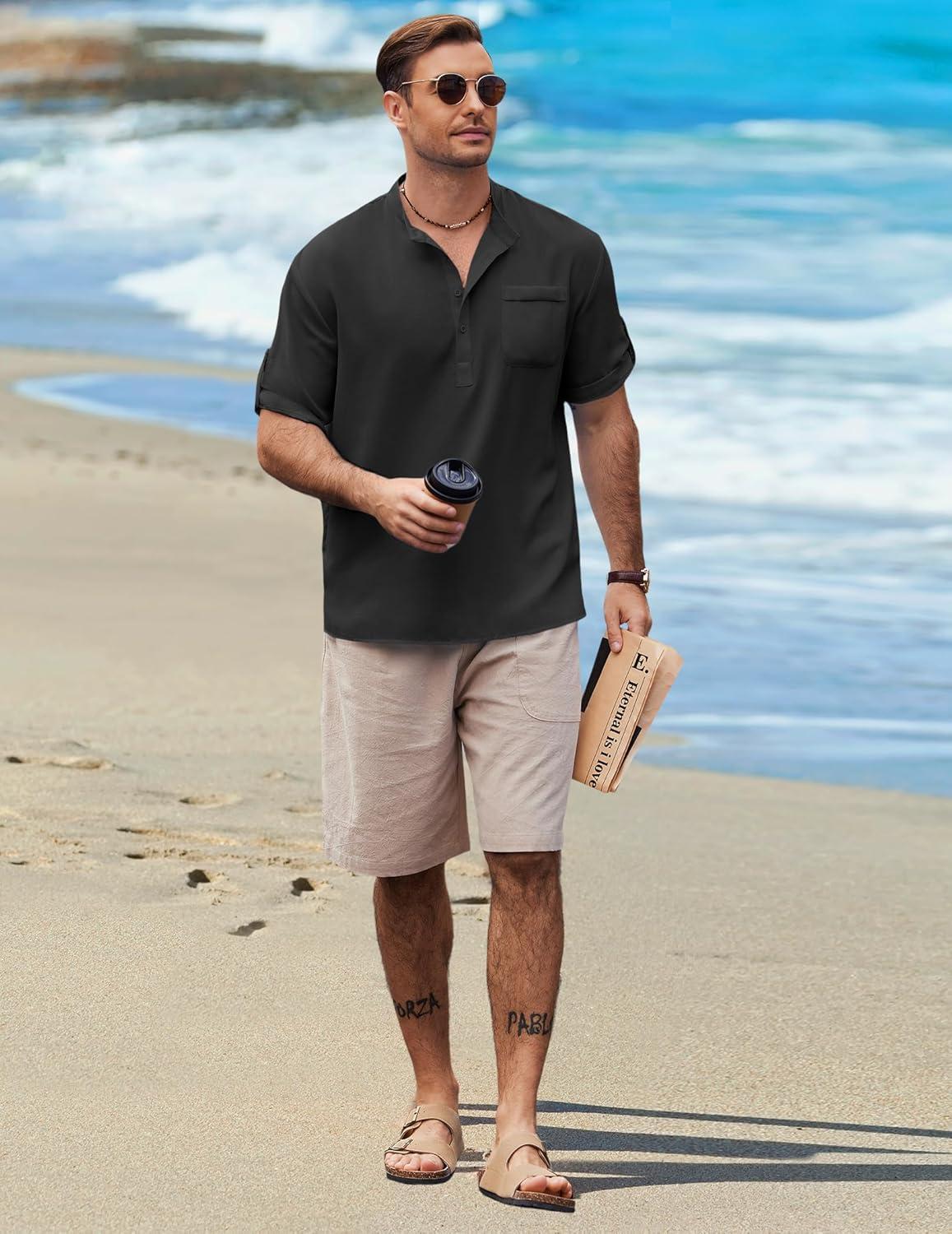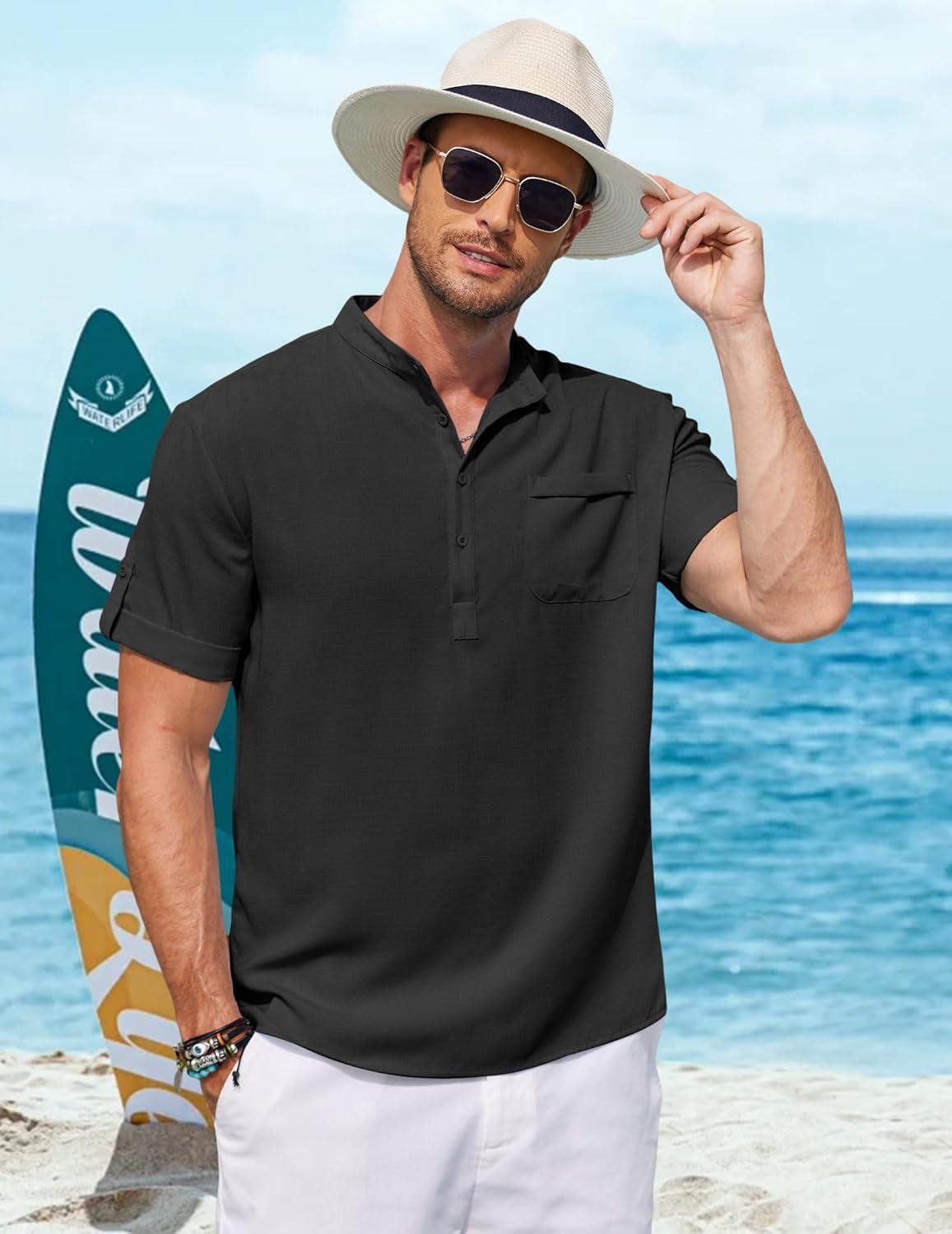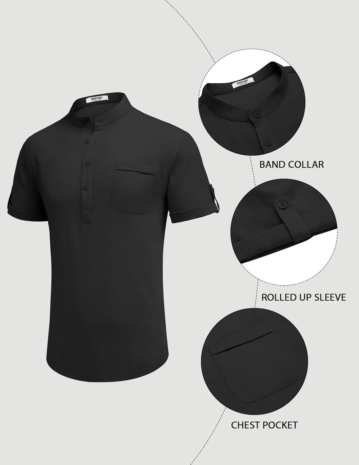 COOFANDY Henley Shirts for Men Short Sleeve Band Collar Casual Shirt Summer Hippie Vacation Beach T Shirts with Pocket(Black)