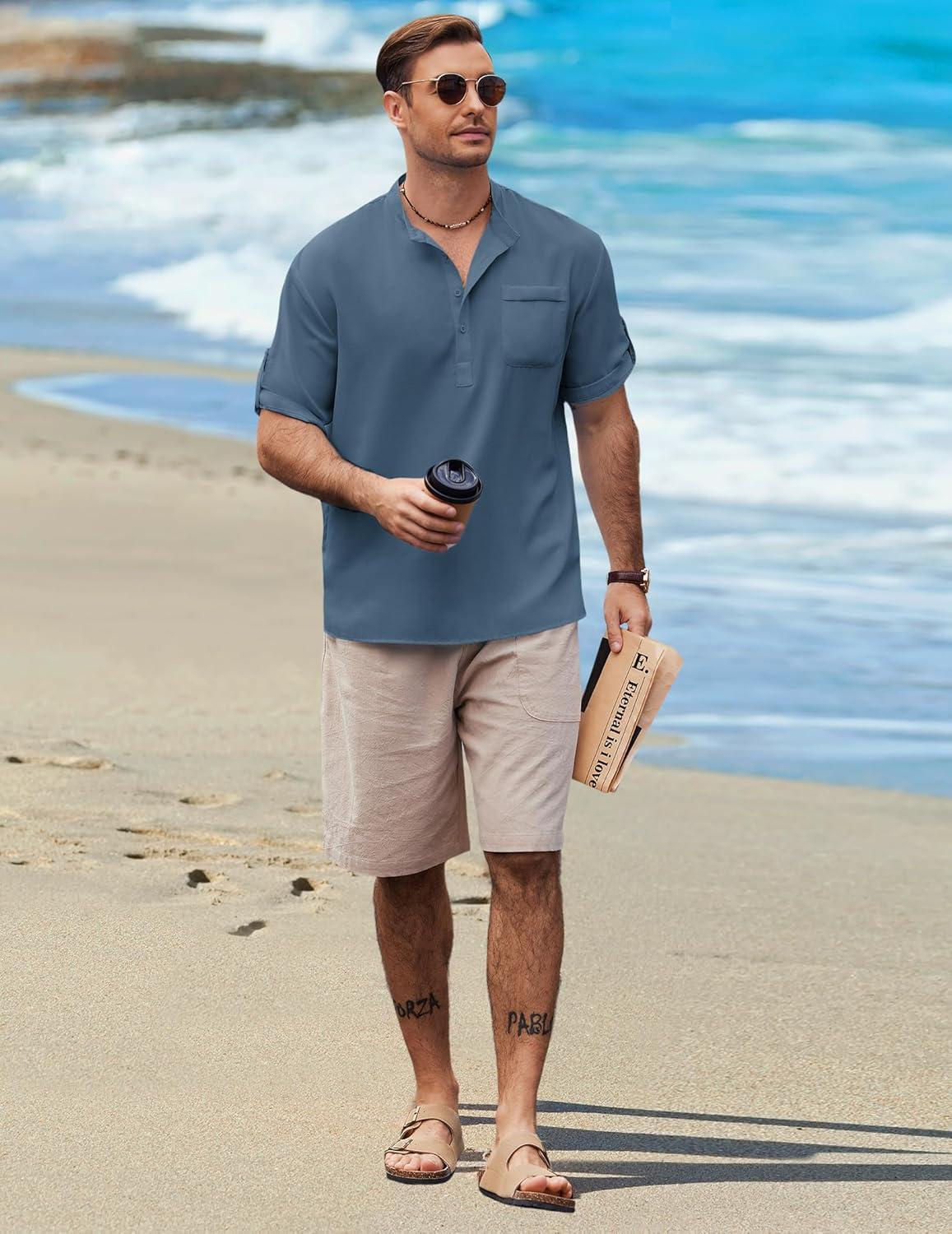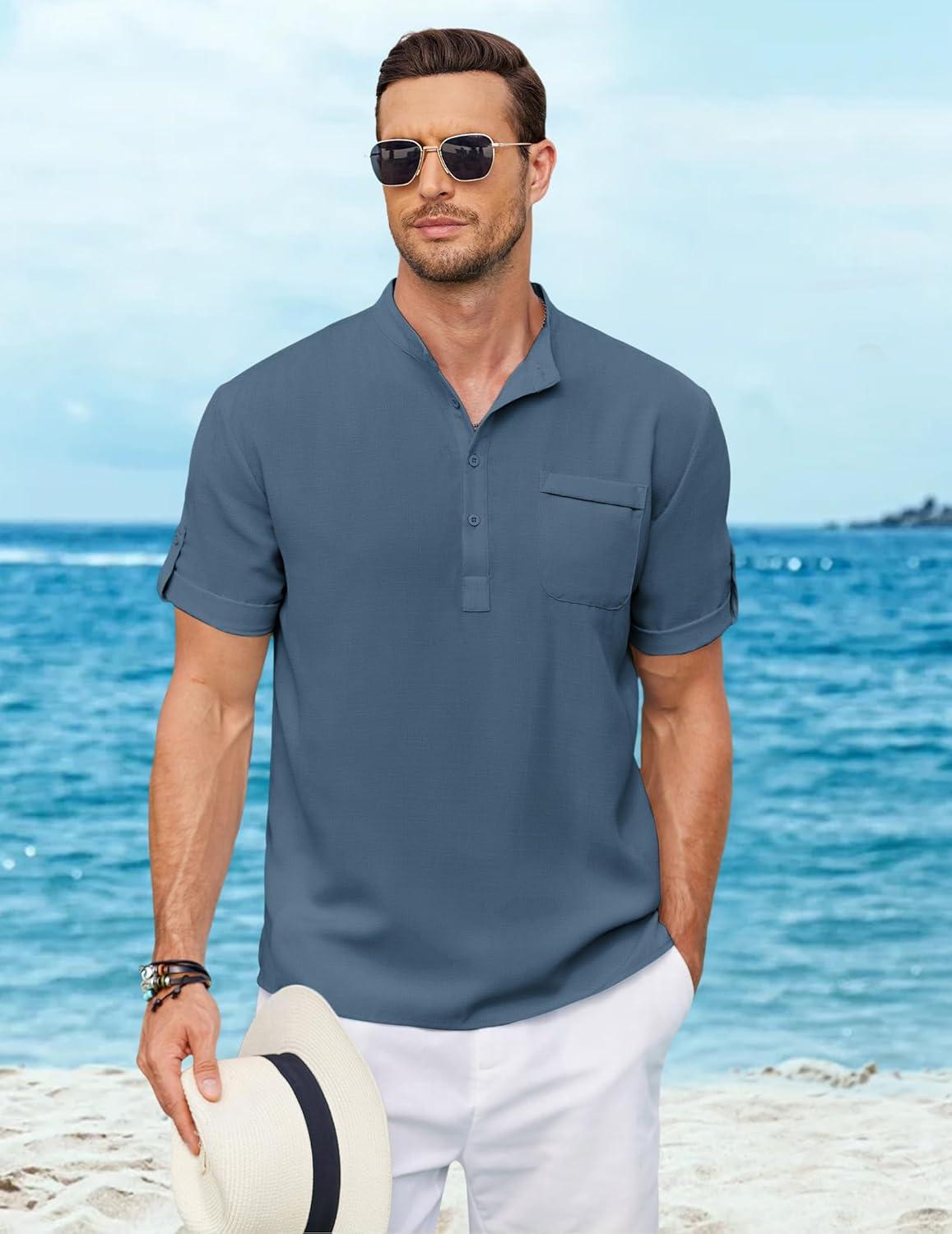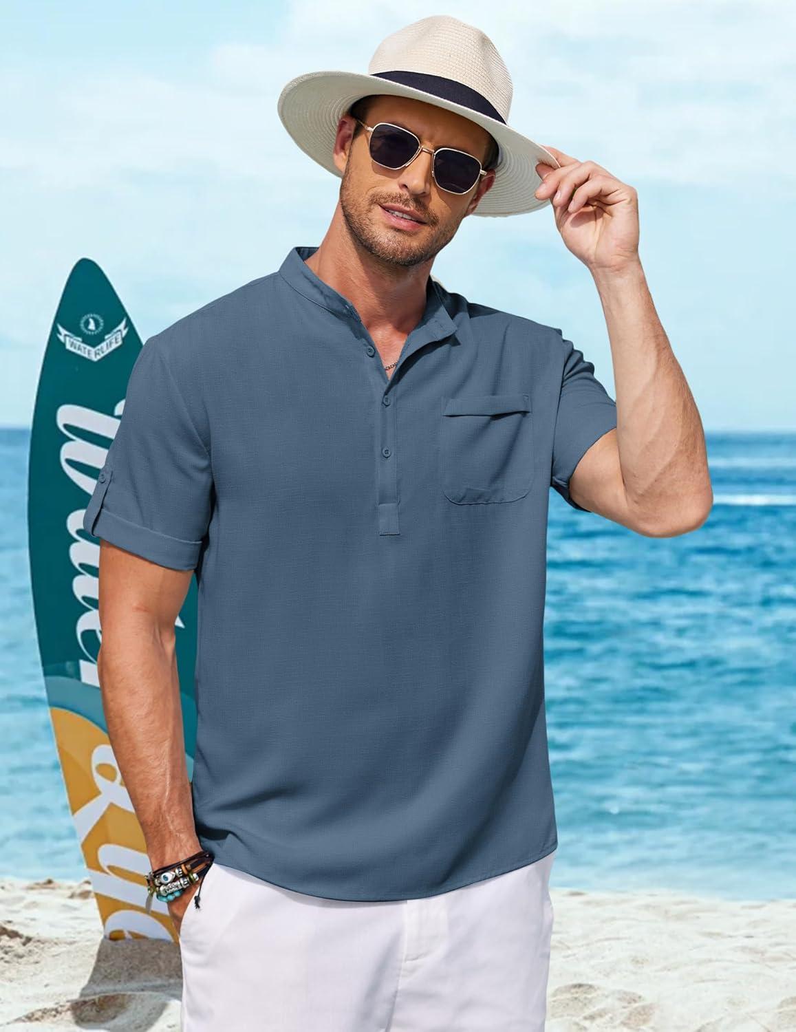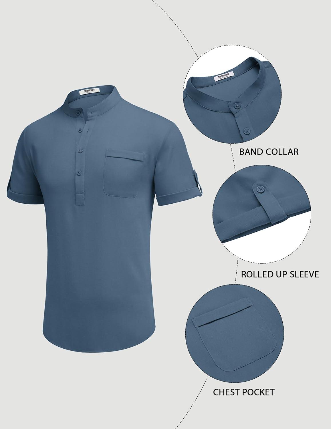 COOFANDY Henley Shirts for Men Short Sleeve Band Collar Casual Shirt Summer Hippie Vacation Beach T Shirts with Pocket(Blue)