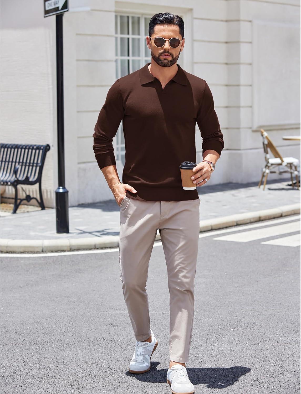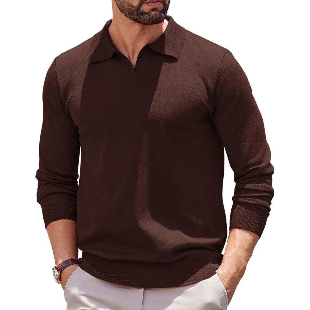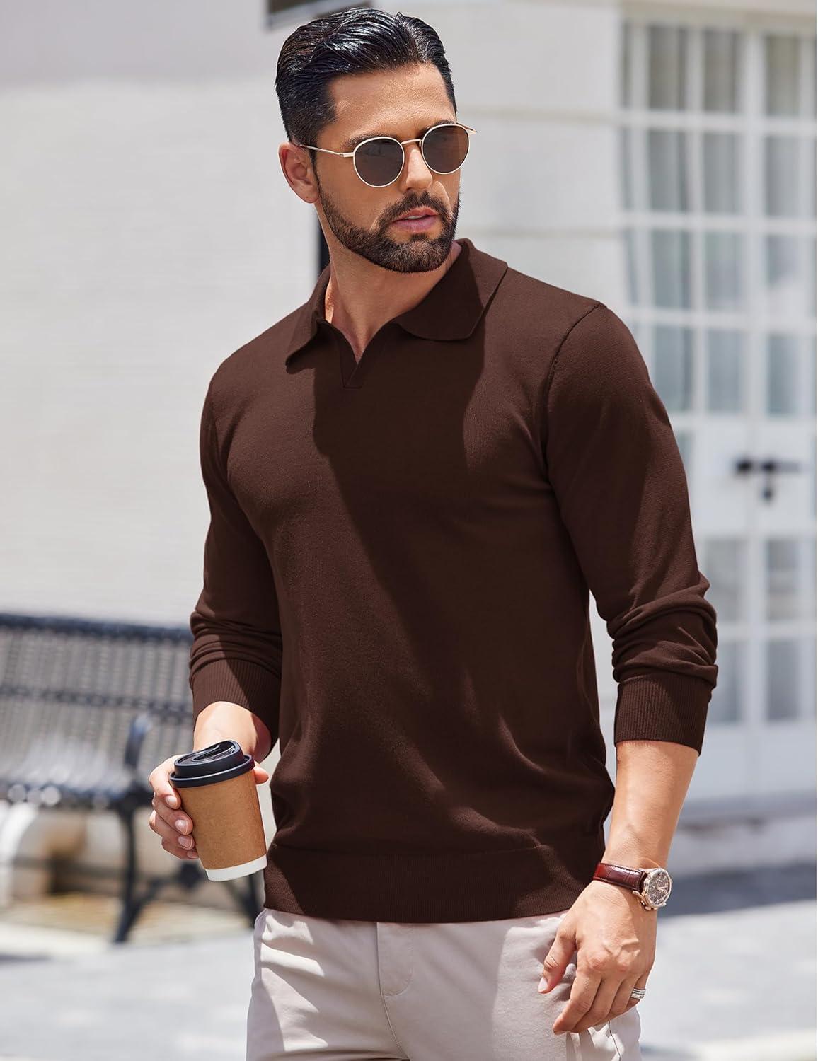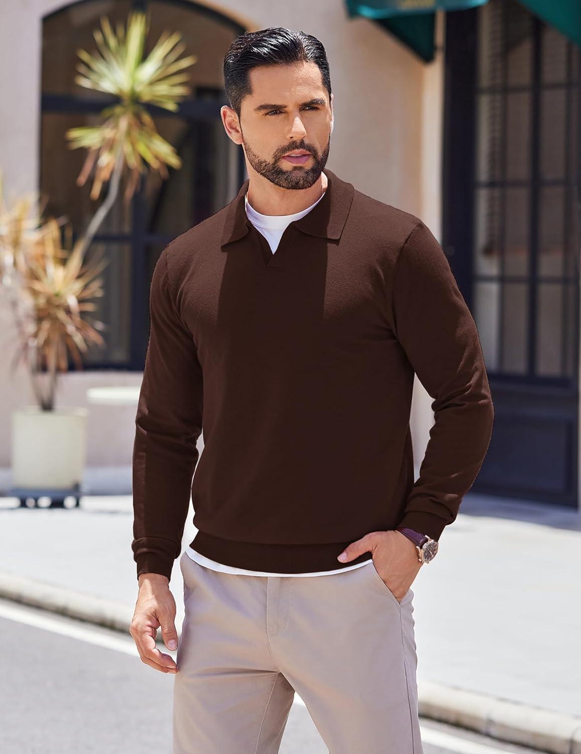COOFANDY Long Sleeve Polo Shirts for Men Knit Polo Sweater Lightweight Ribbed Pullover Sweater(Brown)