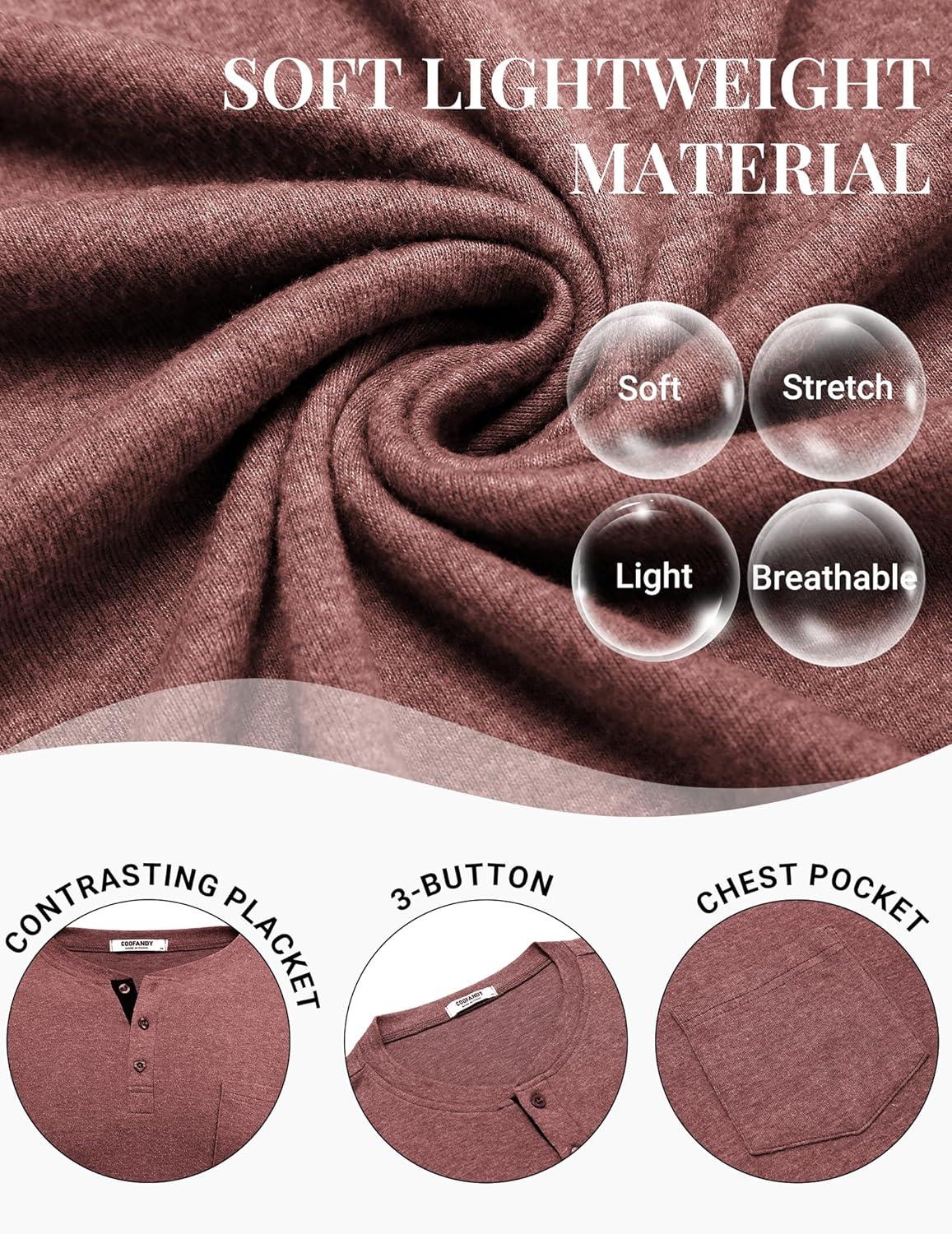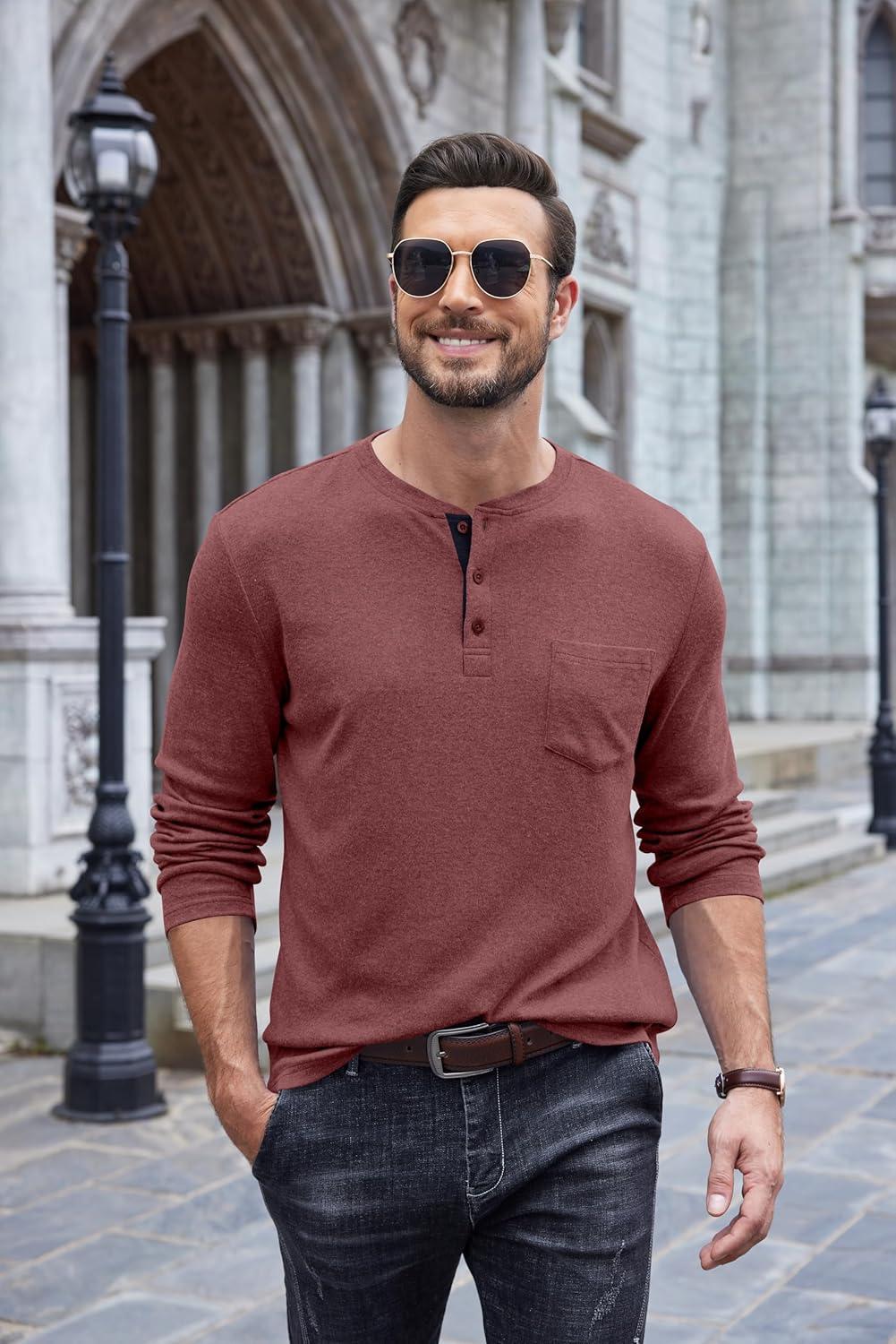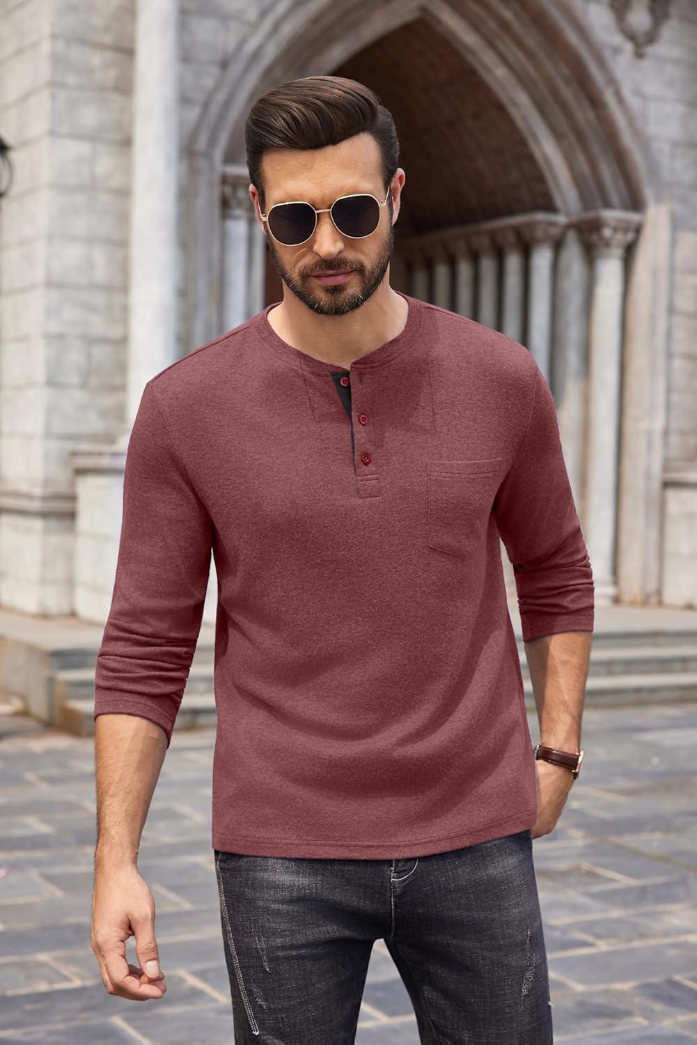 Get the COOFANDY Men Long Sleeve Henley T-Shirs Casual Basic Lightweight Fashion Shirts Soild Tees with Pockets(Purple Red) you want at a discounted price during our markdown sale event.