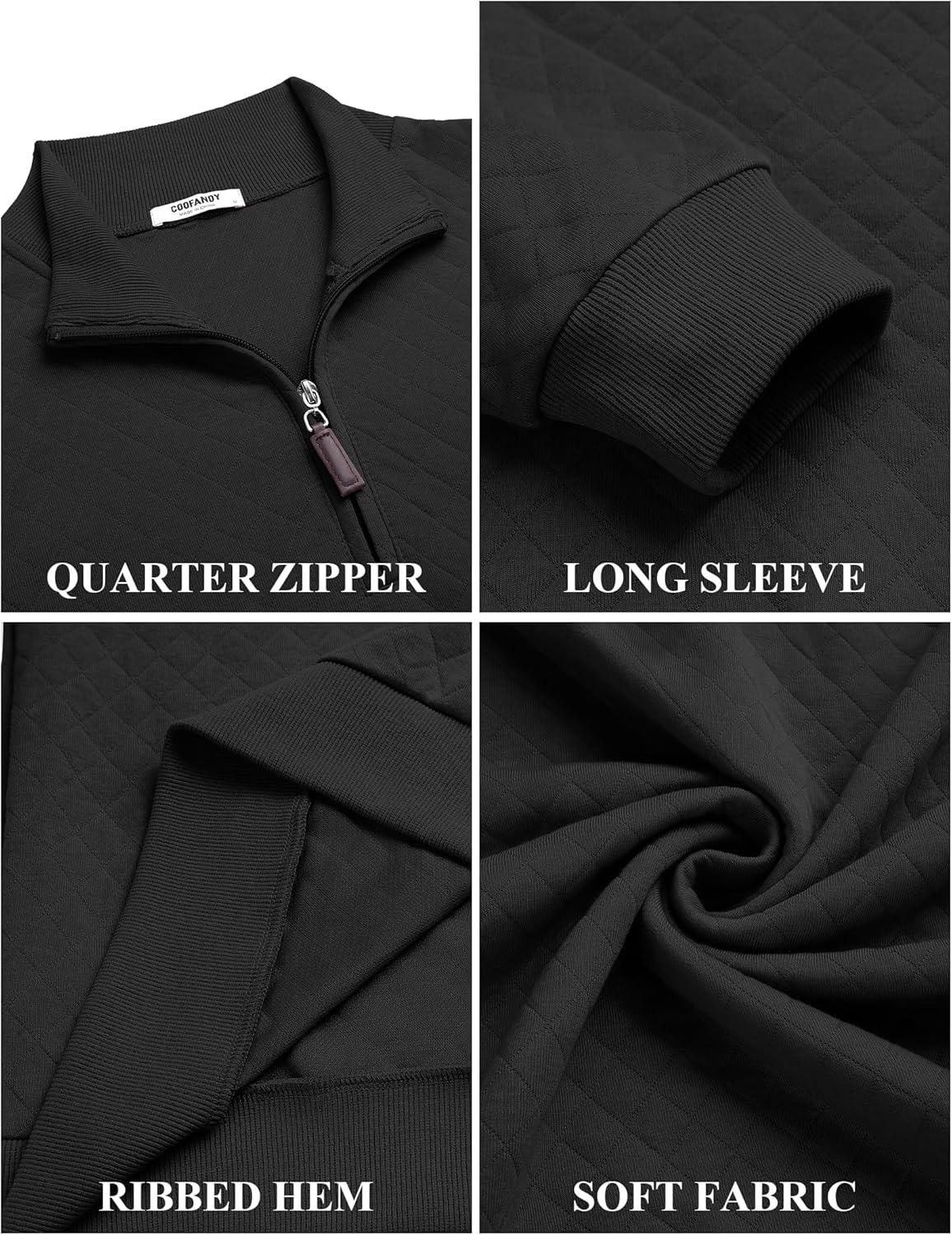 COOFANDY Men Quarter Zip Pullover Long Sleeve Quilted Sweatshirt Waffle Casual Collared Sweatshirts Mock Neck Winter Polo(Black)