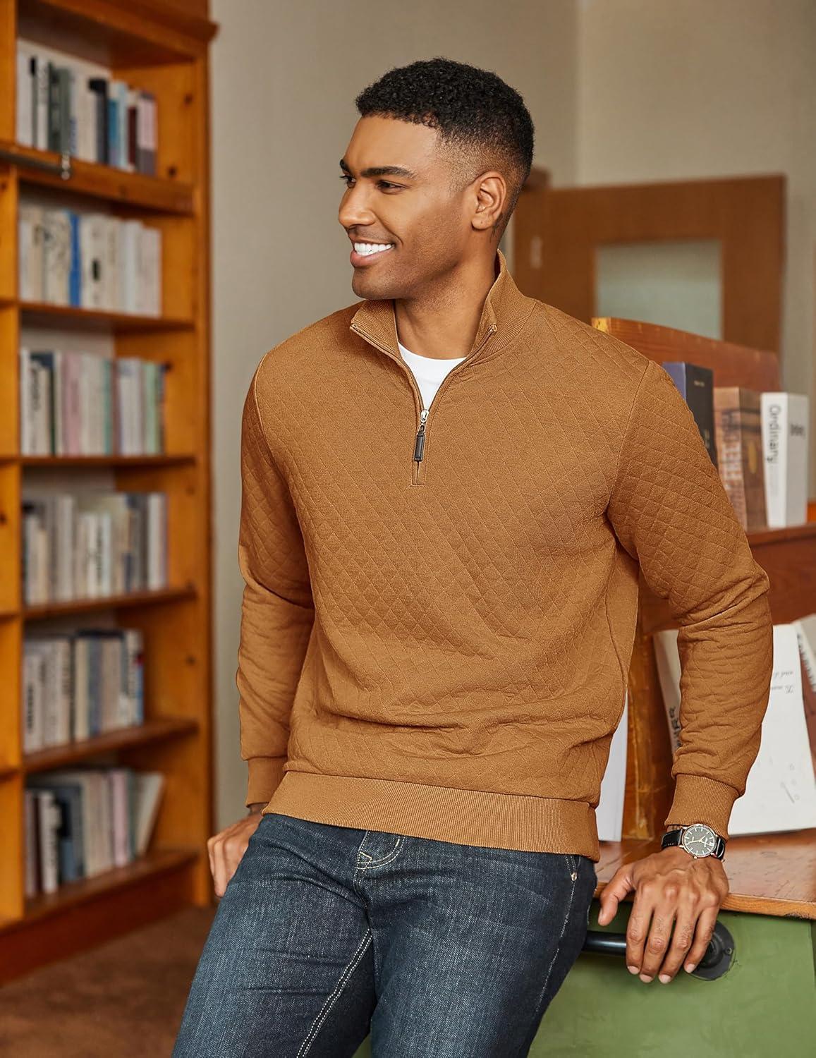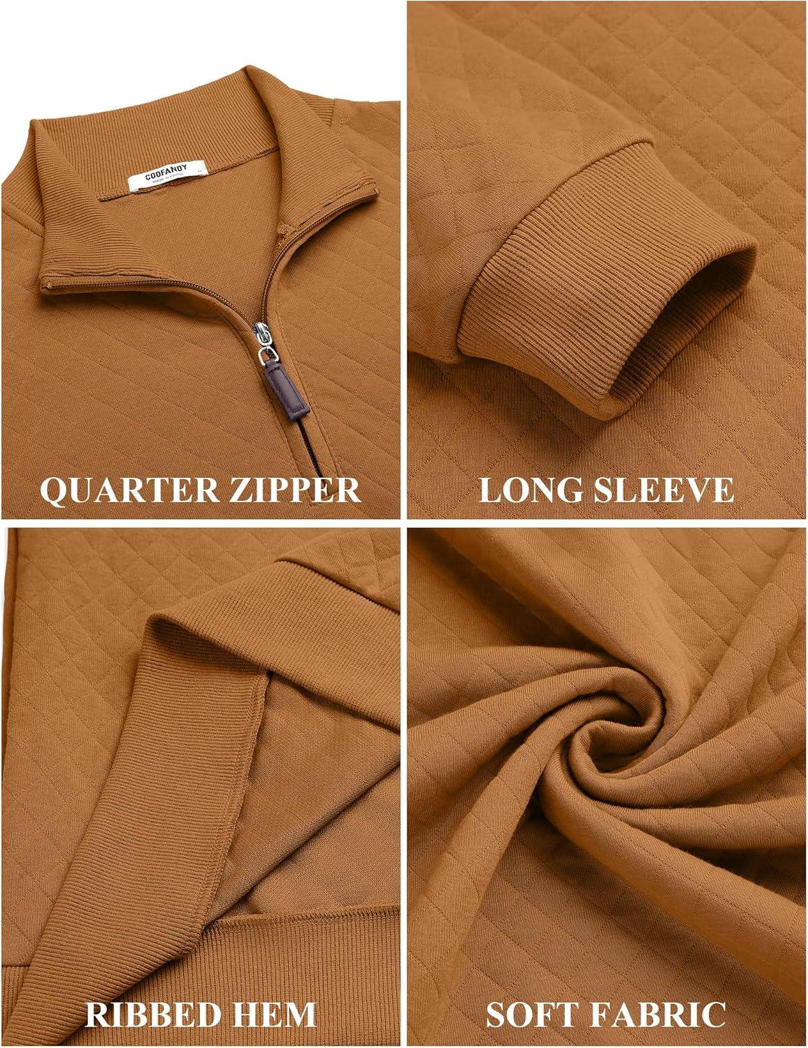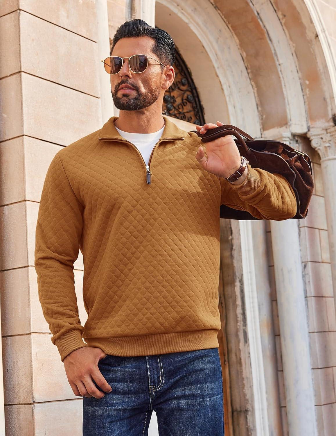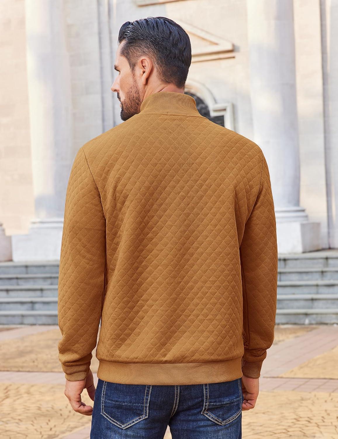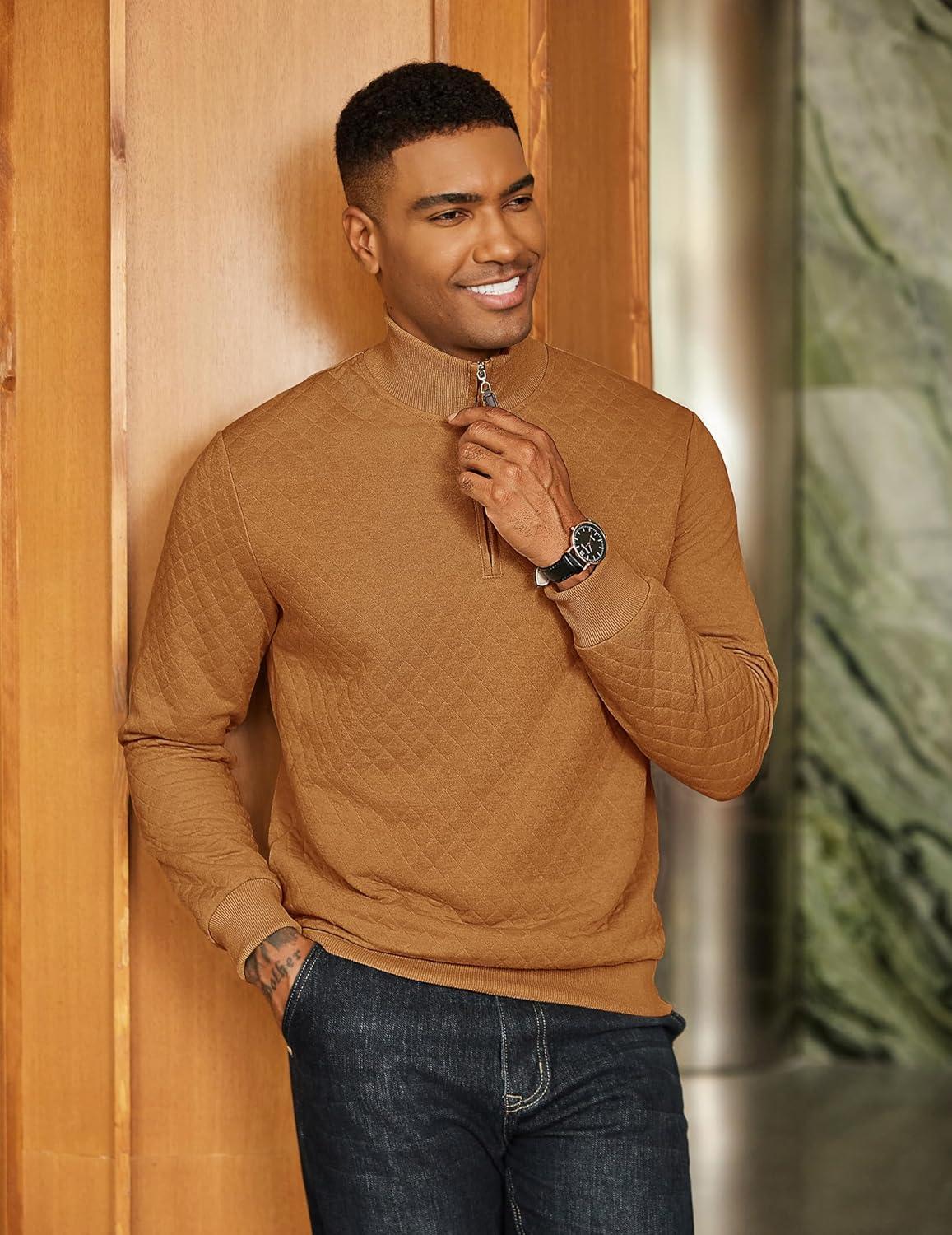 COOFANDY Men Quarter Zip Pullover Long Sleeve Quilted Sweatshirt Waffle Casual Collared Sweatshirts Mock Neck Winter Polo(Light Brown)
