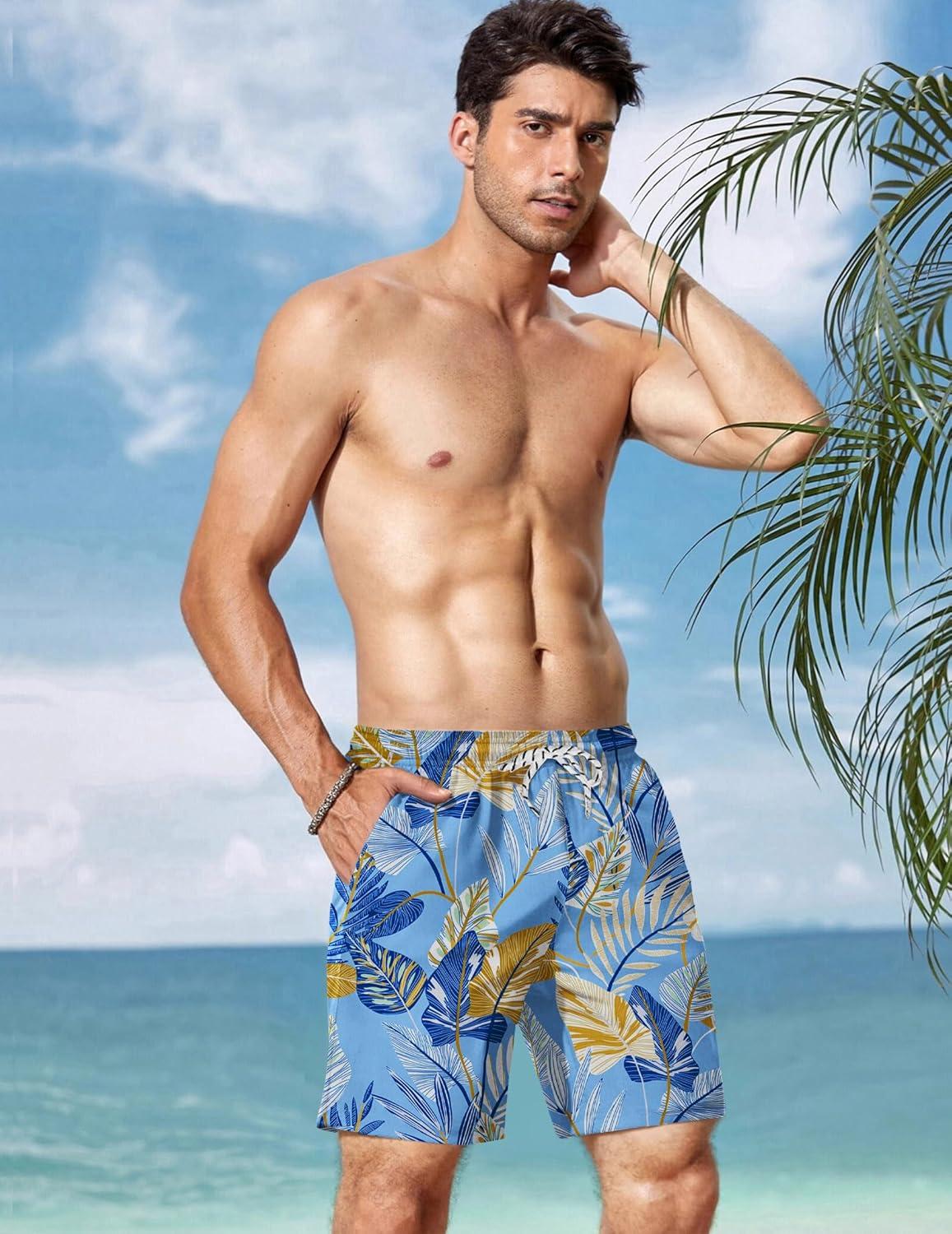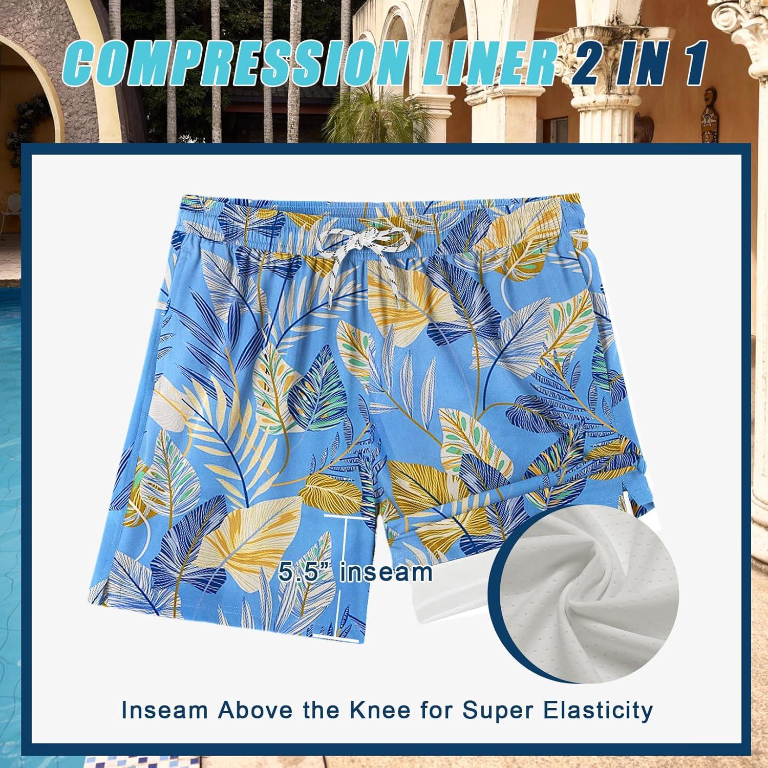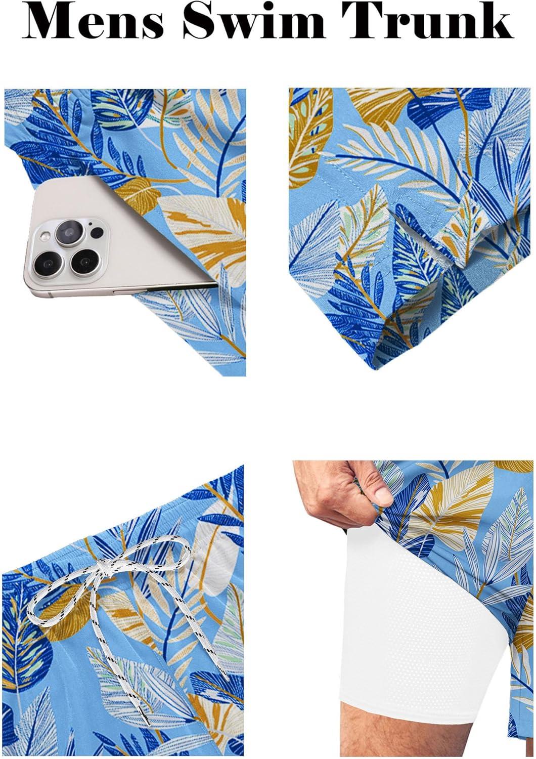 COOFANDY Men Swim Trunk with Compression Liner 2 in 1 Swimwear Bathing Suit Quick Dry Board Short(P Light Blue Leaves)