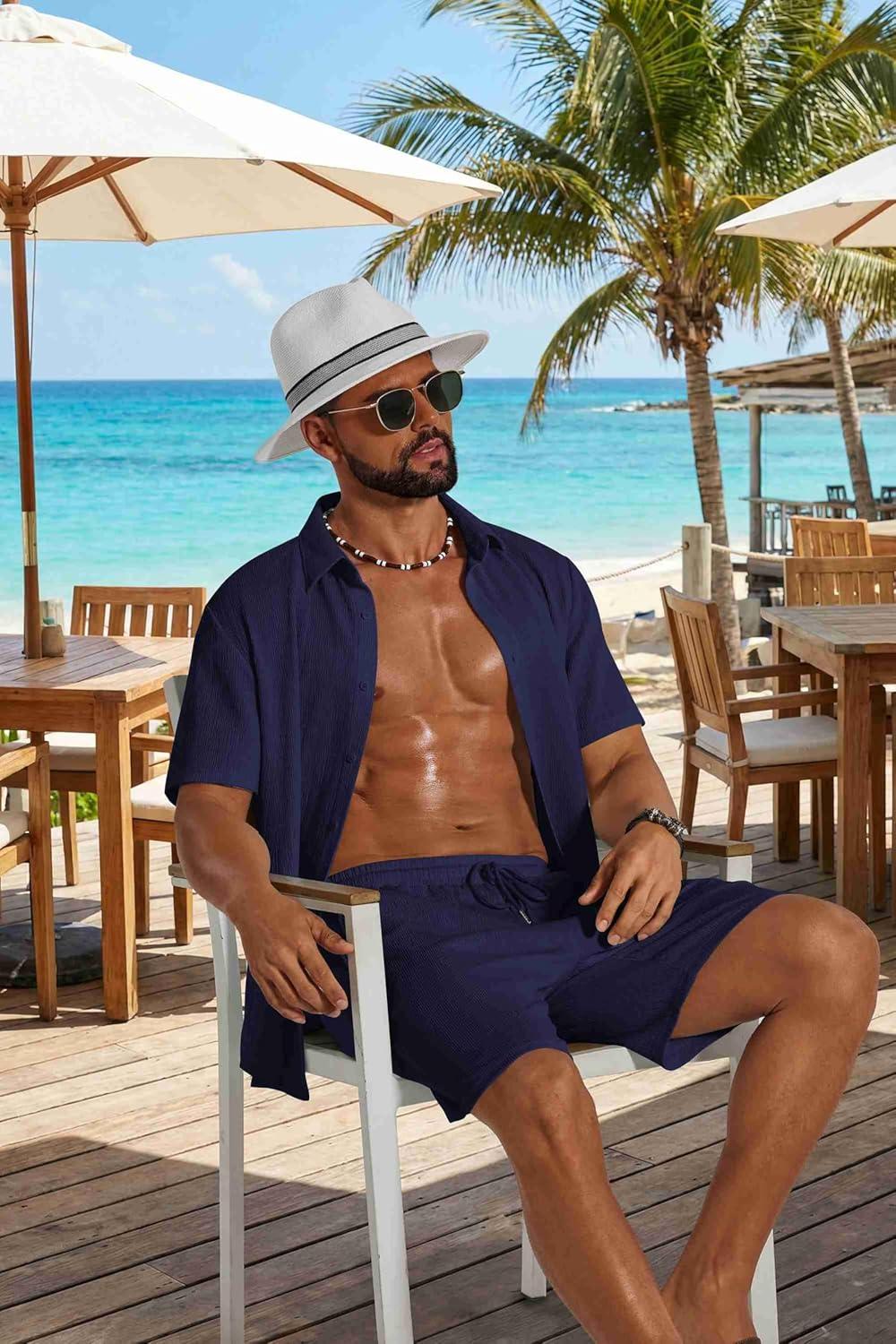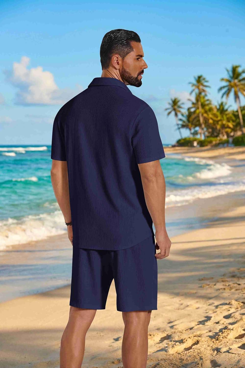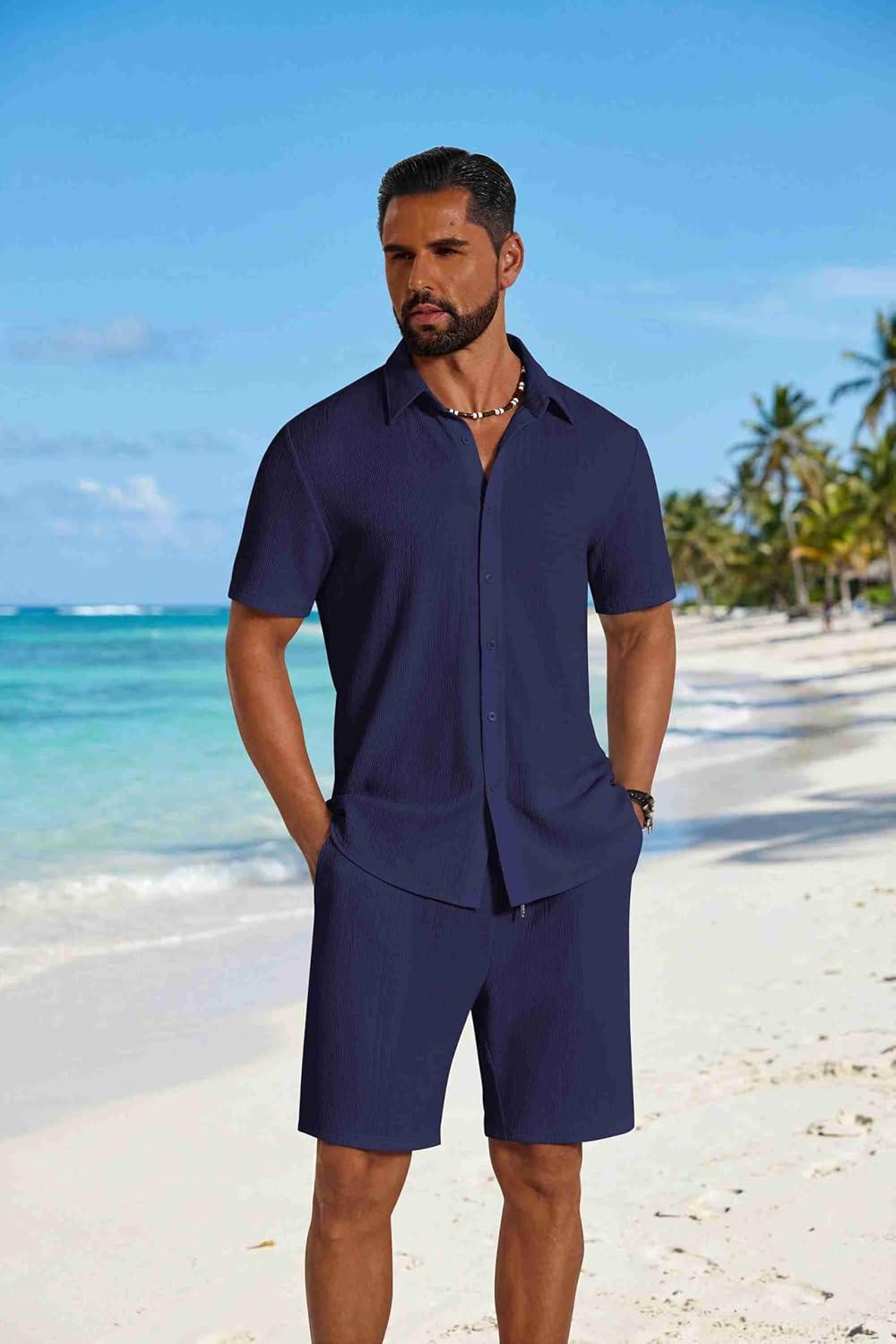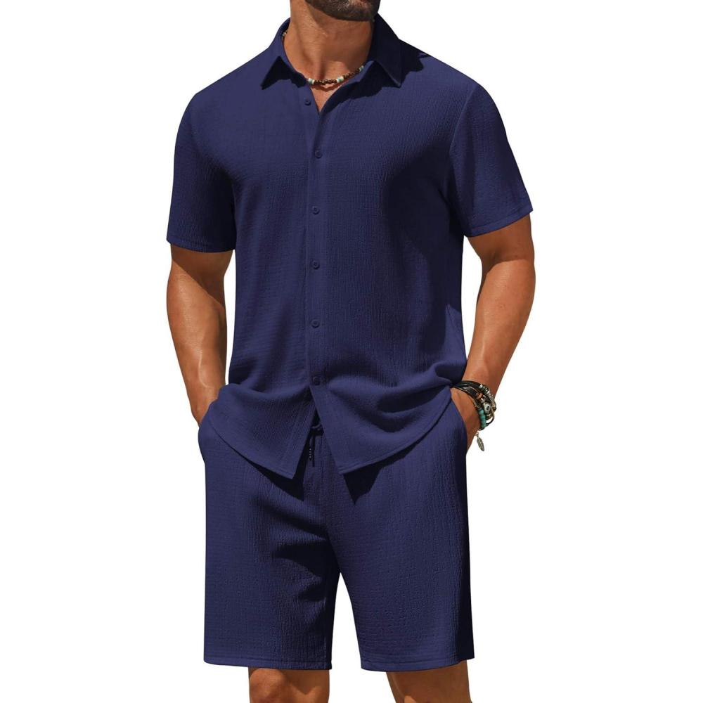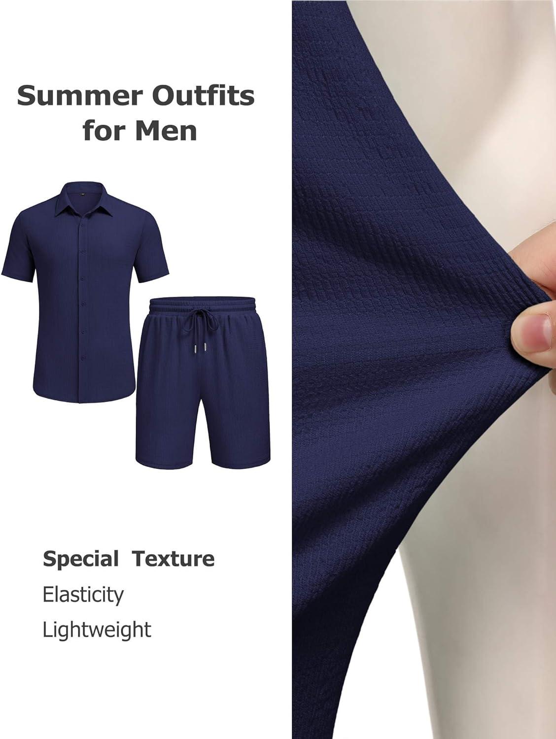COOFANDY Men’s 2 Piece Outfit Casual Short Sleeve Button Down Shirt and Beach Shorts Set Summer Vacation Outfits for Men(Navy Blue)