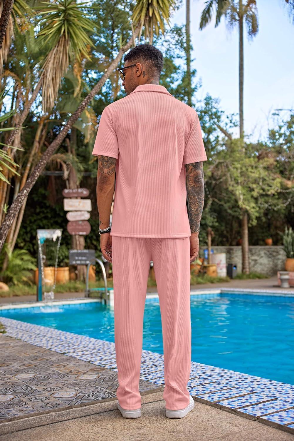 COOFANDY Men’s 2 Piece Outfit Casual Short Sleeve Button Down Shirt Beach Summer Loose Pant Sets(Pink)