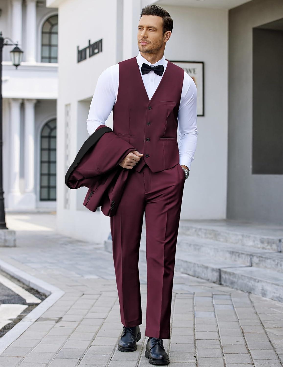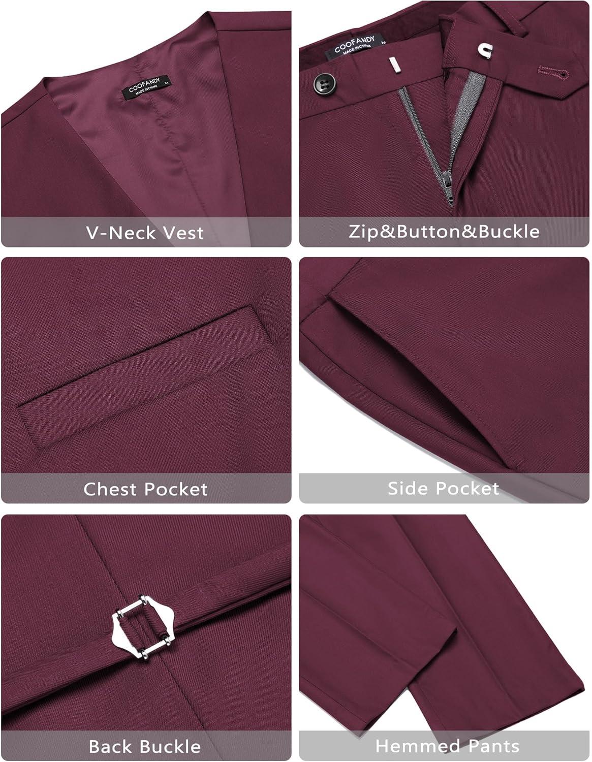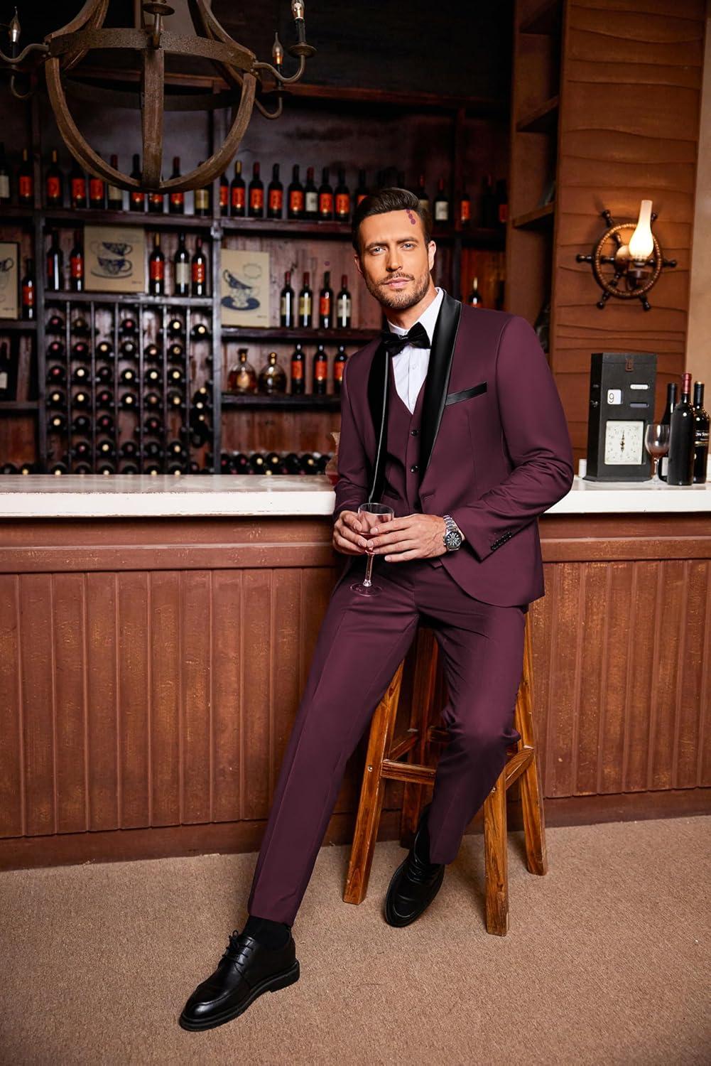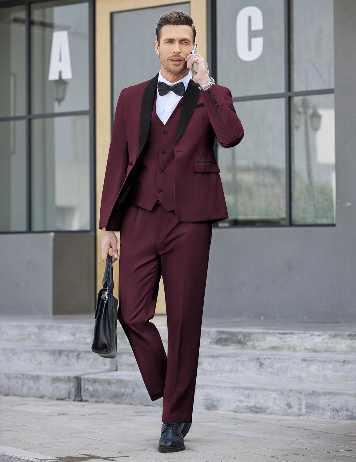 COOFANDY Men’s 3 Pieces Suit Slim Fit Tuxedo Set One Button Shawl Lapel Dinner Prom Jacket Vest Pants with Tie(Burgundy/Black)