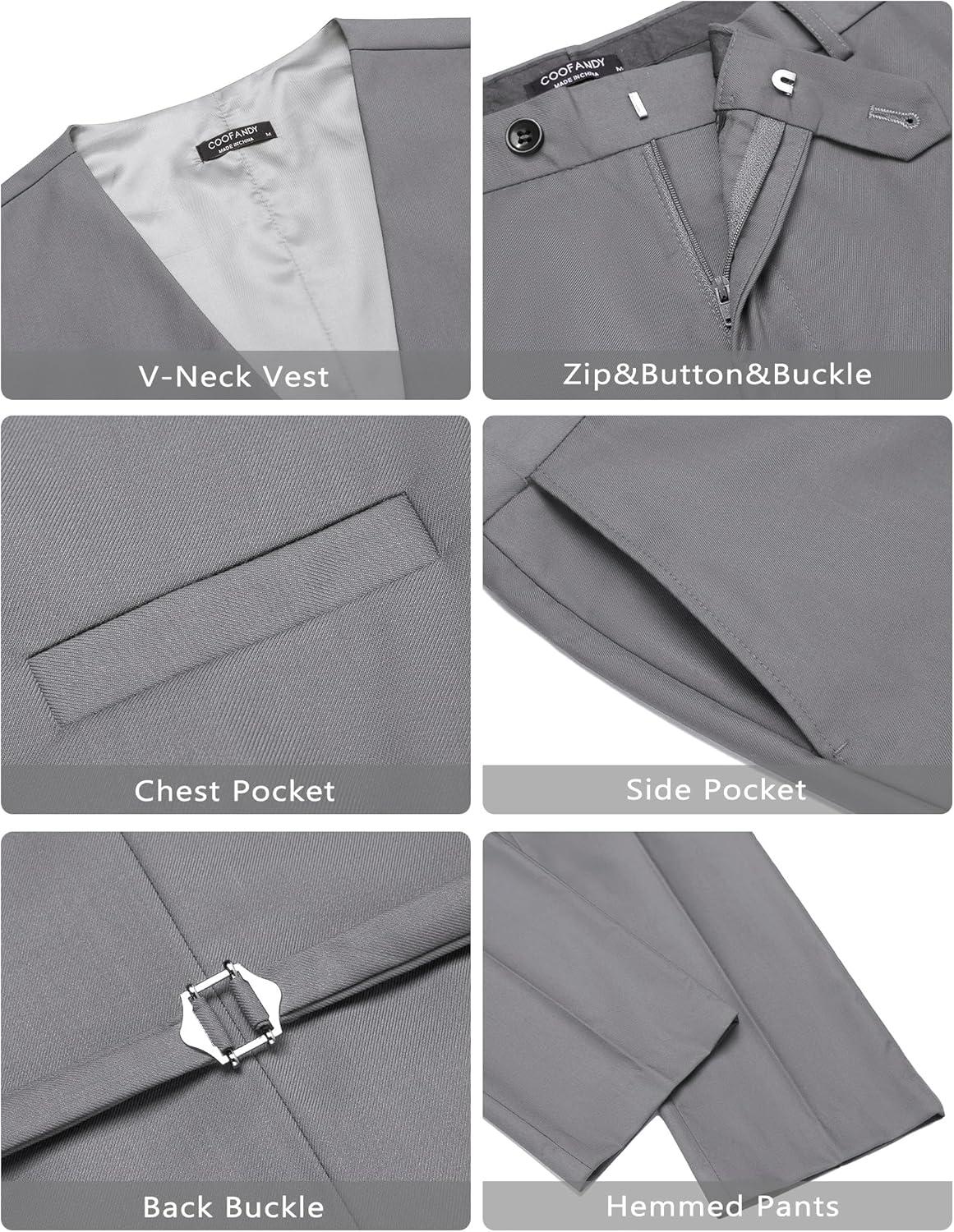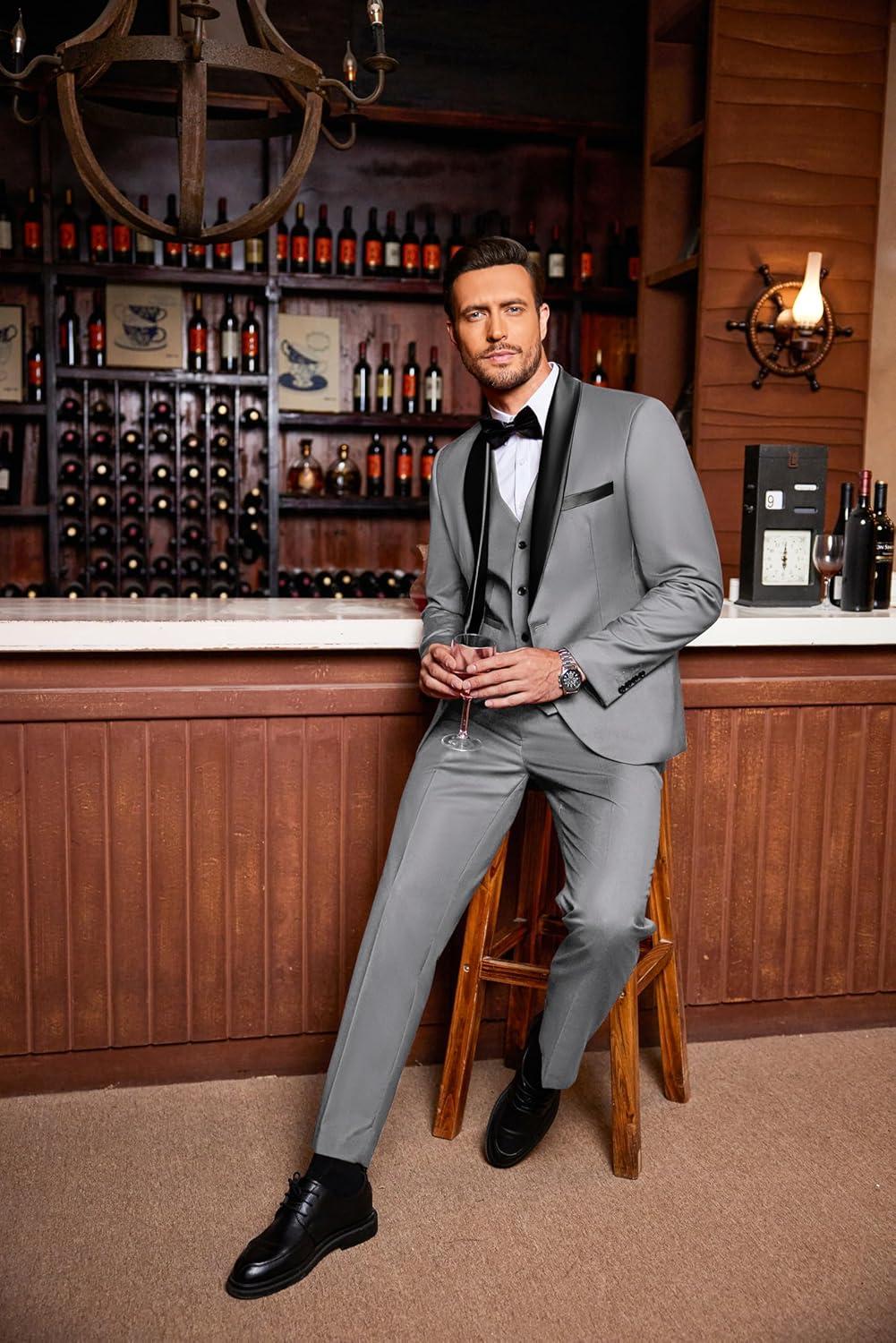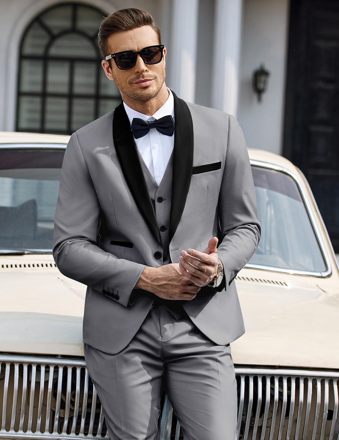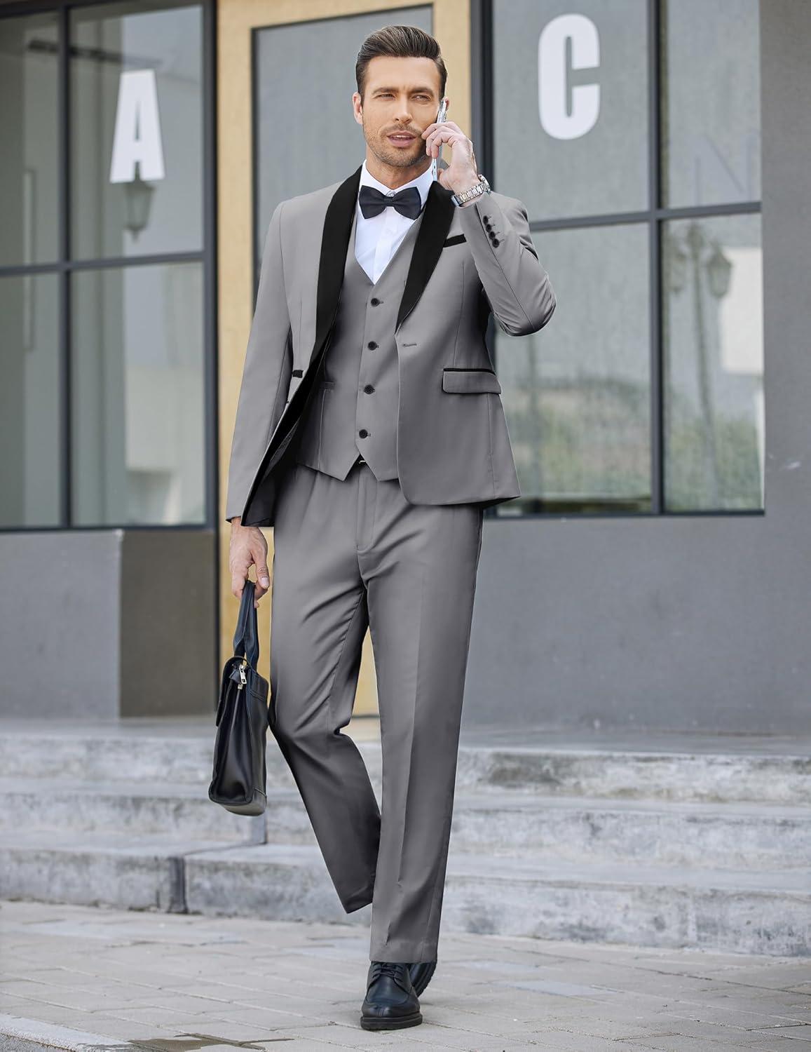 COOFANDY Men’s 3 Pieces Suit Slim Fit Tuxedo Set One Button Shawl Lapel Dinner Prom Jacket Vest Pants with Tie(Lgrey/Black)