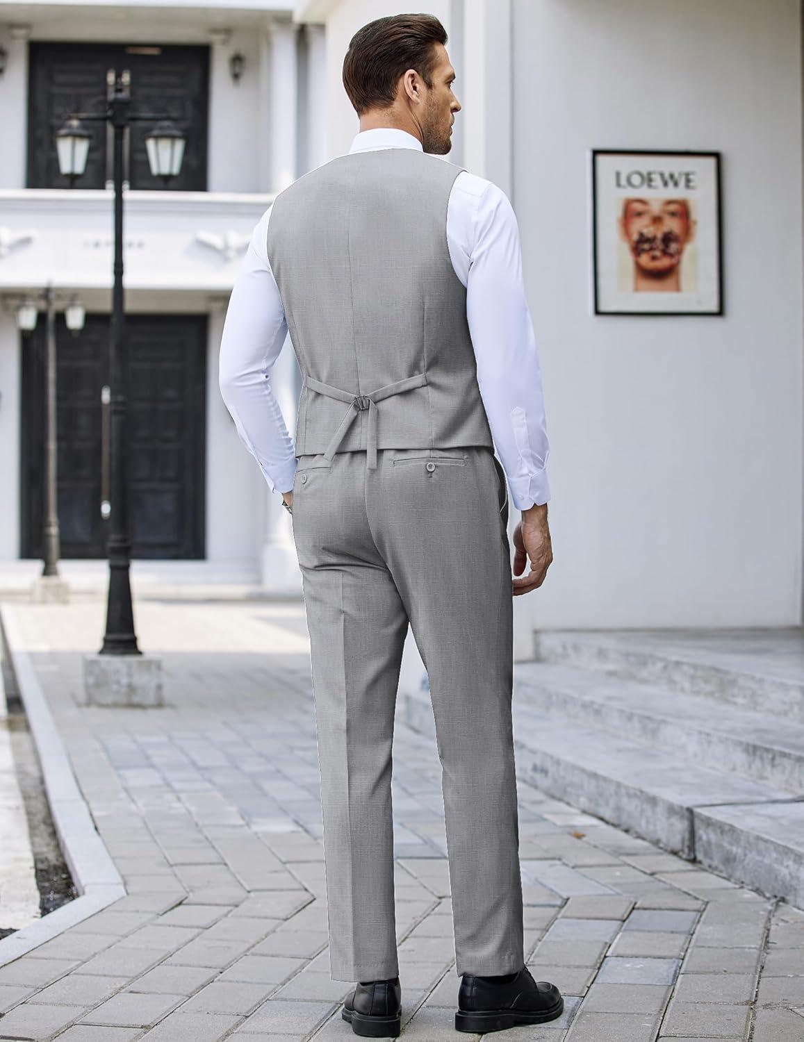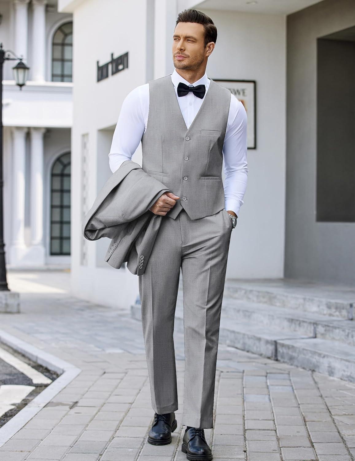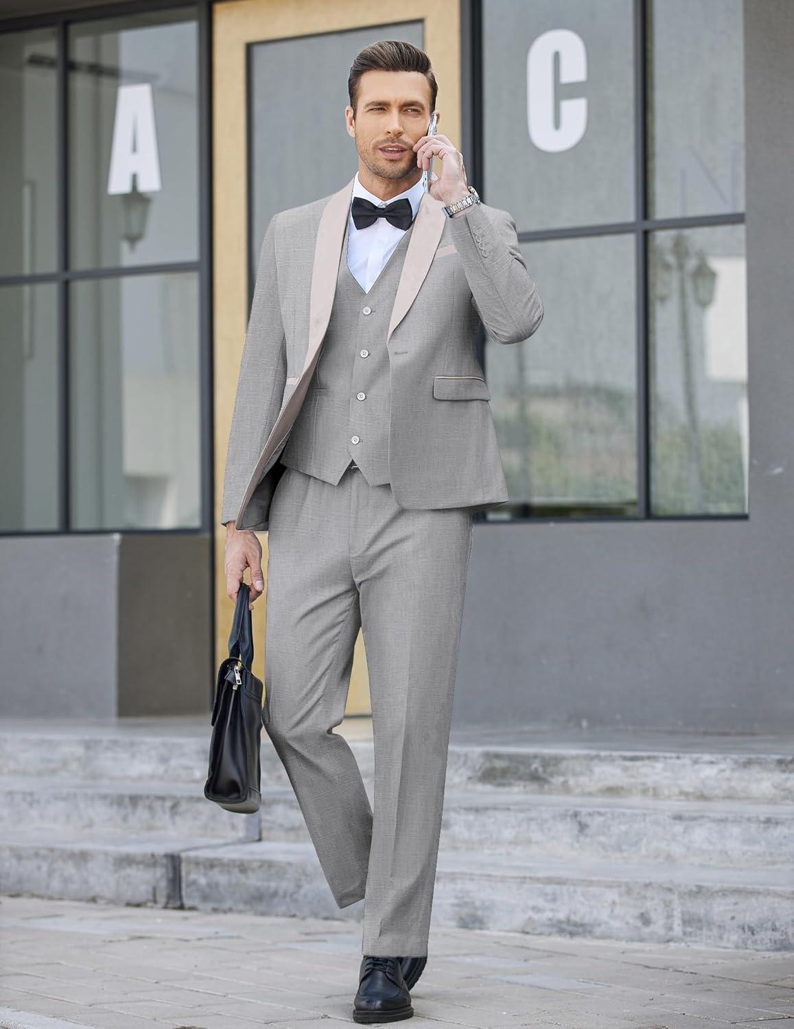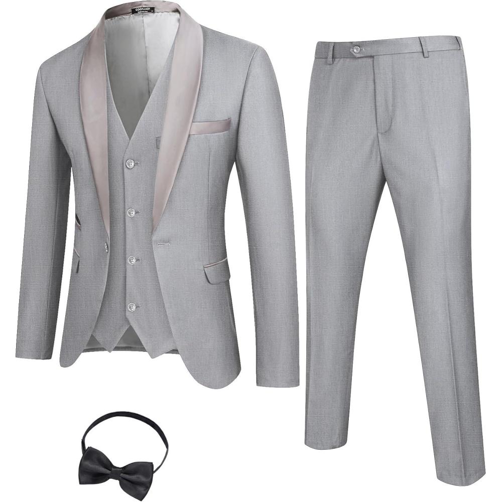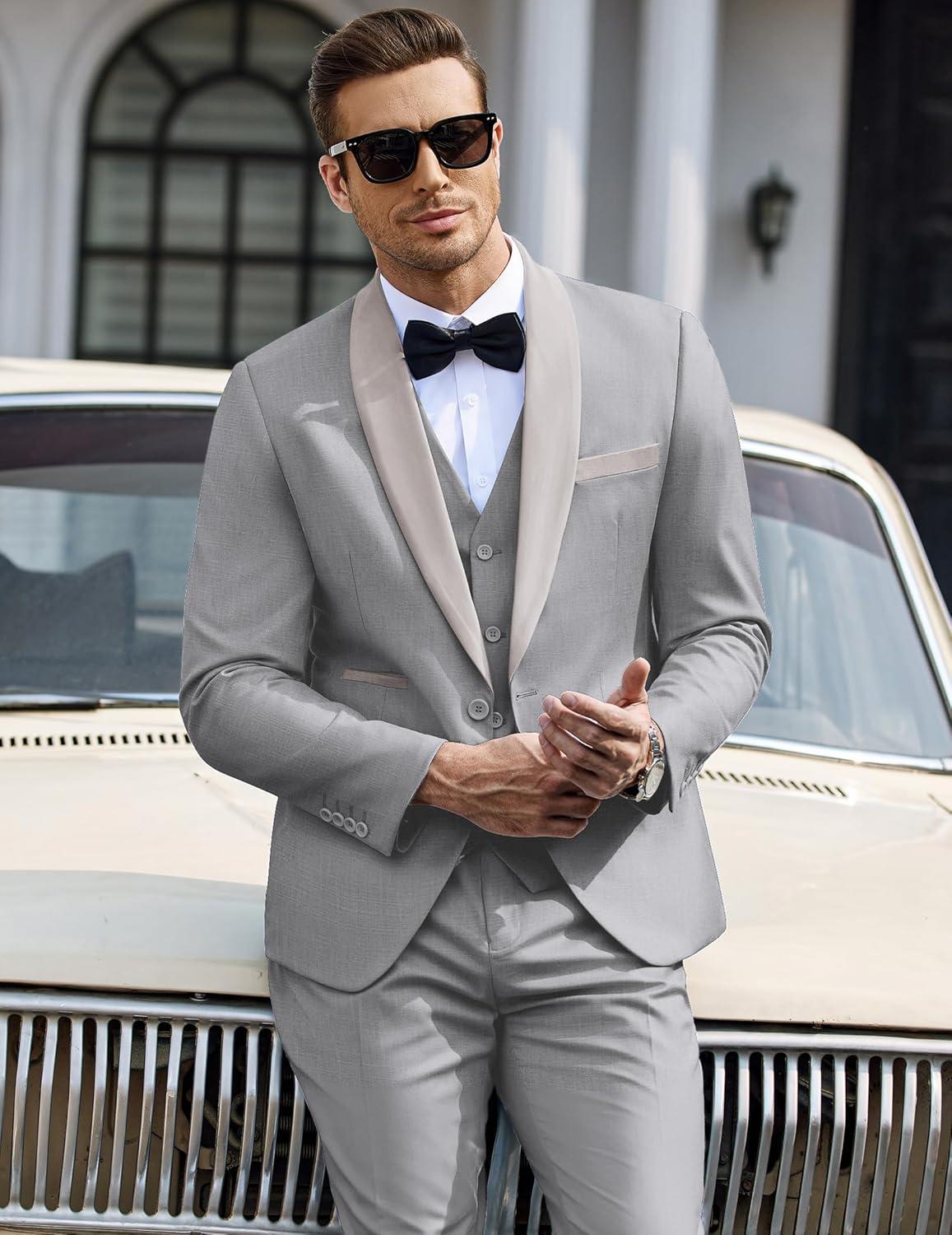 COOFANDY Men’s 3 Pieces Suit Slim Fit Tuxedo Set One Button Shawl Lapel Dinner Prom Jacket Vest Pants with Tie(Light Grey)