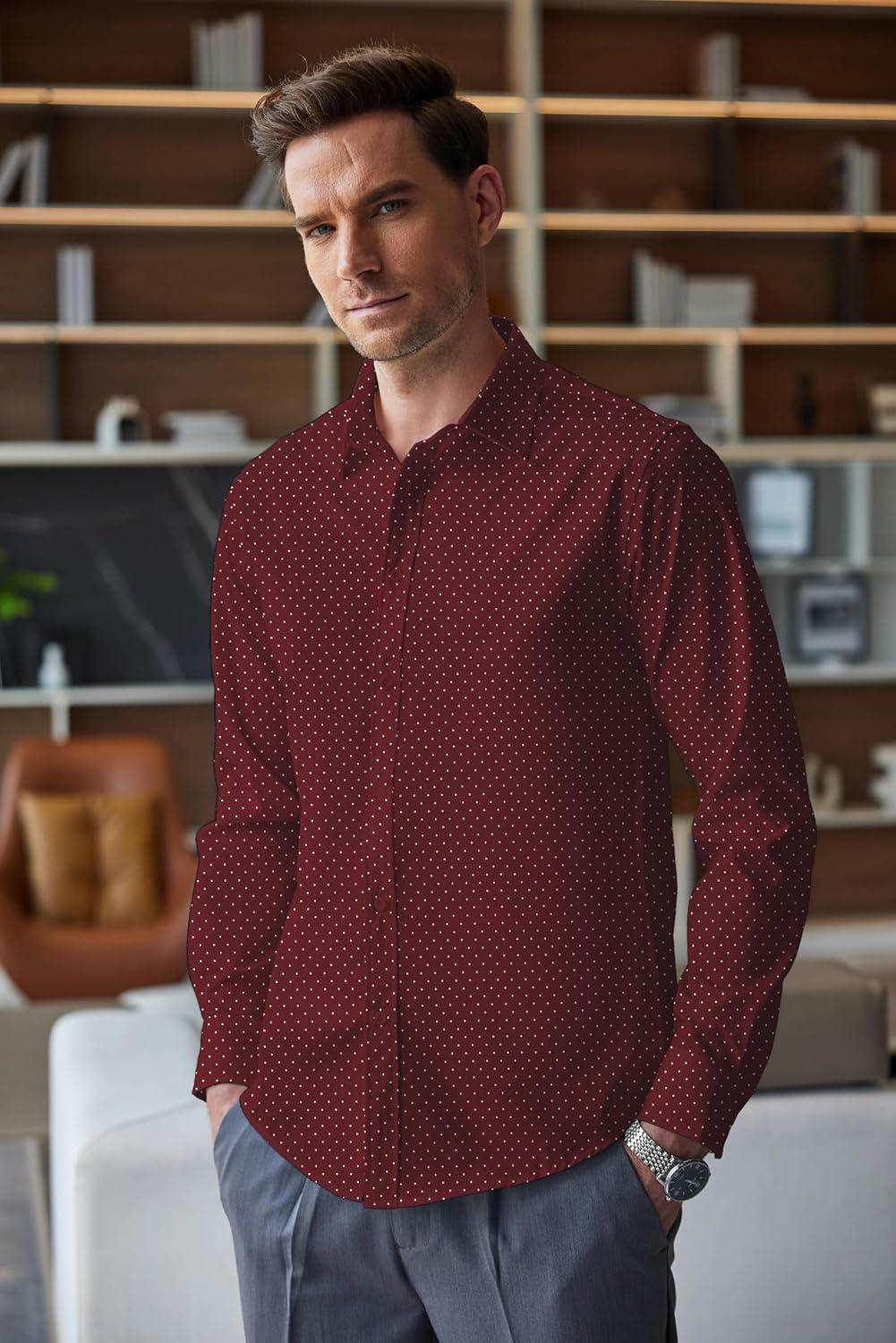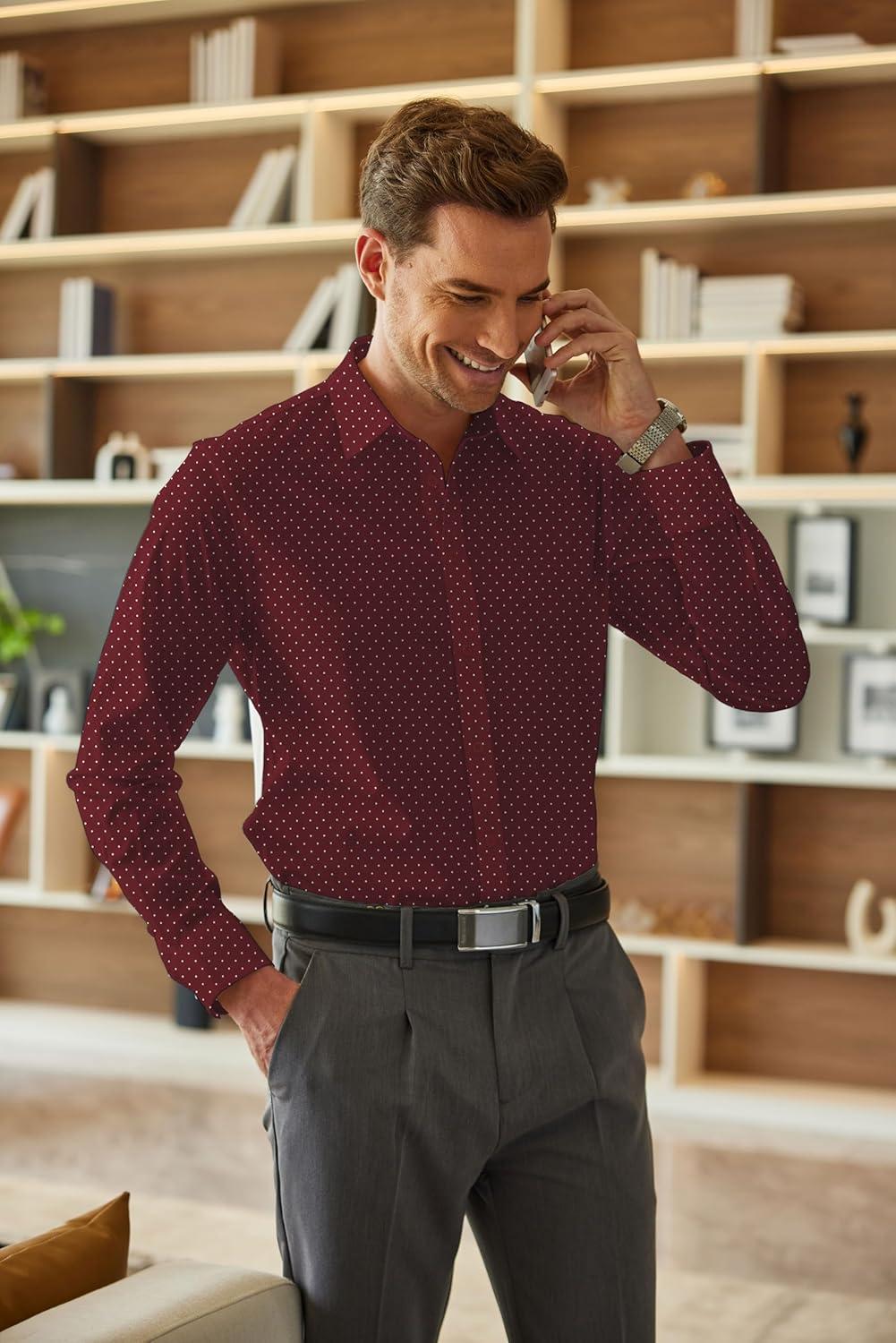 COOFANDY Men’s Business Dress Shirts Wrinkle Free Long Sleeve Regular Fit Dress Shirt Textured Casual Button Down Shirts(Wine Red White Polka Dots)