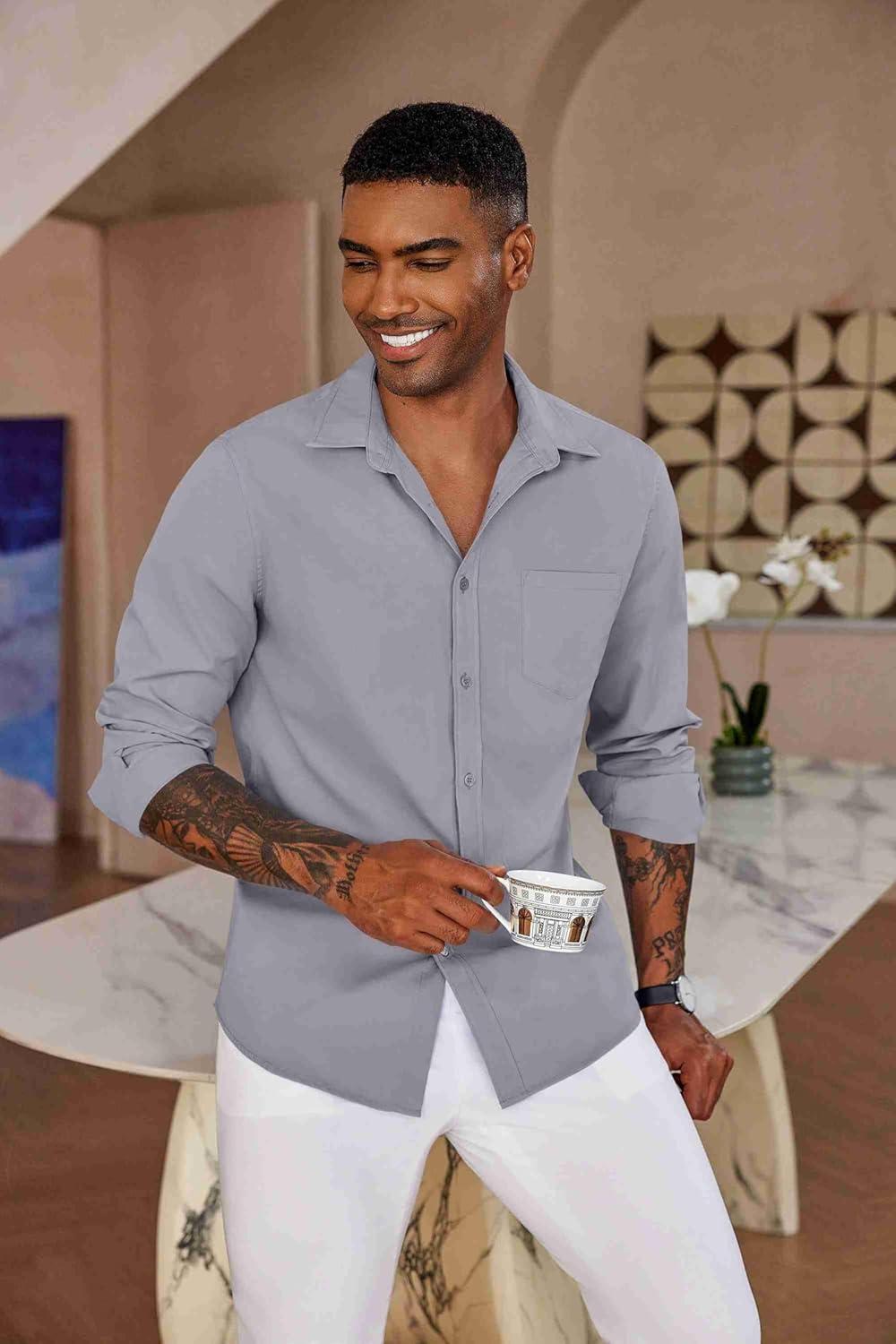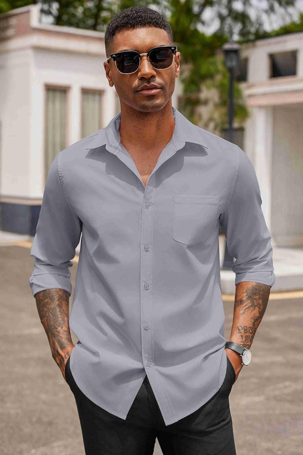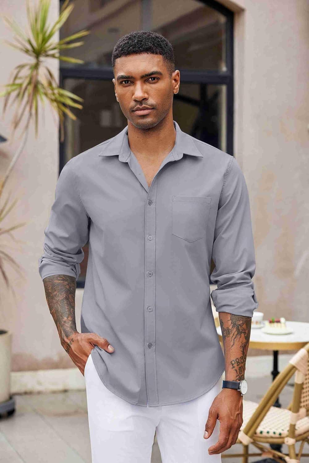 COOFANDY Men’s Button Down Long Sleeve Shirt Casual Untucked Dress Shirt Regular Fit Wedding Shirts(Quiet Gray)
