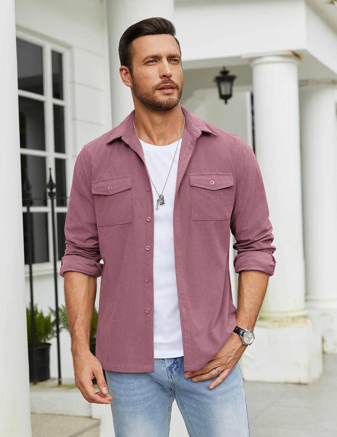 COOFANDY Men’s Button Down Waffle Shirt Jacket Casual Long Sleeve Shacket Lightweight Overshirts with Flap Pockets(Gray Purple)