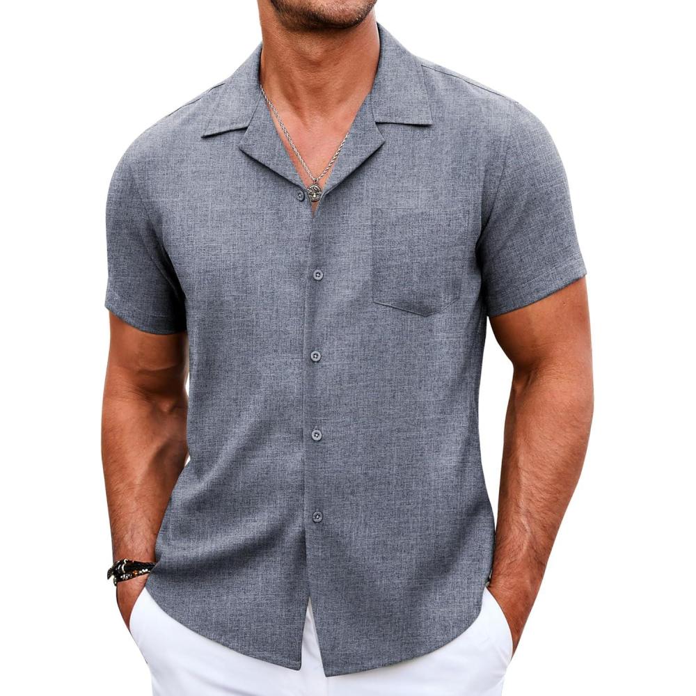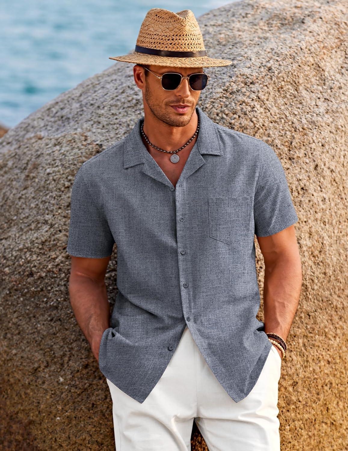 COOFANDY Men’s Casual Button Down Shirts Short Sleeve Summer Beach Shirt Cuban Vacation Textured Shirts with Pocket(Grey Blue)