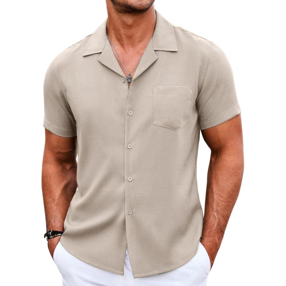 COOFANDY Men’s Casual Button Down Shirts Short Sleeve Summer Beach Shirt Cuban Vacation Textured Shirts with Pocket(Beige)