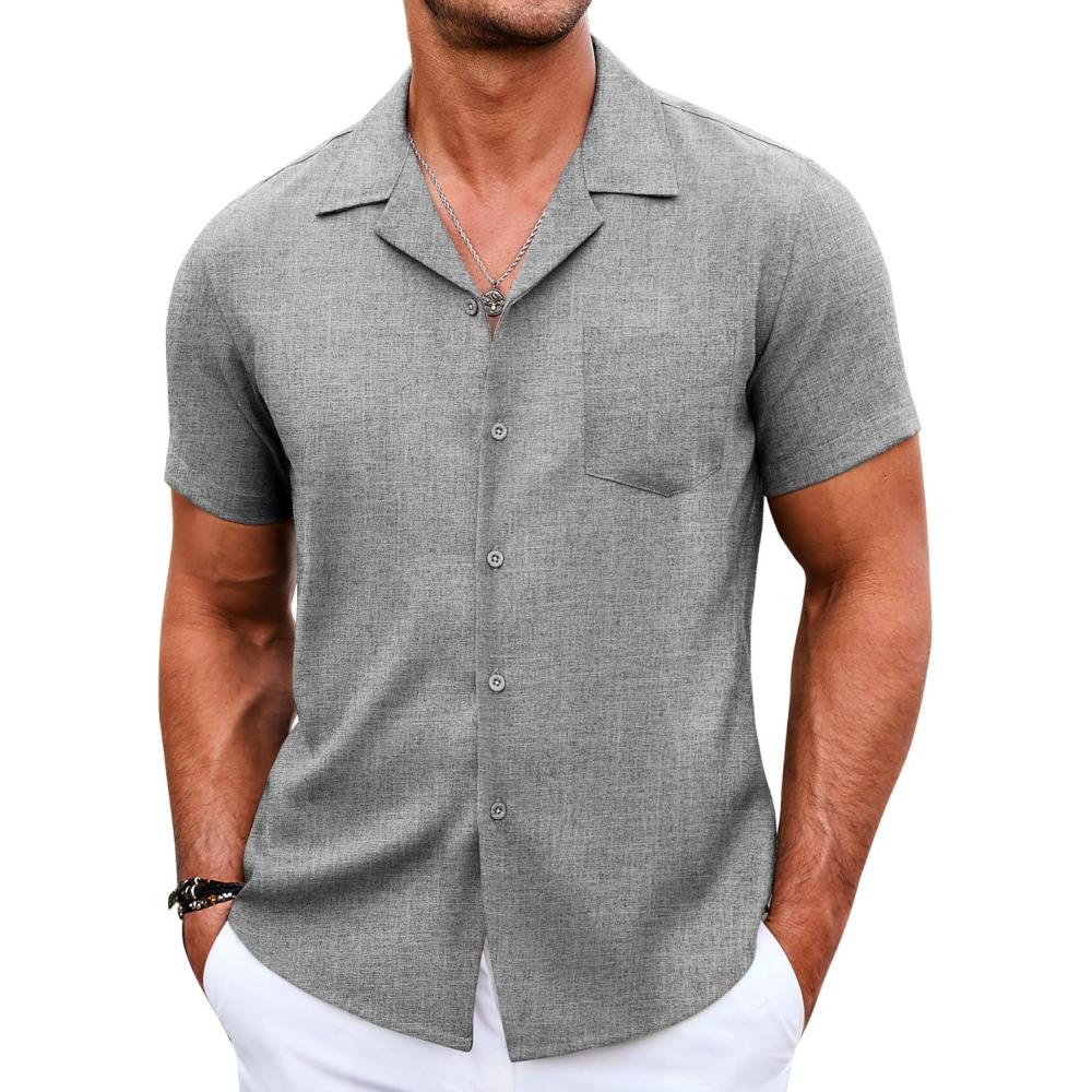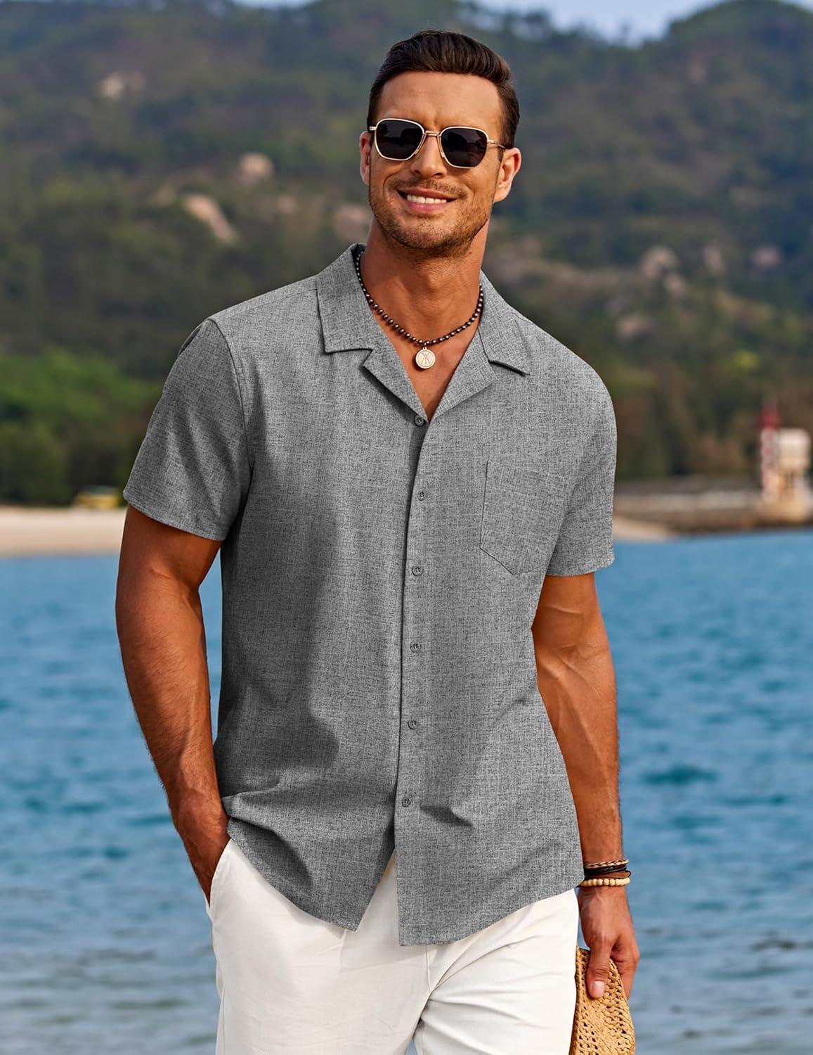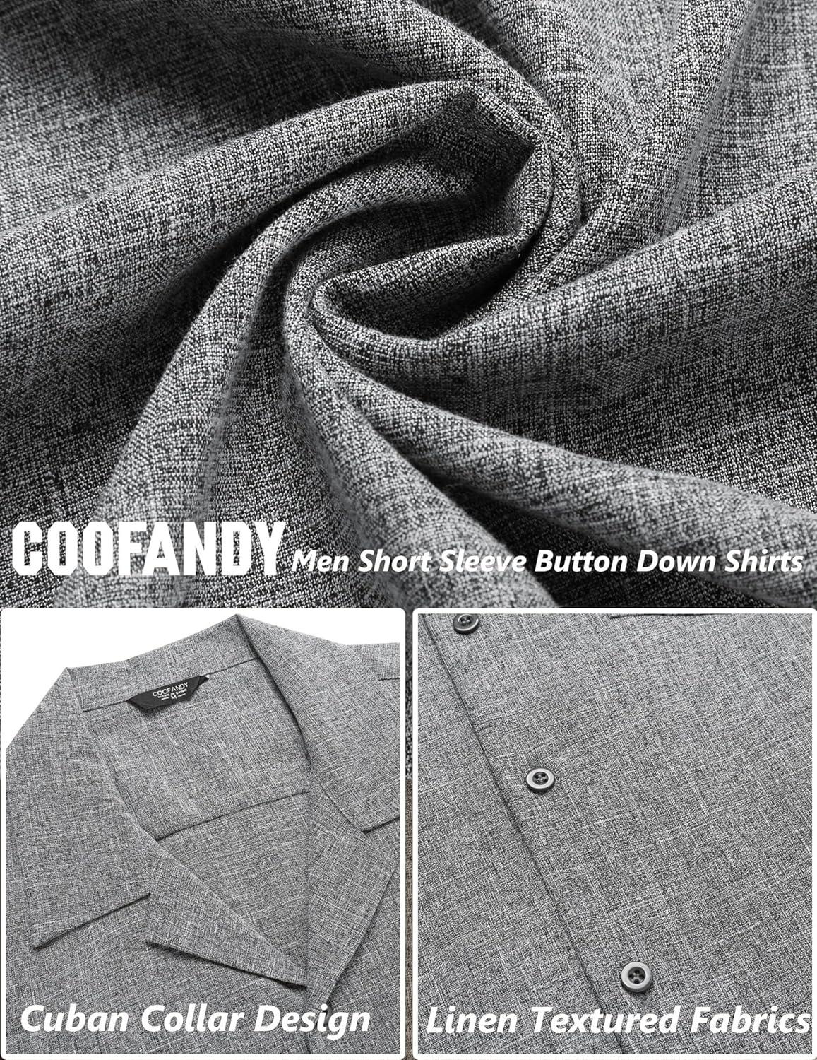 COOFANDY Men’s Casual Button Down Shirts Short Sleeve Summer Beach Shirt Cuban Vacation Textured Shirts with Pocket(Light Grey)