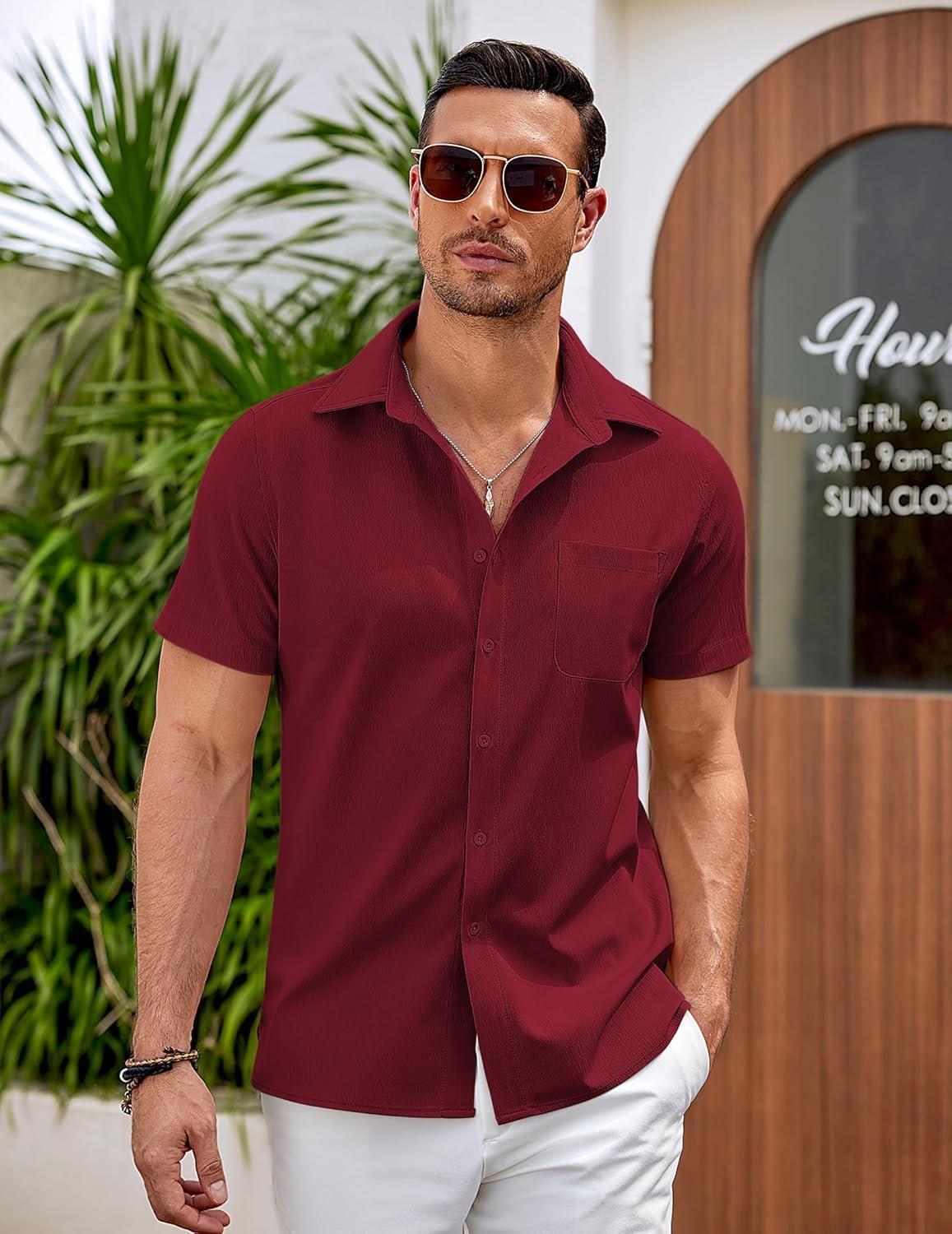 COOFANDY Mens Casual Button Down Shirts Short Sleeve Summer Beach Vacation Shirts(Dark Red)