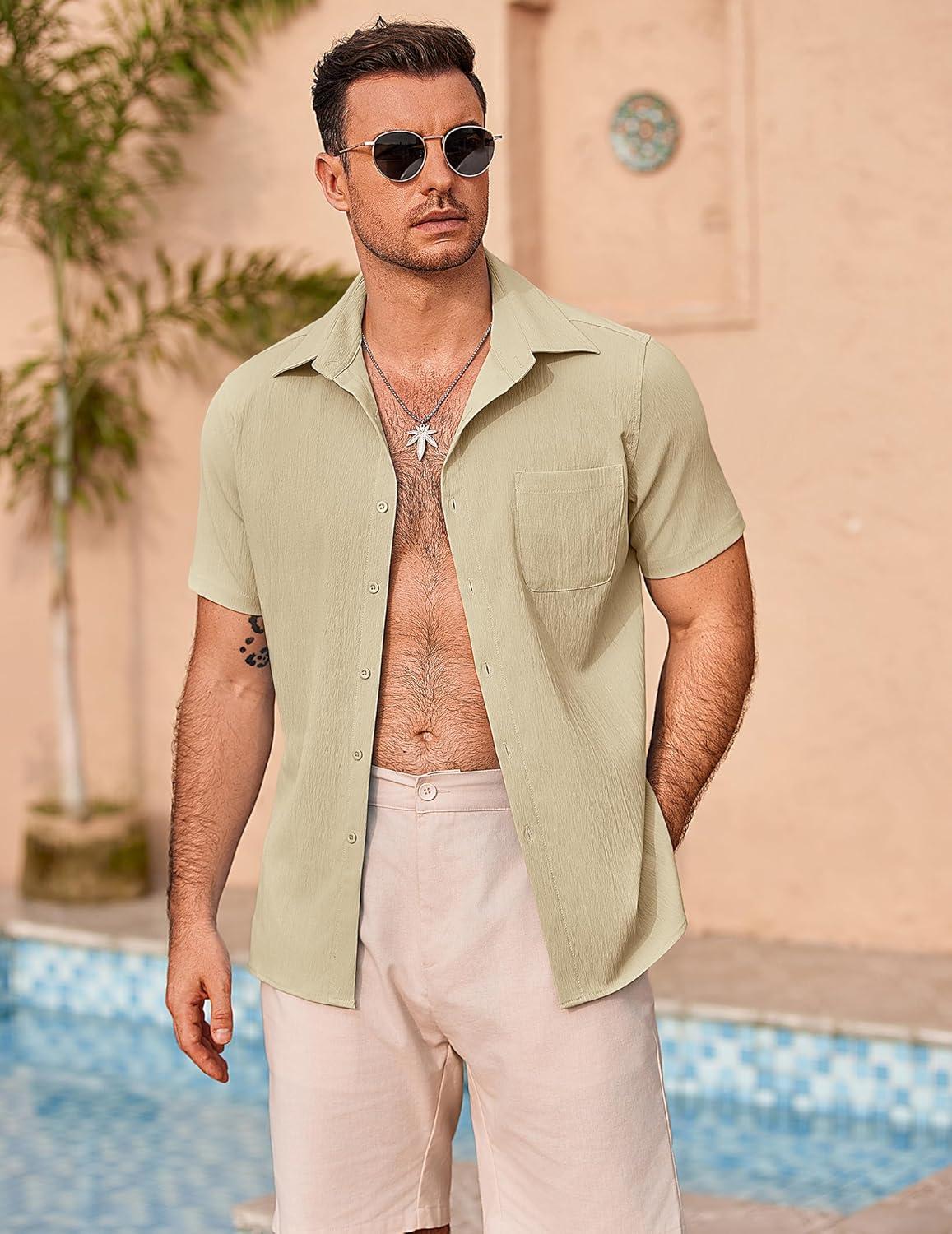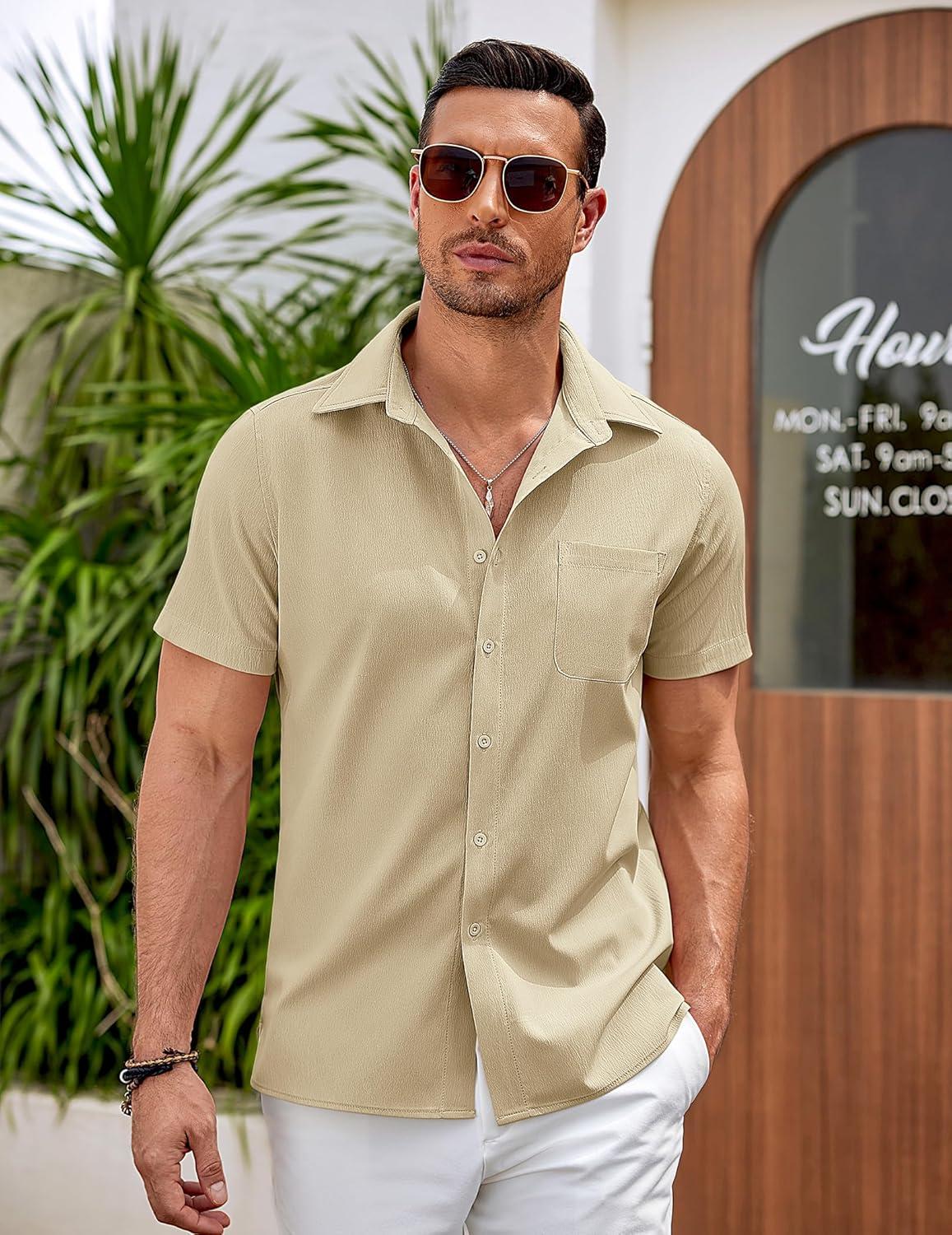 COOFANDY Mens Casual Button Down Shirts Short Sleeve Summer Beach Vacation Shirts(Beige)