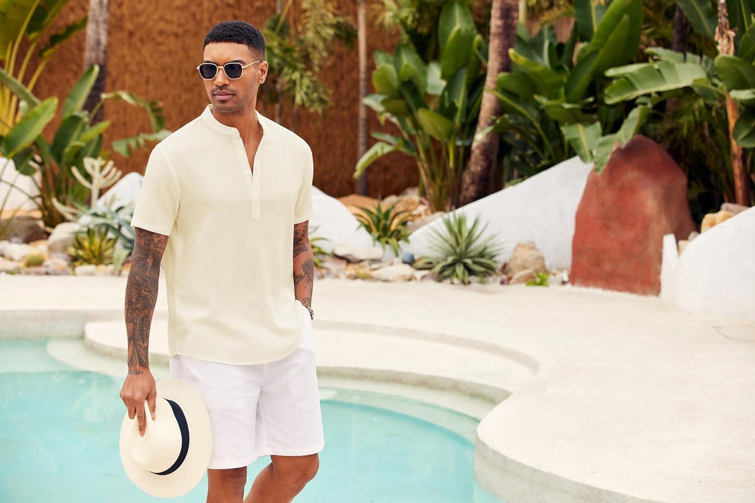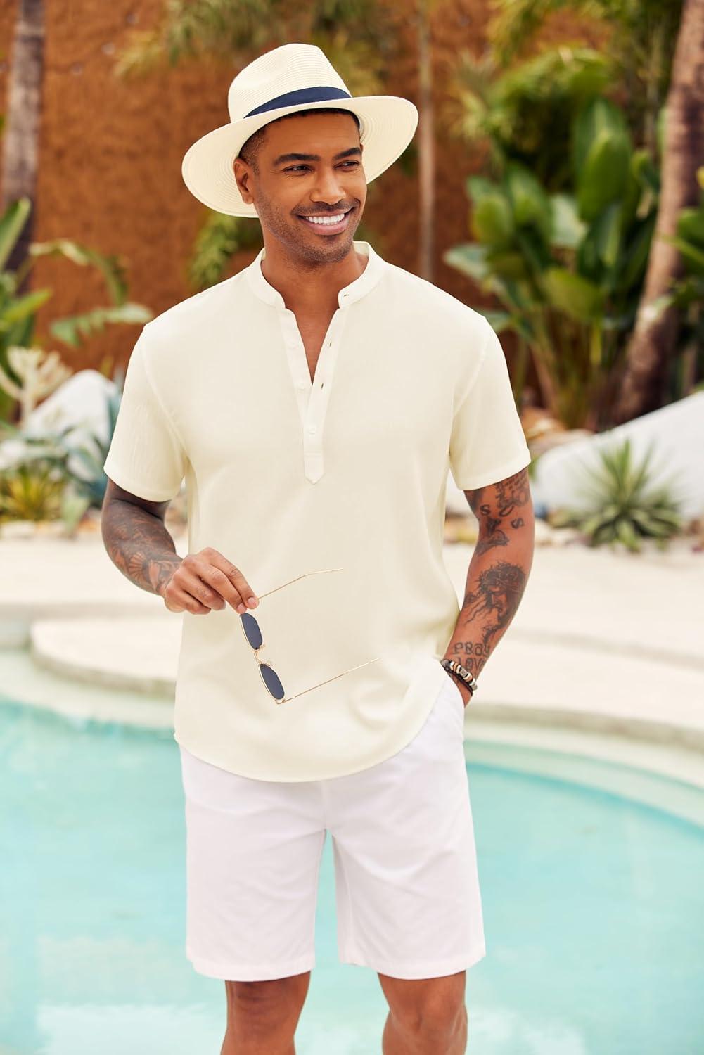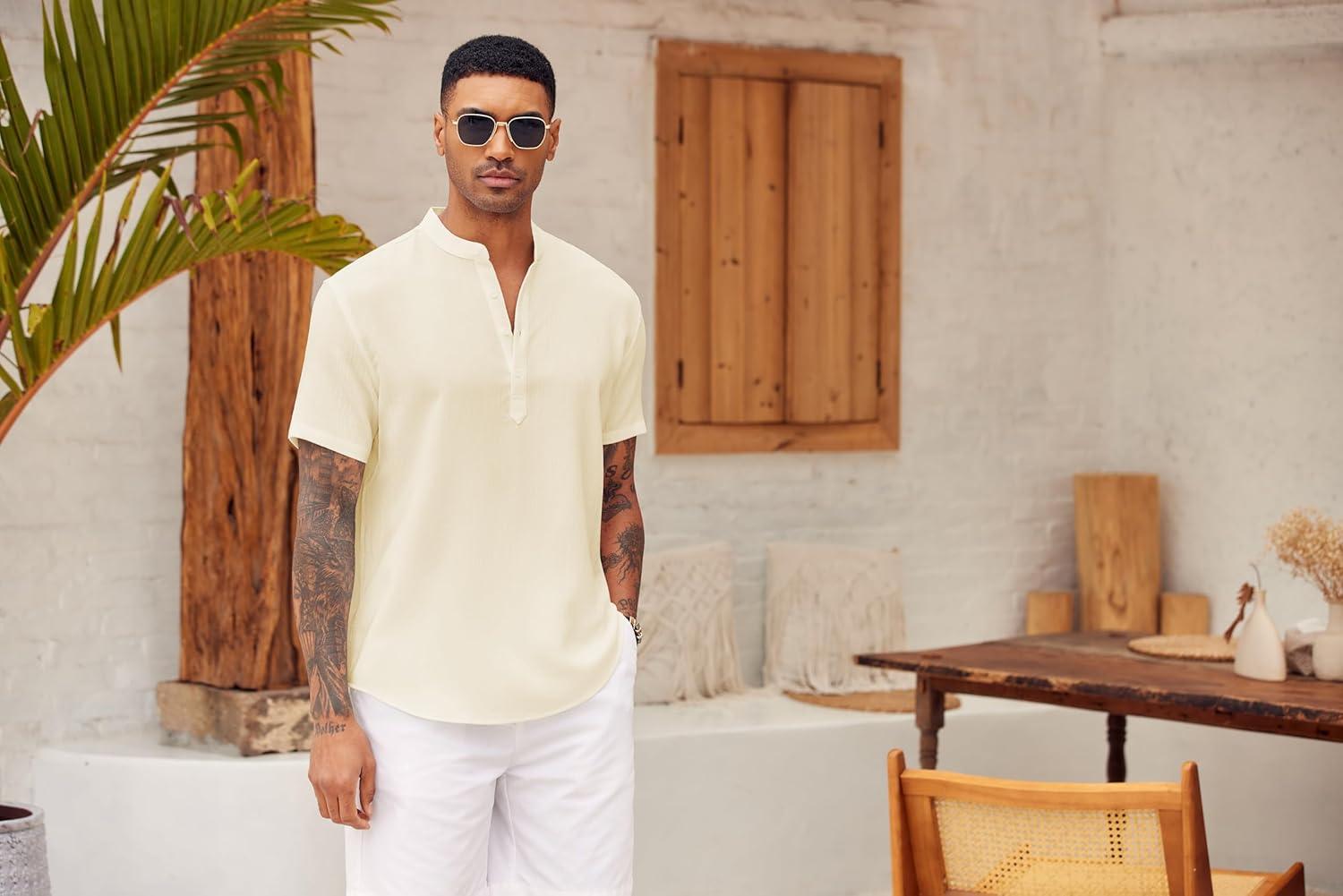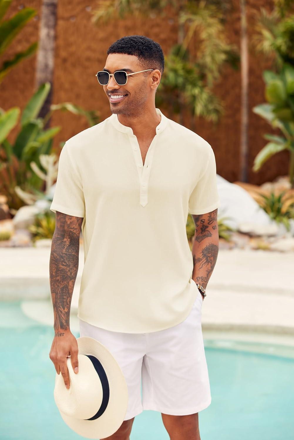 Score big on COOFANDY Men’s Casual Henley Shirt Short Sleeve Summer Shirts Linen Band Collar Summer Beach Hippie T-Shirts(Beige) and accessories during our BOGO sale. Buy one, get one 50% off!