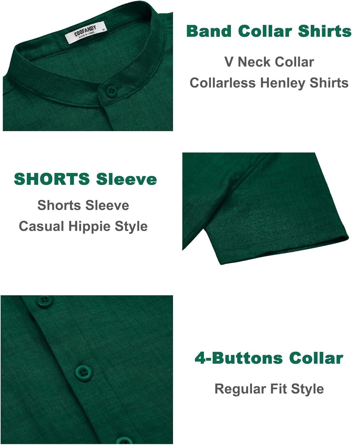 COOFANDY Men’s Casual Henley Shirt Short Sleeve Summer Shirts Linen Band Collar Summer Beach Hippie T-Shirts(Dark Green)
