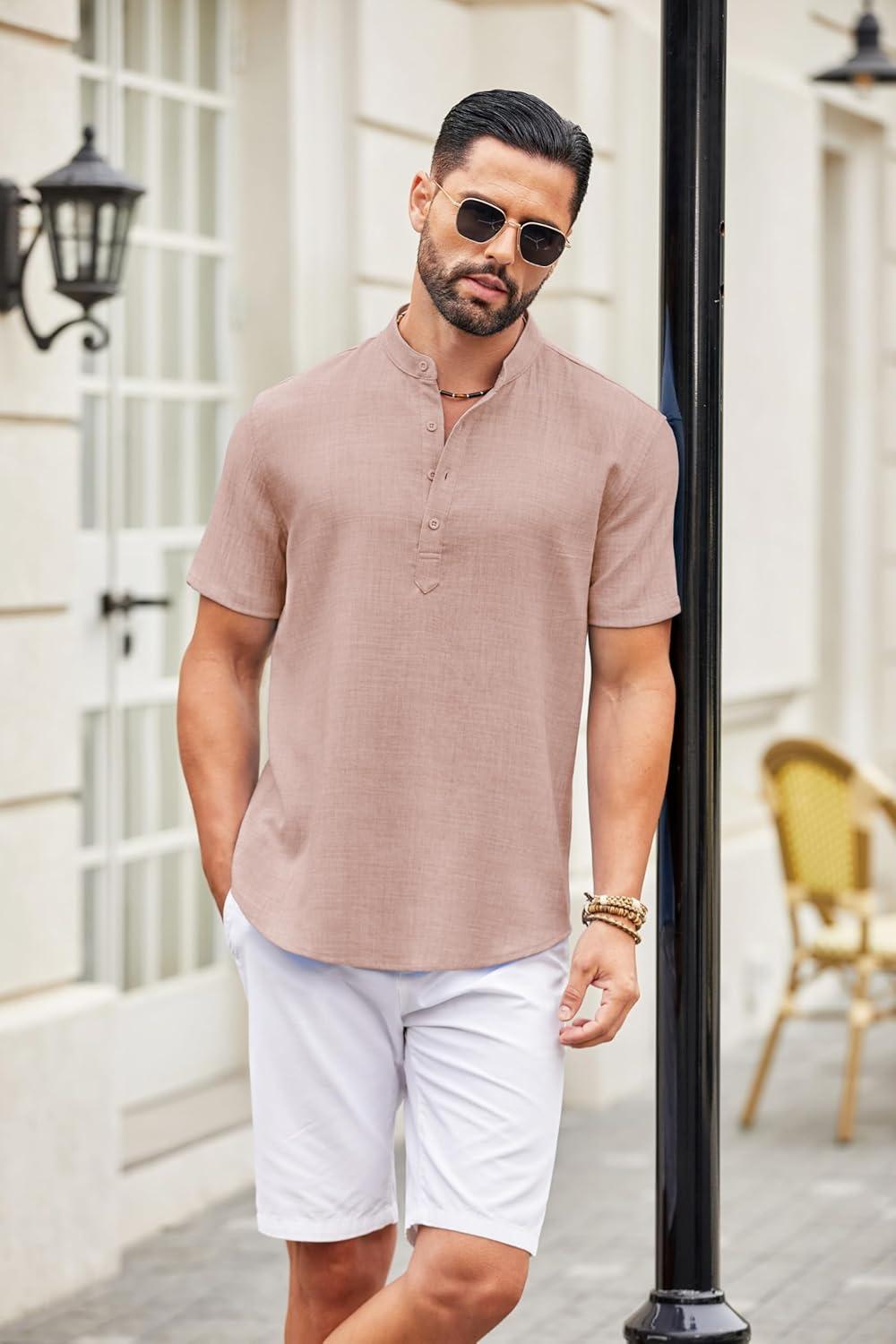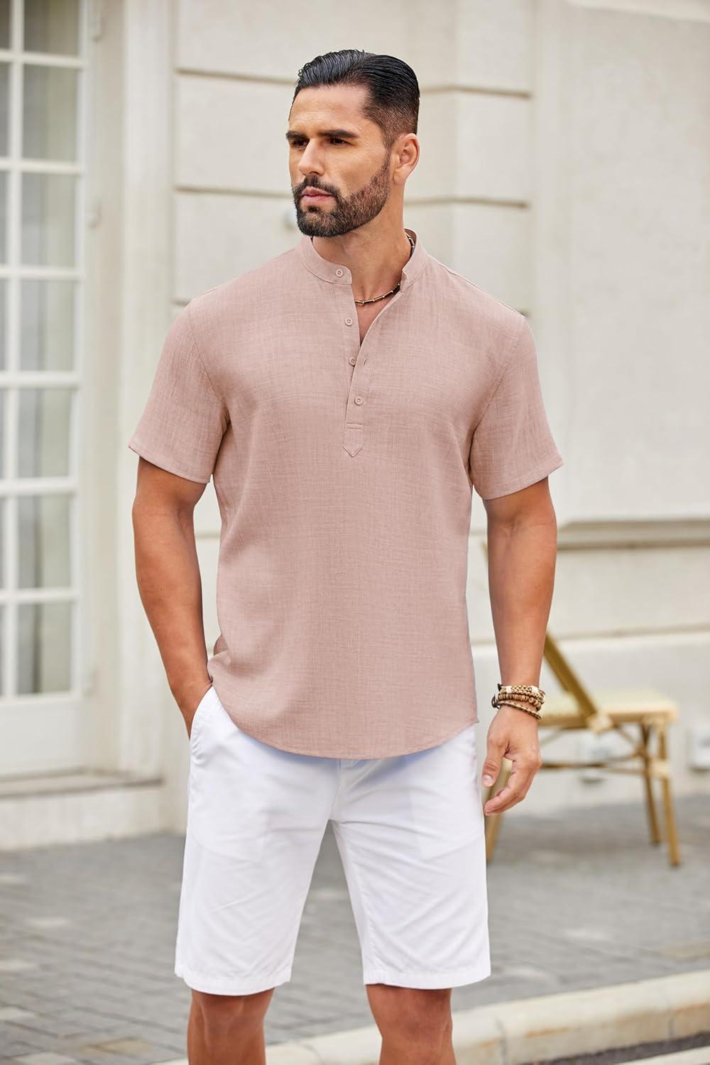 COOFANDY Men’s Casual Henley Shirt Short Sleeve Summer Shirts Linen Band Collar Summer Beach Hippie T-Shirts(Pastel Pink)