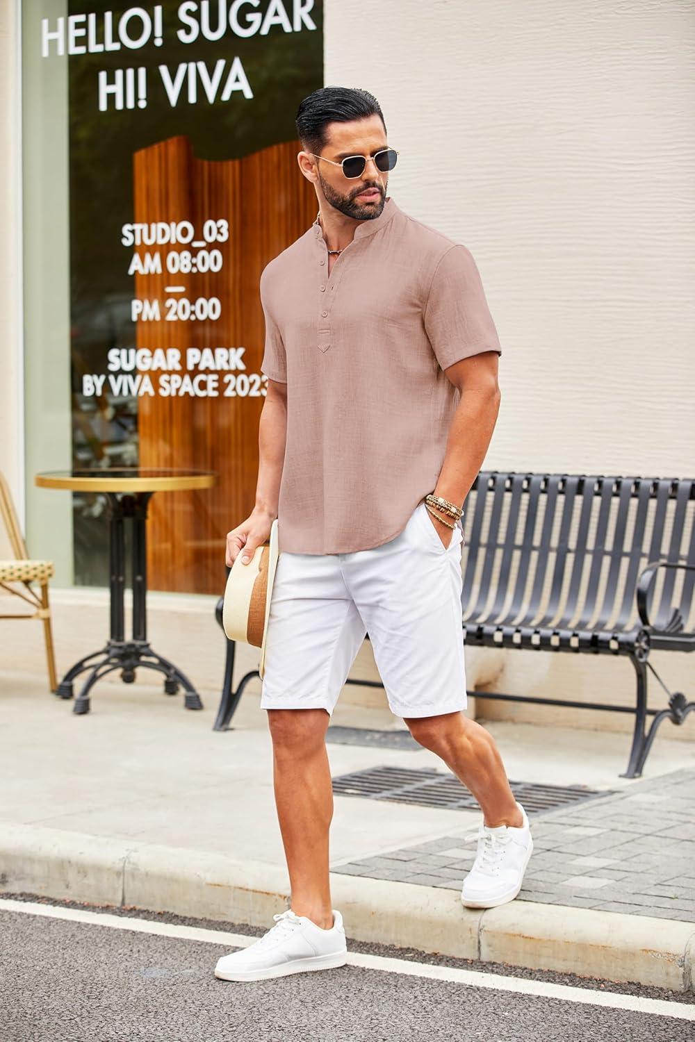 COOFANDY Men’s Casual Henley Shirt Short Sleeve Summer Shirts Linen Band Collar Summer Beach Hippie T-Shirts(Light Khaki)