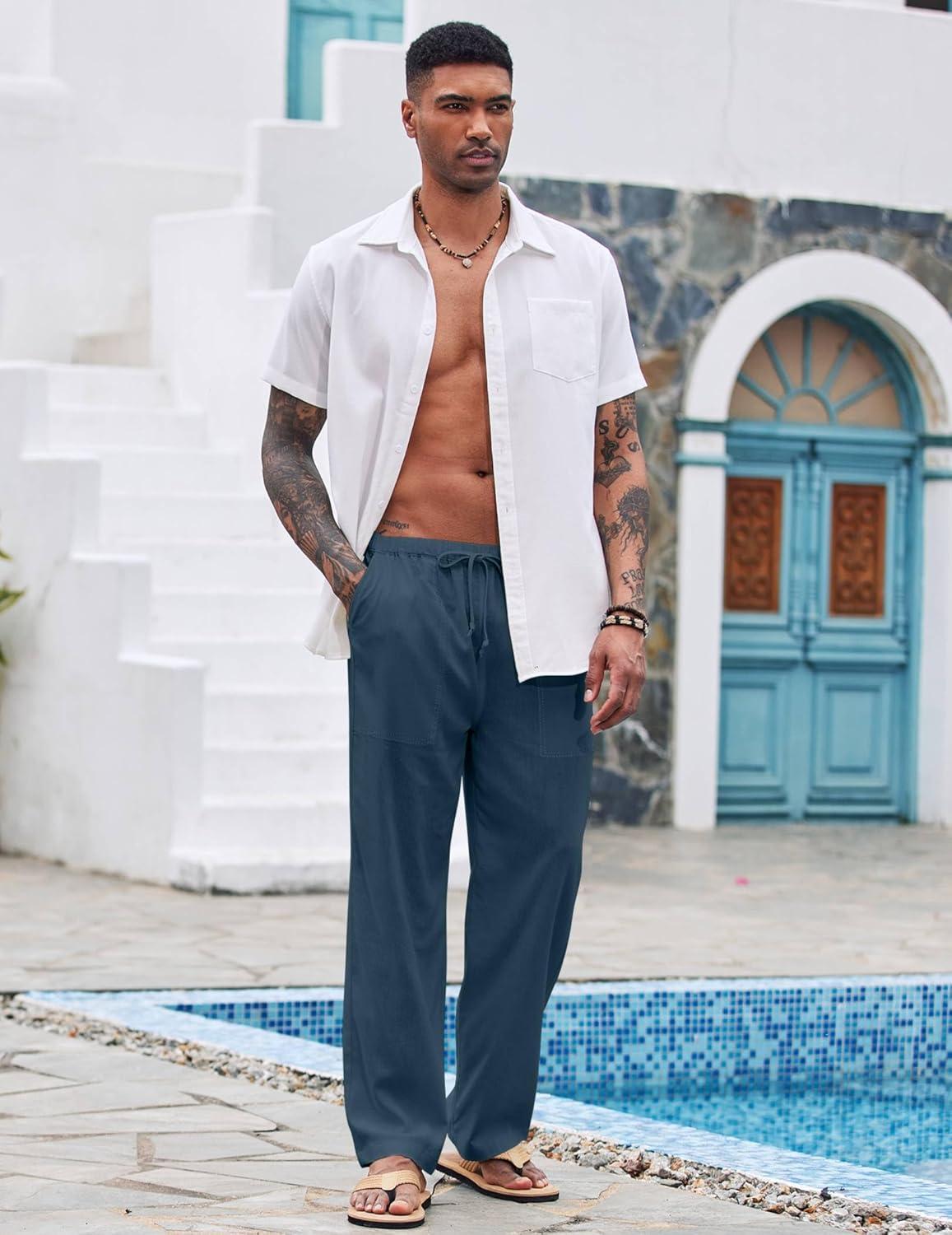COOFANDY Mens Casual Linen Pants Elastic Waist Linen Pants Drawstring Summer Beach Yoga Linen Trouser(A- Deep Blue)