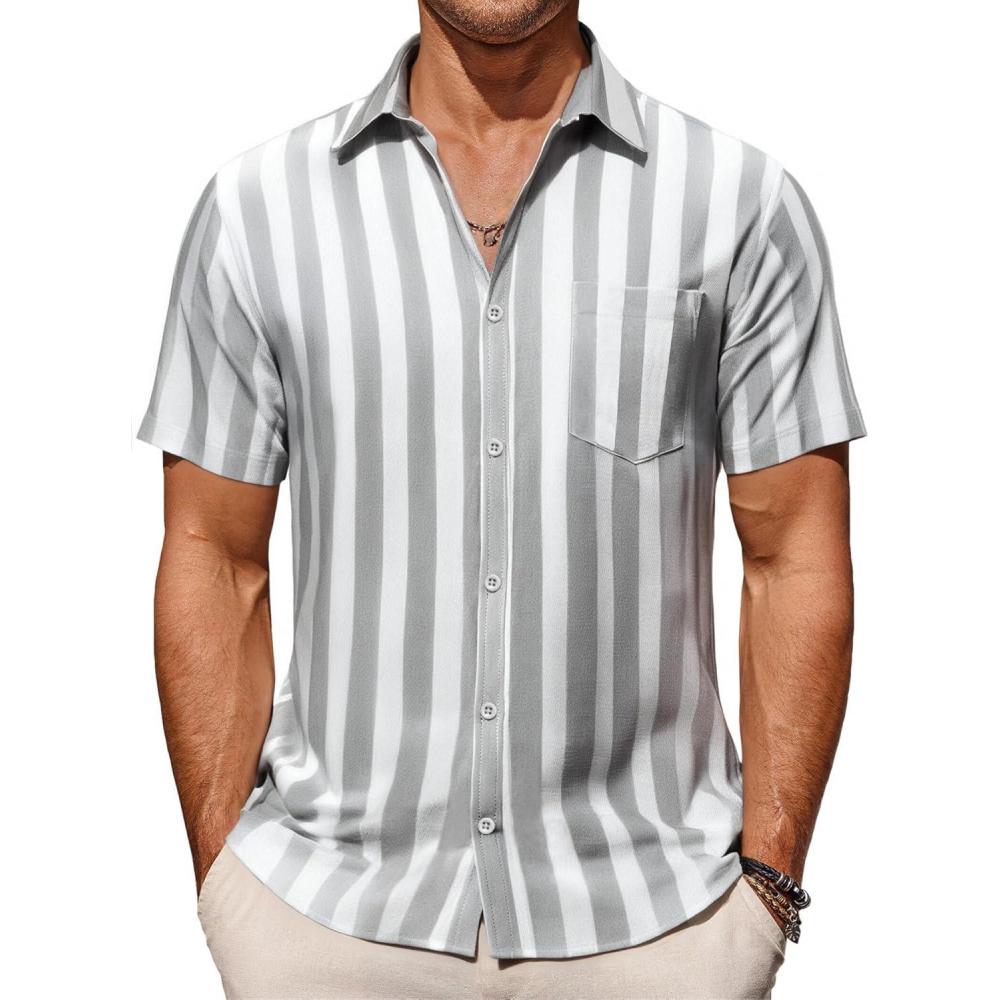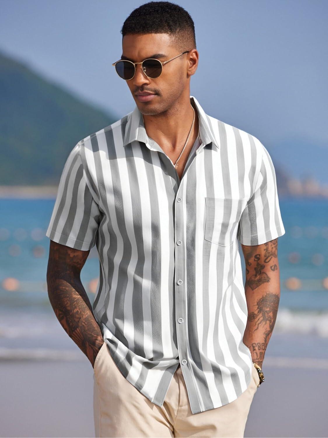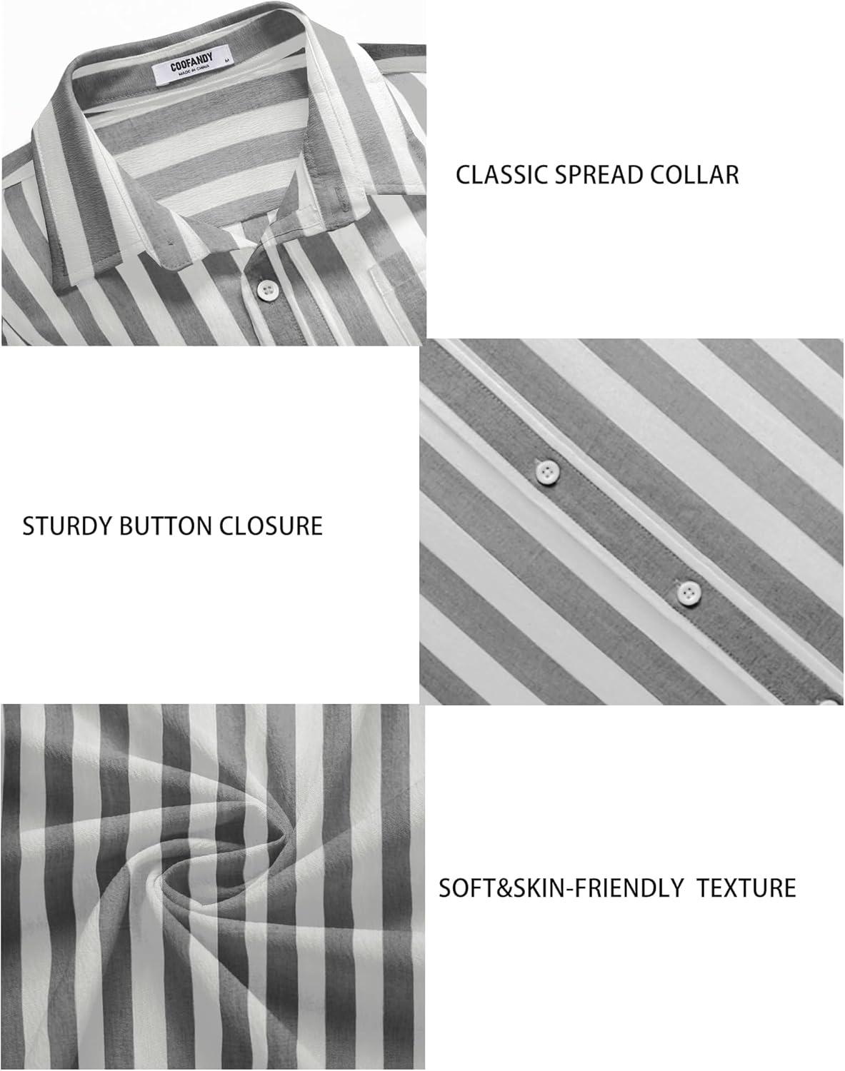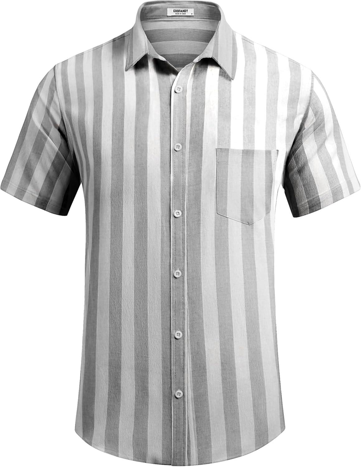 COOFANDY Men’s Casual Summer Beach Wrinkle Free Shirts Short Sleeve Button Down Lightweight Untucked Textured Shirt(Stripes-grey)