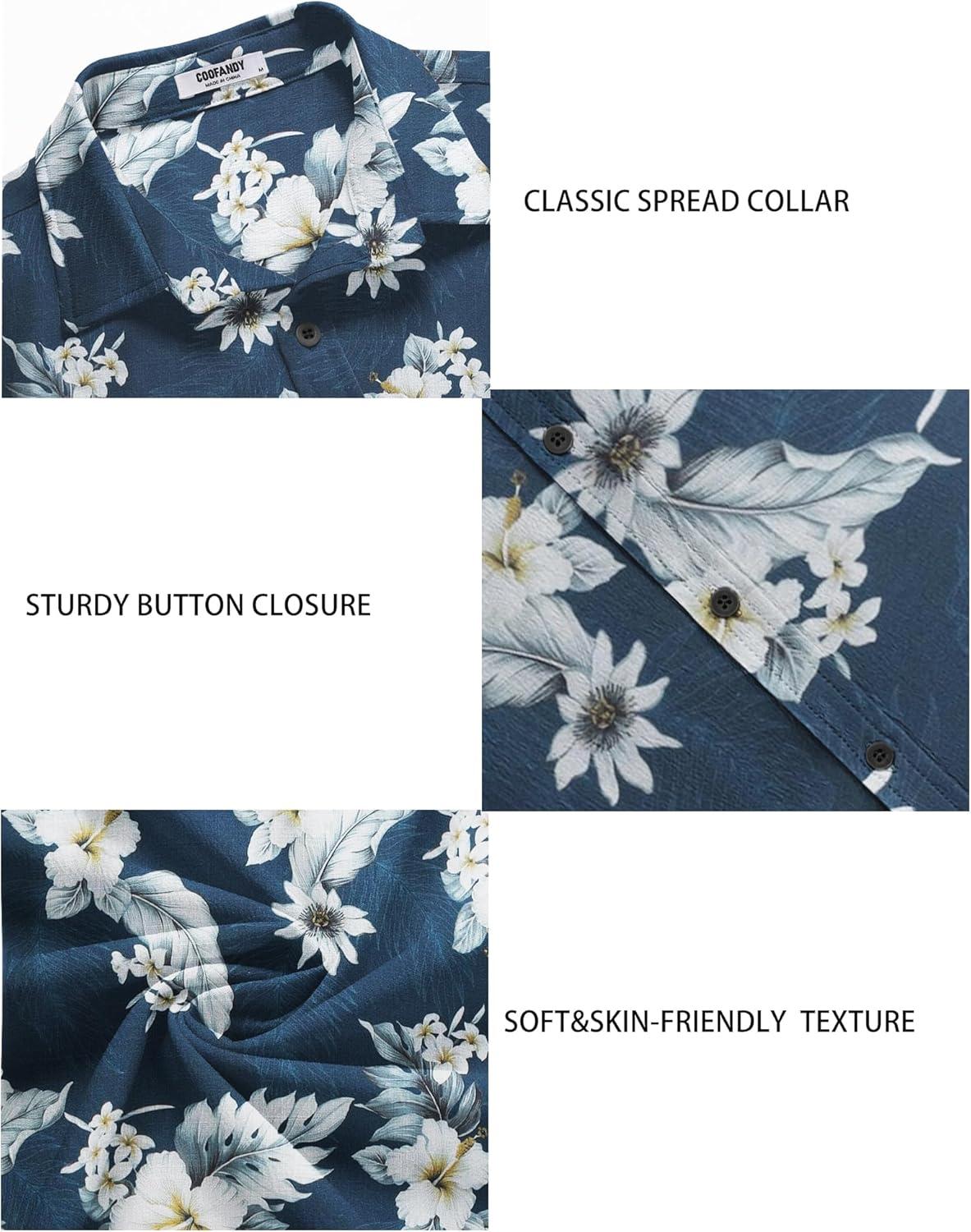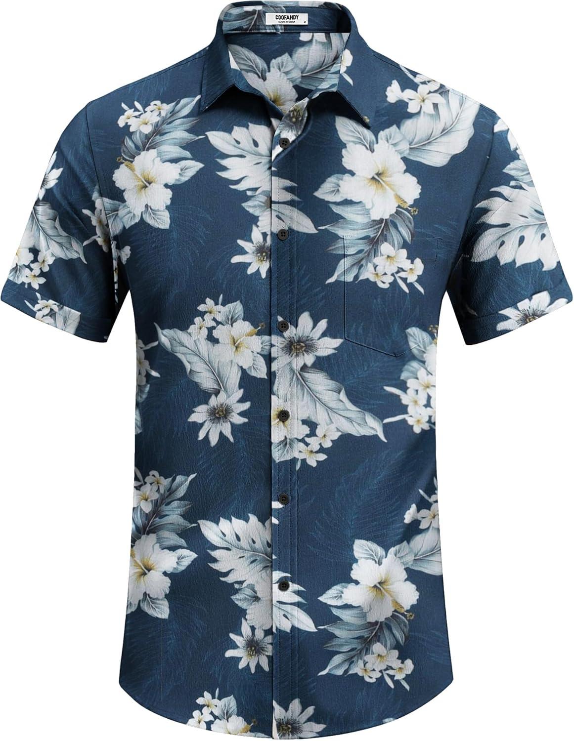 COOFANDY Men’s Casual Summer Beach Wrinkle Free Shirts Short Sleeve Button Down Lightweight Untucked Textured Shirt(Z-blue-palm Leaf)