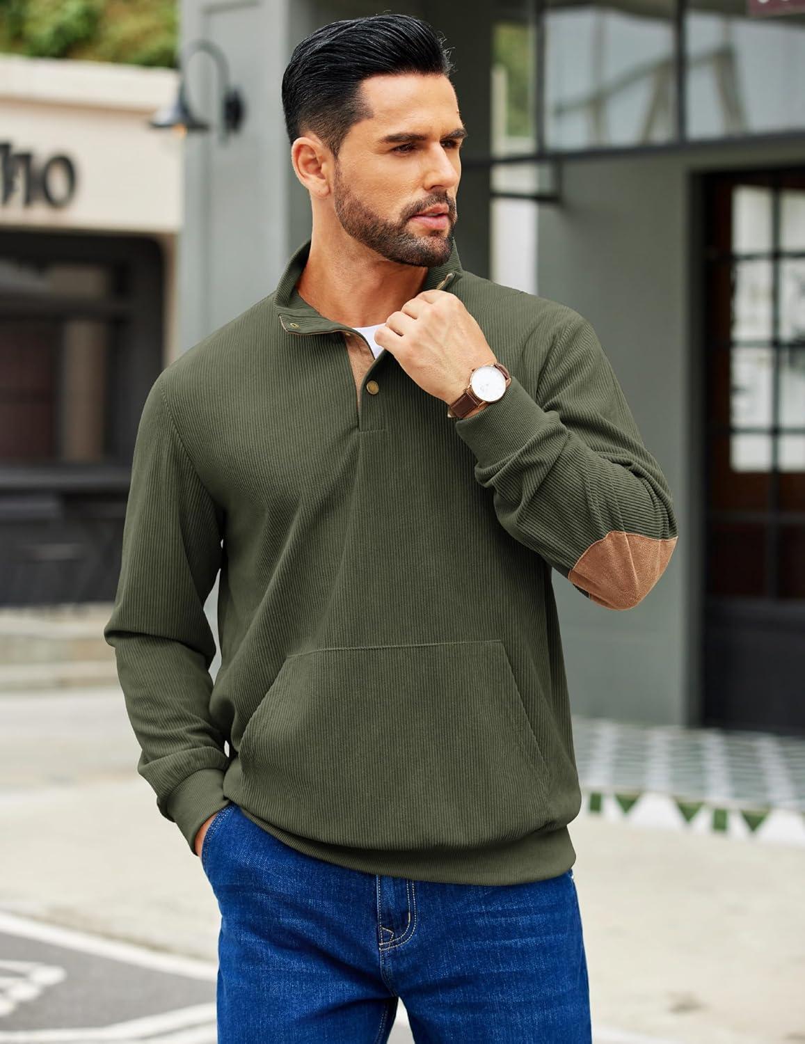 COOFANDY Mens Corduroy Sweatshirt Long Sleeve Pullover Quarter Button Fall Sweat Shirts(Dark Army Green)