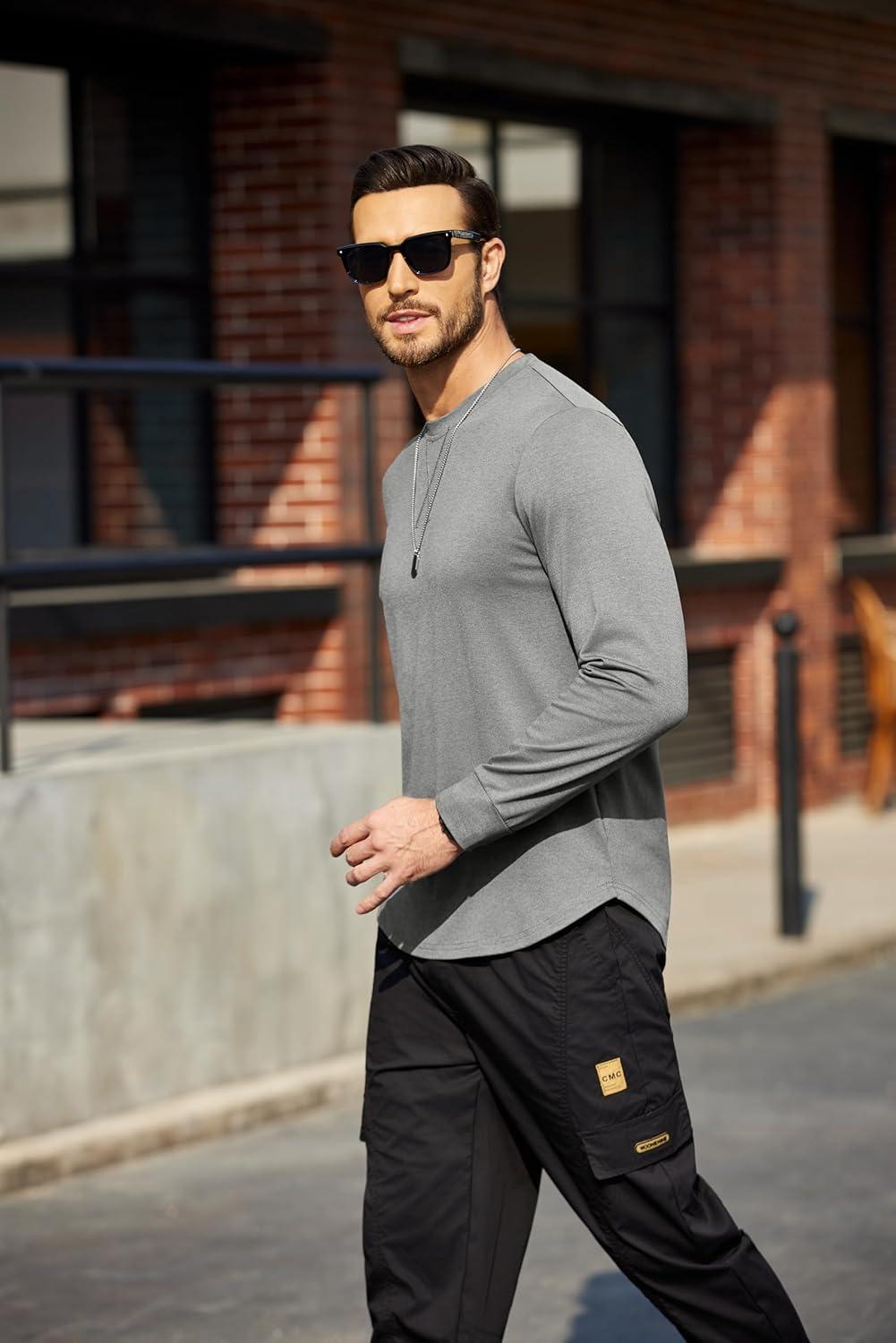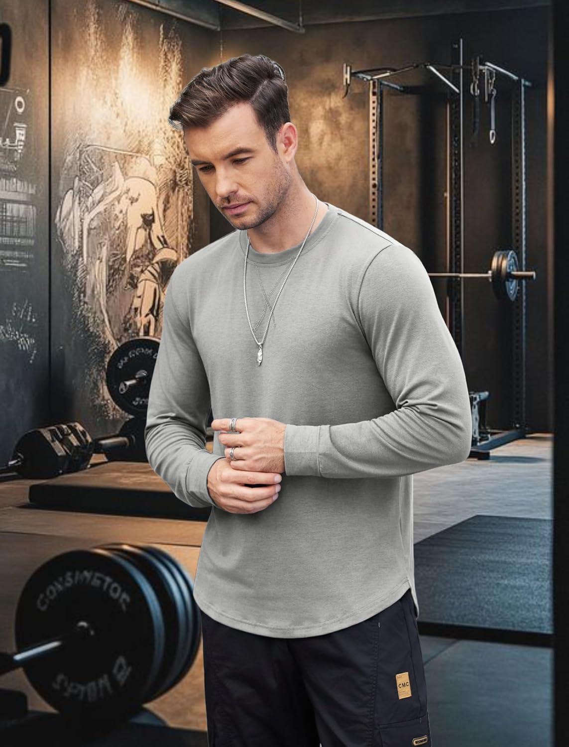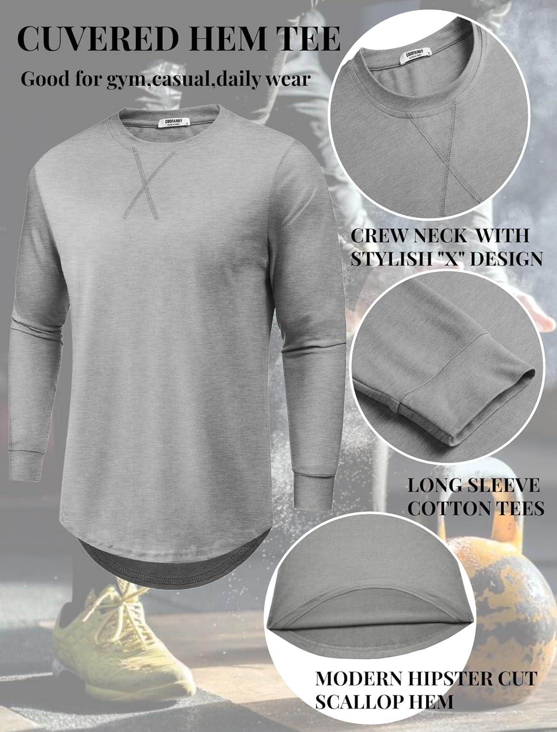 COOFANDY Mens Cotton Hipster Hip Hop Longline Crewneck T Shirts Casual Long Sleeve Tees Curved Hem Gym Shirts(One Piece- Dark Grey)