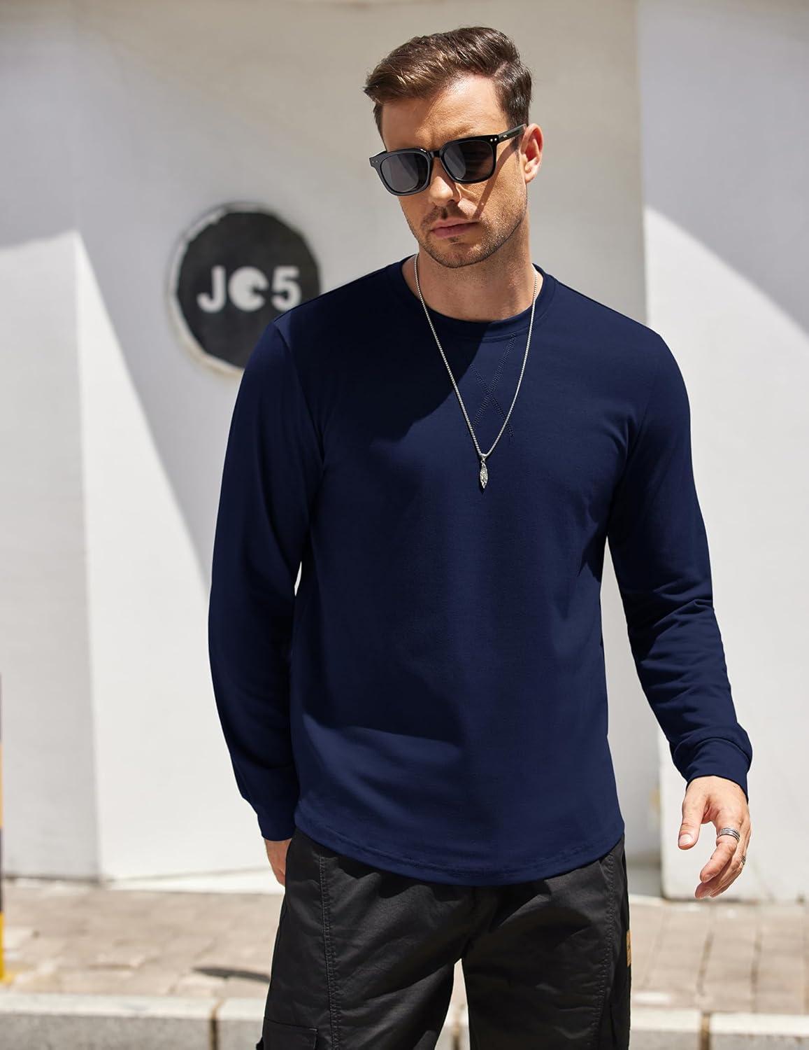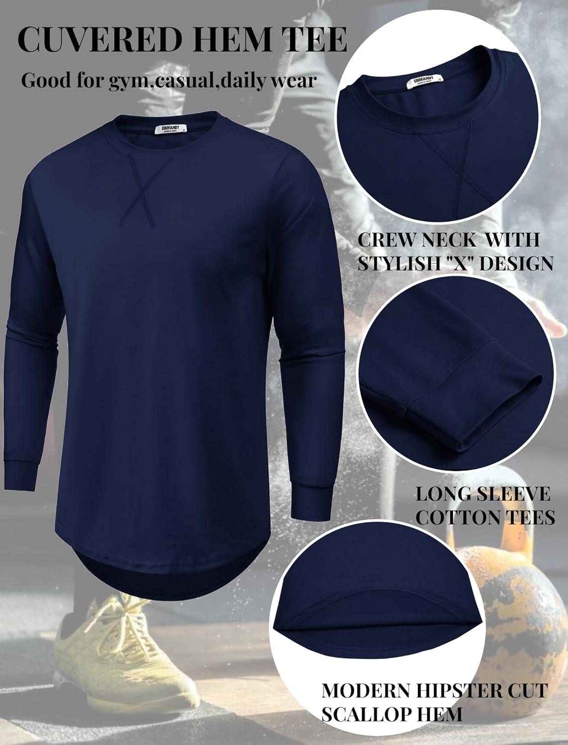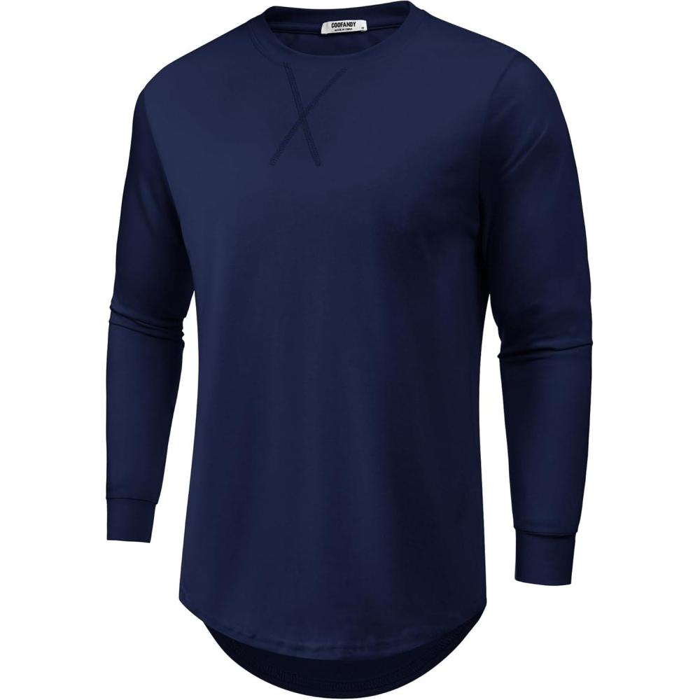 COOFANDY Mens Cotton Hipster Hip Hop Longline Crewneck T Shirts Casual Long Sleeve Tees Curved Hem Gym Shirts(One Piece- Navy Blue)