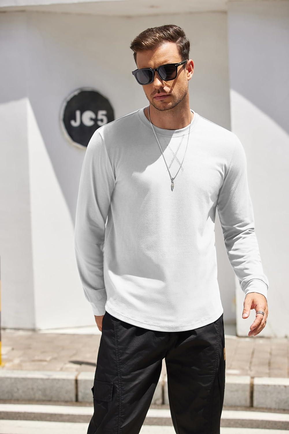 COOFANDY Mens Cotton Hipster Hip Hop Longline Crewneck T Shirts Casual Long Sleeve Tees Curved Hem Gym Shirts(Two Pack- Black + White)