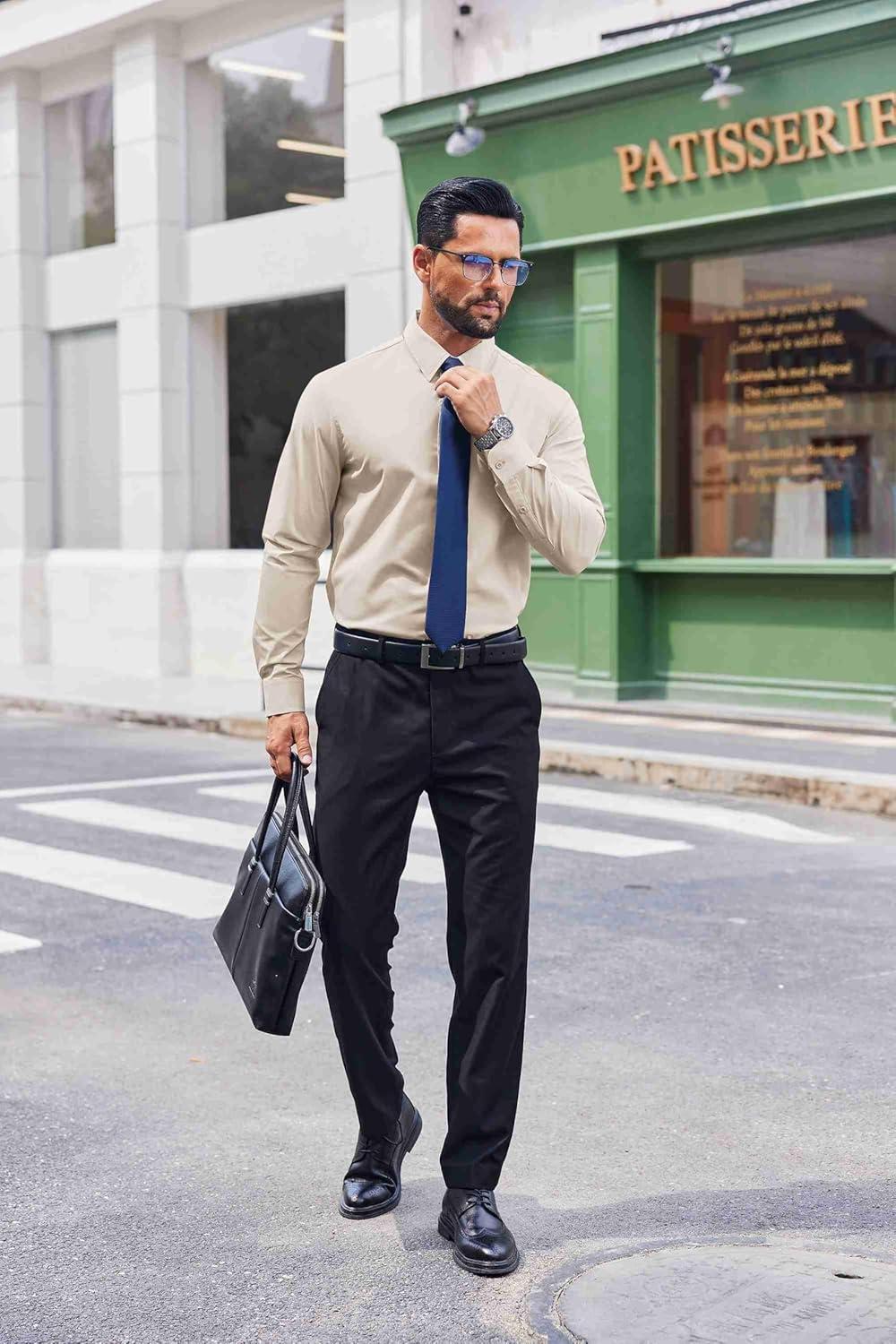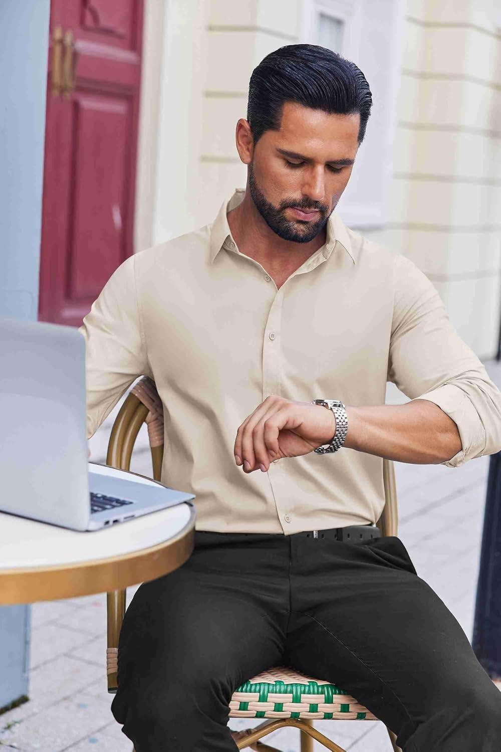 COOFANDY Mens Dress Shirts Long Sleeve Stain Shield Button Down Shirt Regular Fit Formal Business Wedding Shirts(Beige)