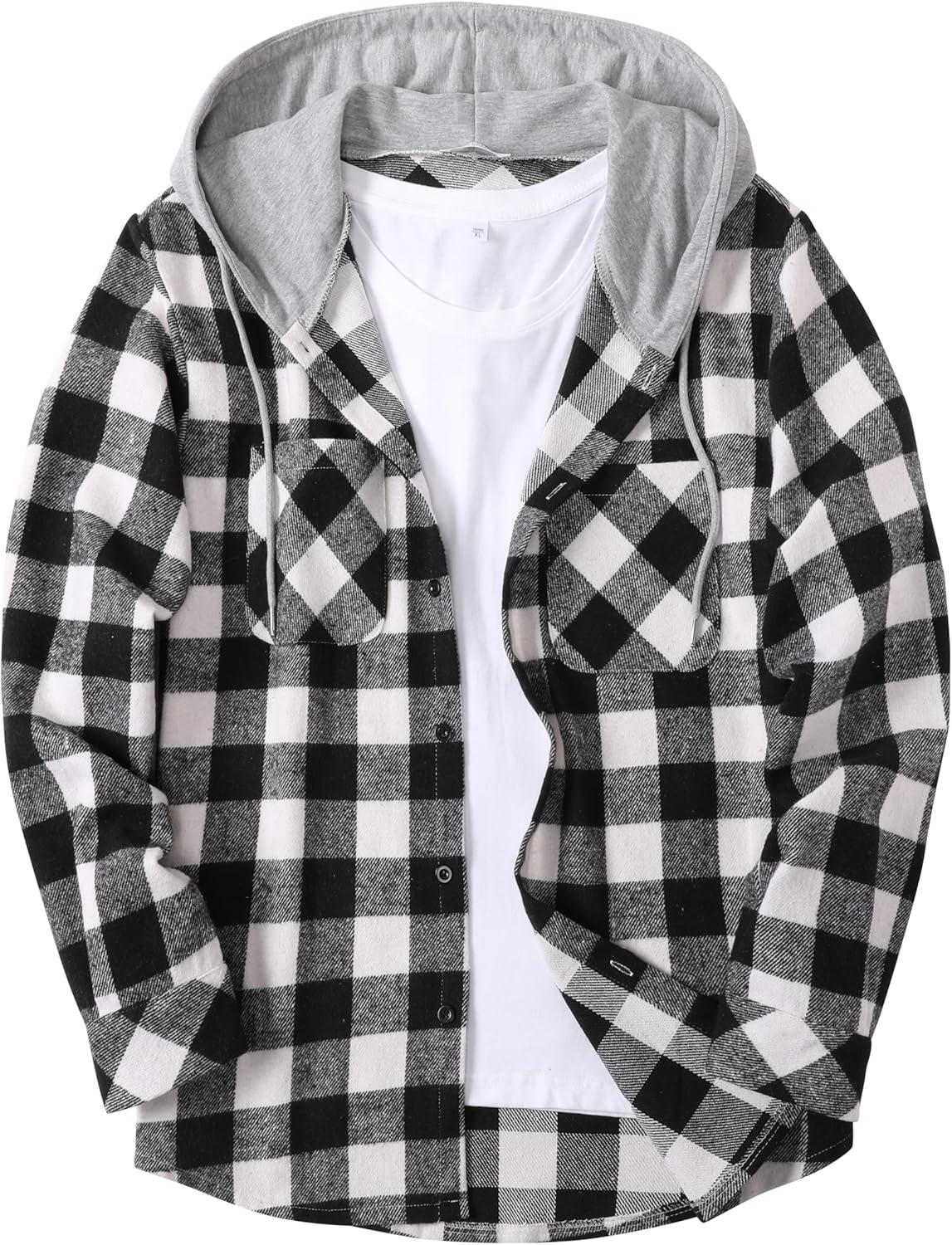 COOFANDY Men’s Flannel Hoodie Plaid Shirt Long Sleeve Button Down Casual Shirt Jacket Lightweight Fall Shacket(Plaid-black White)