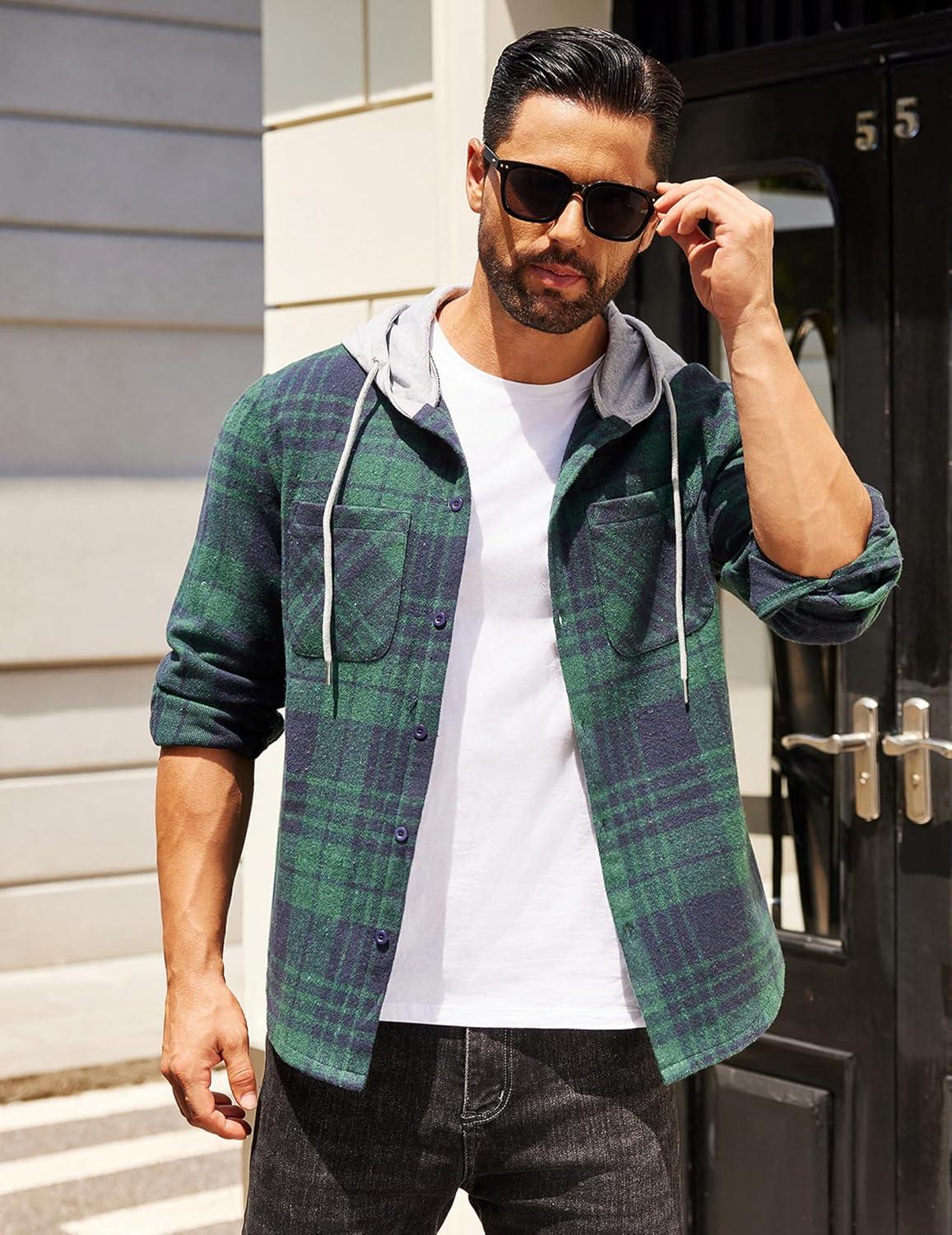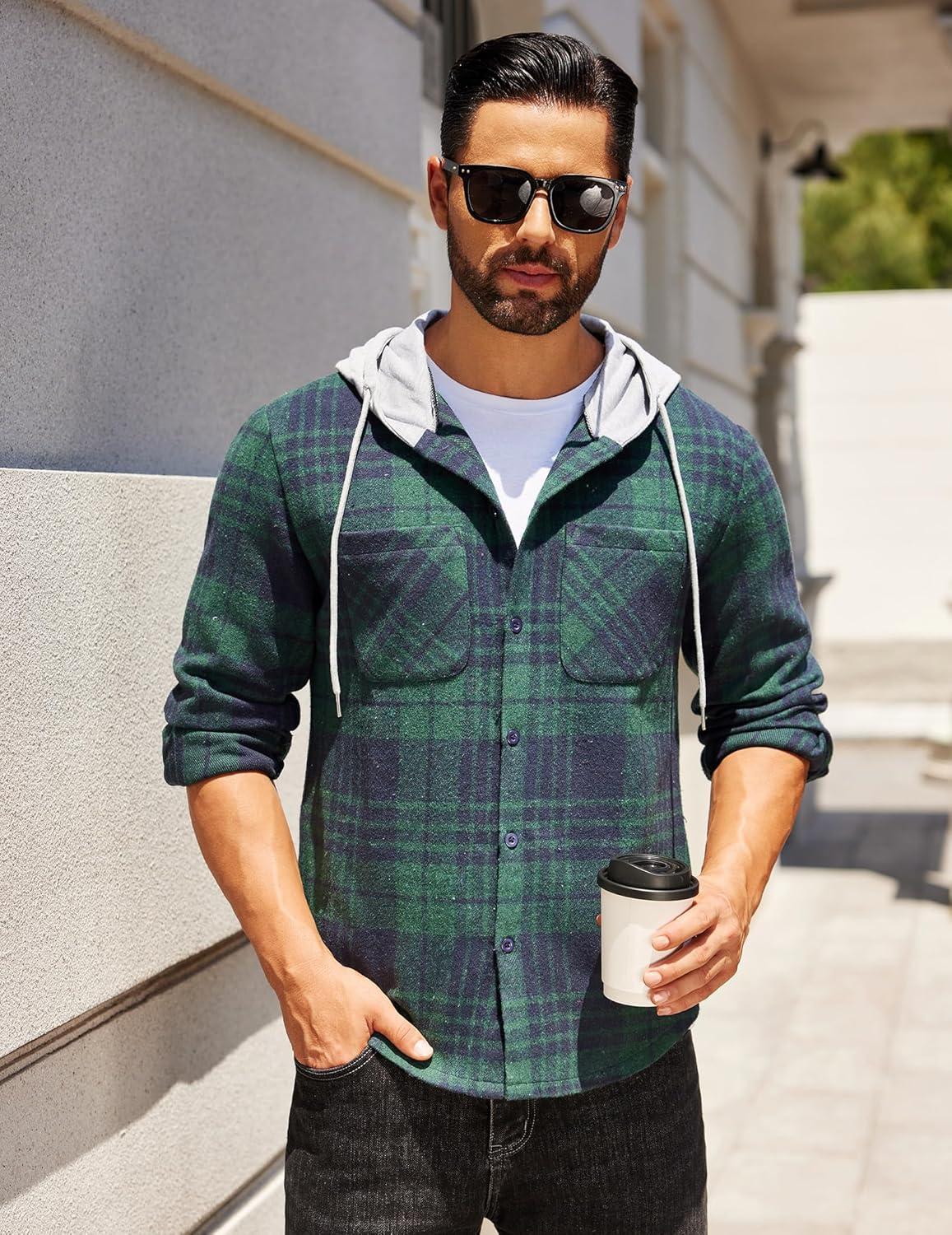 COOFANDY Men’s Flannel Hoodie Plaid Shirt Long Sleeve Button Down Casual Shirt Jacket Lightweight Fall Shacket(Plaid-navy & Green)
