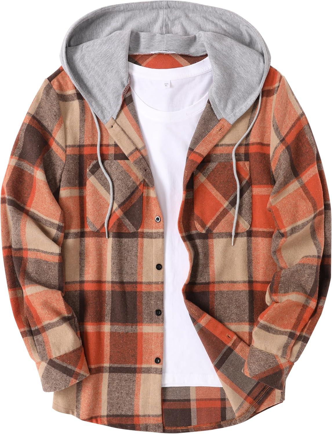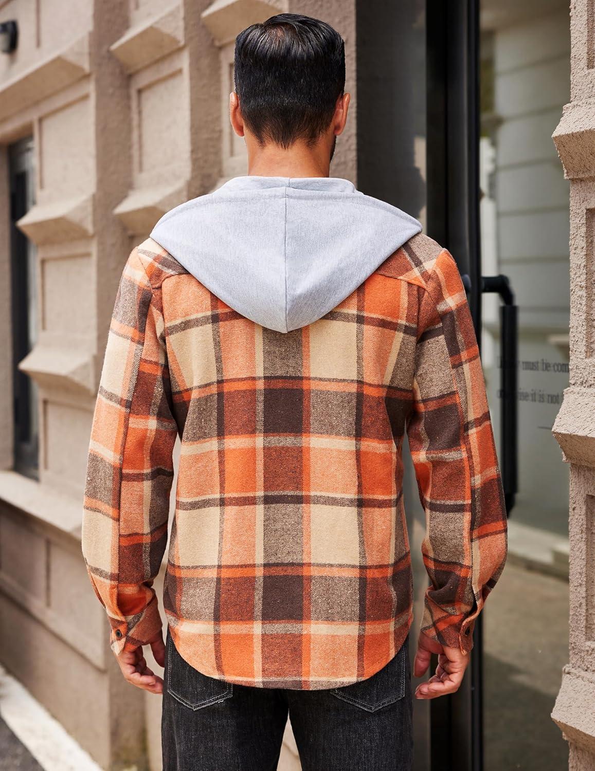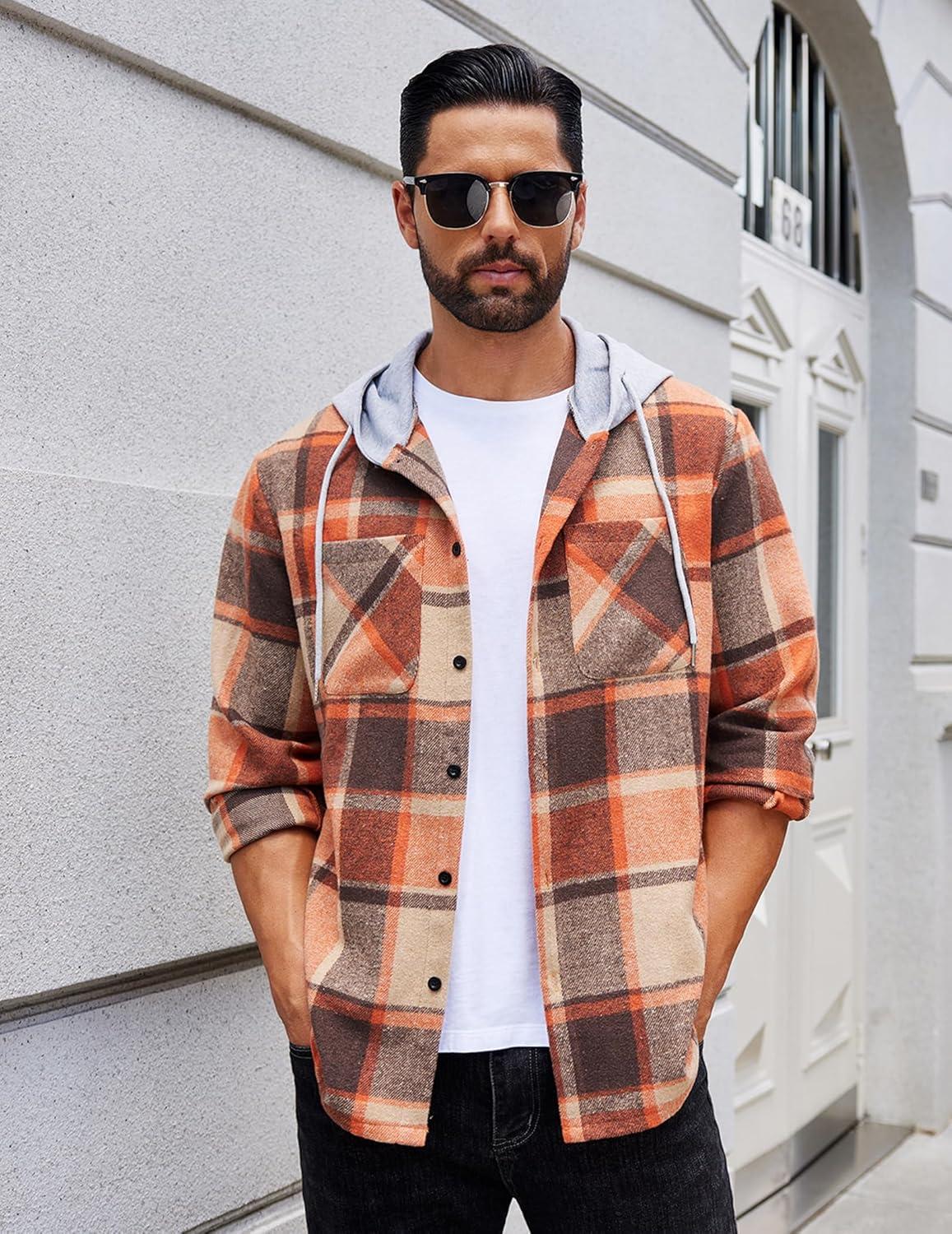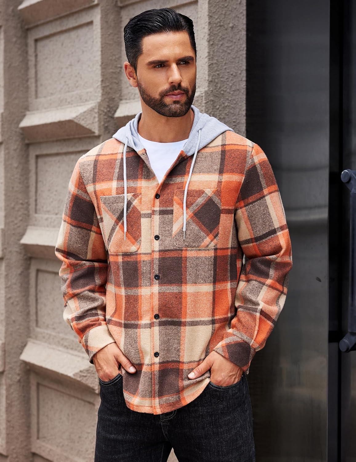 COOFANDY Men’s Flannel Hoodie Plaid Shirt Long Sleeve Button Down Casual Shirt Jacket Lightweight Fall Shacket(Plaid-orange & Khaki)