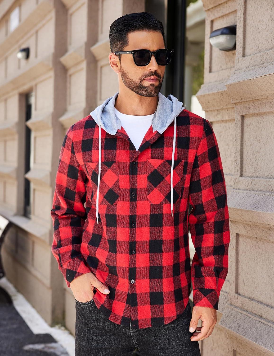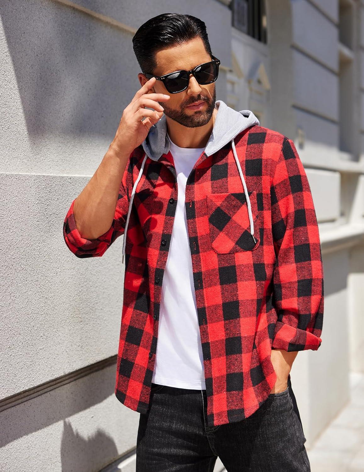 COOFANDY Men’s Flannel Hoodie Plaid Shirt Long Sleeve Button Down Casual Shirt Jacket Lightweight Fall Shacket(Plaid-red & Black)