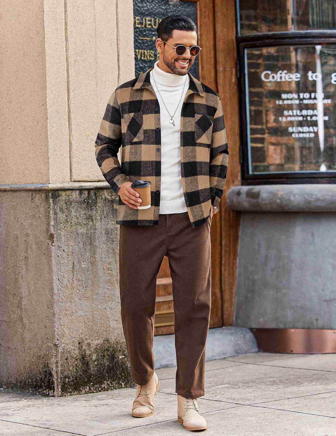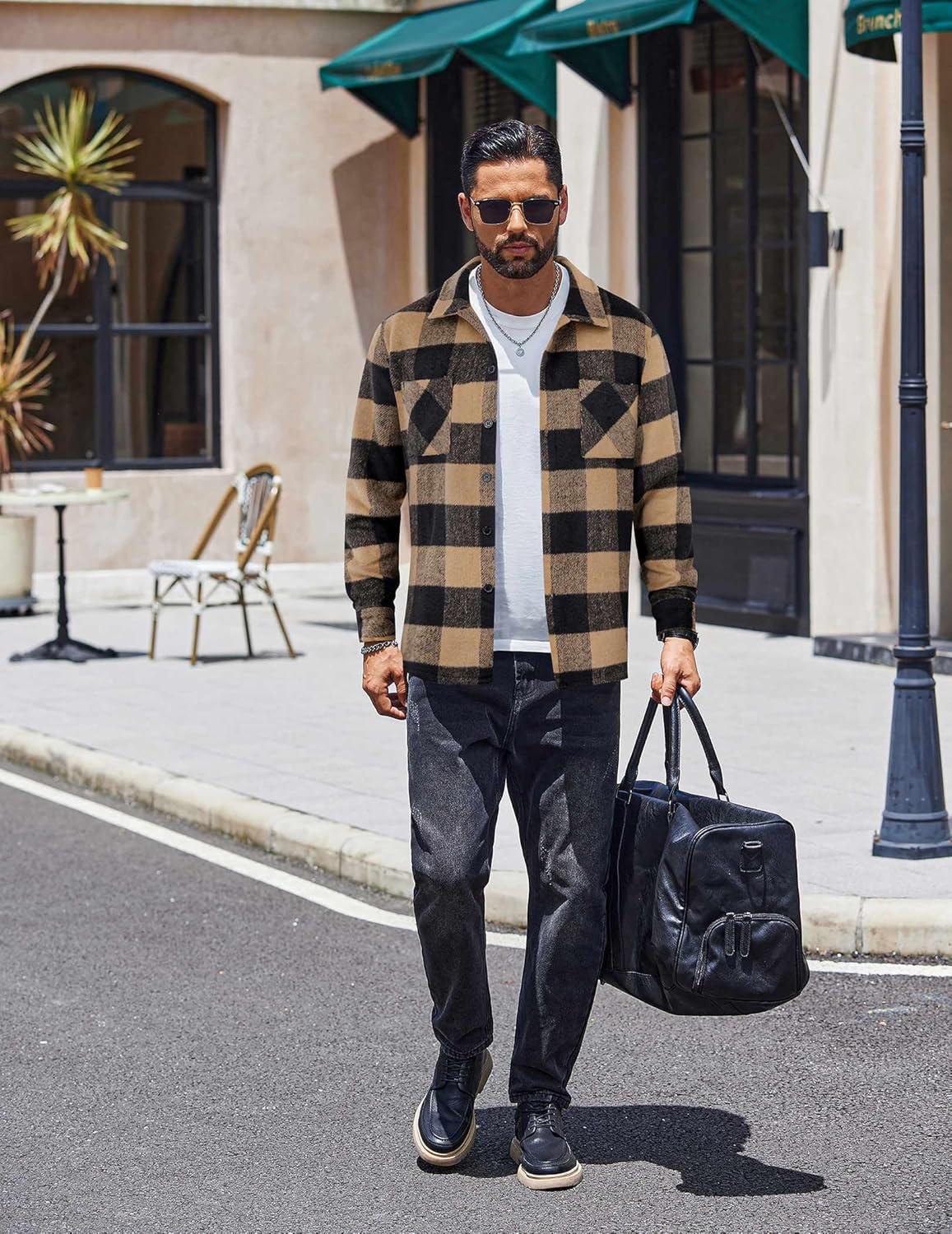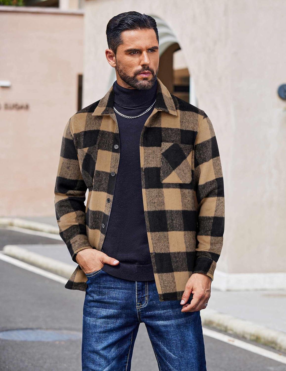 COOFANDY Men’s Flannel Shirts Casual Button Down Plaid Shirt Jacket Long Sleeve Fleece Shacket with Pockets(Buffalo Brown)