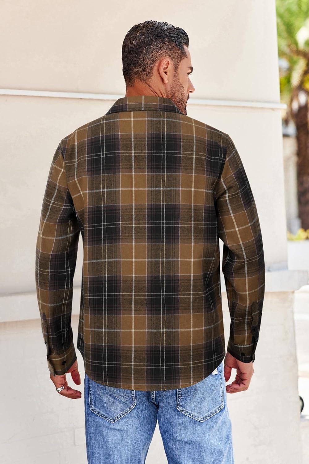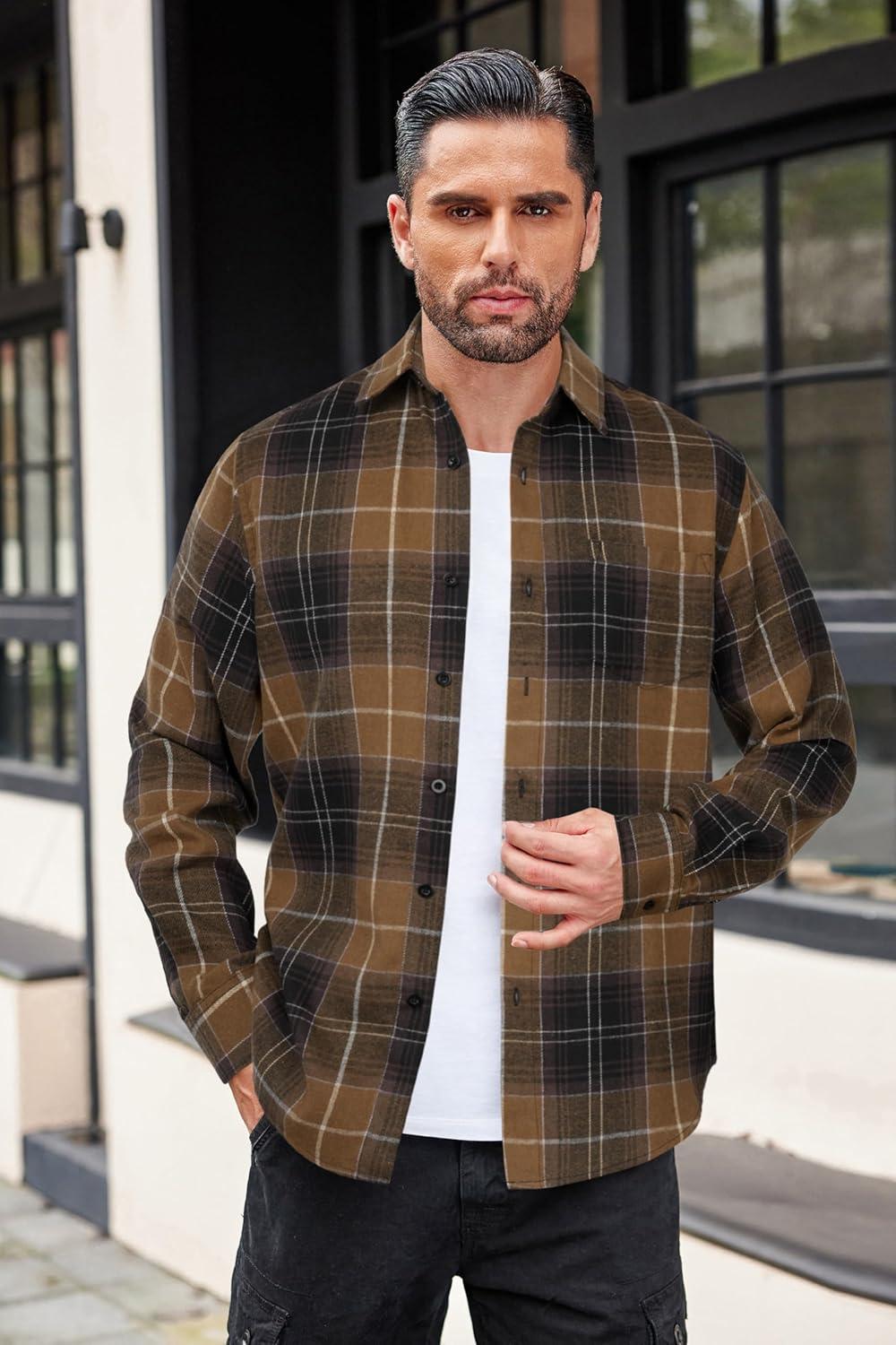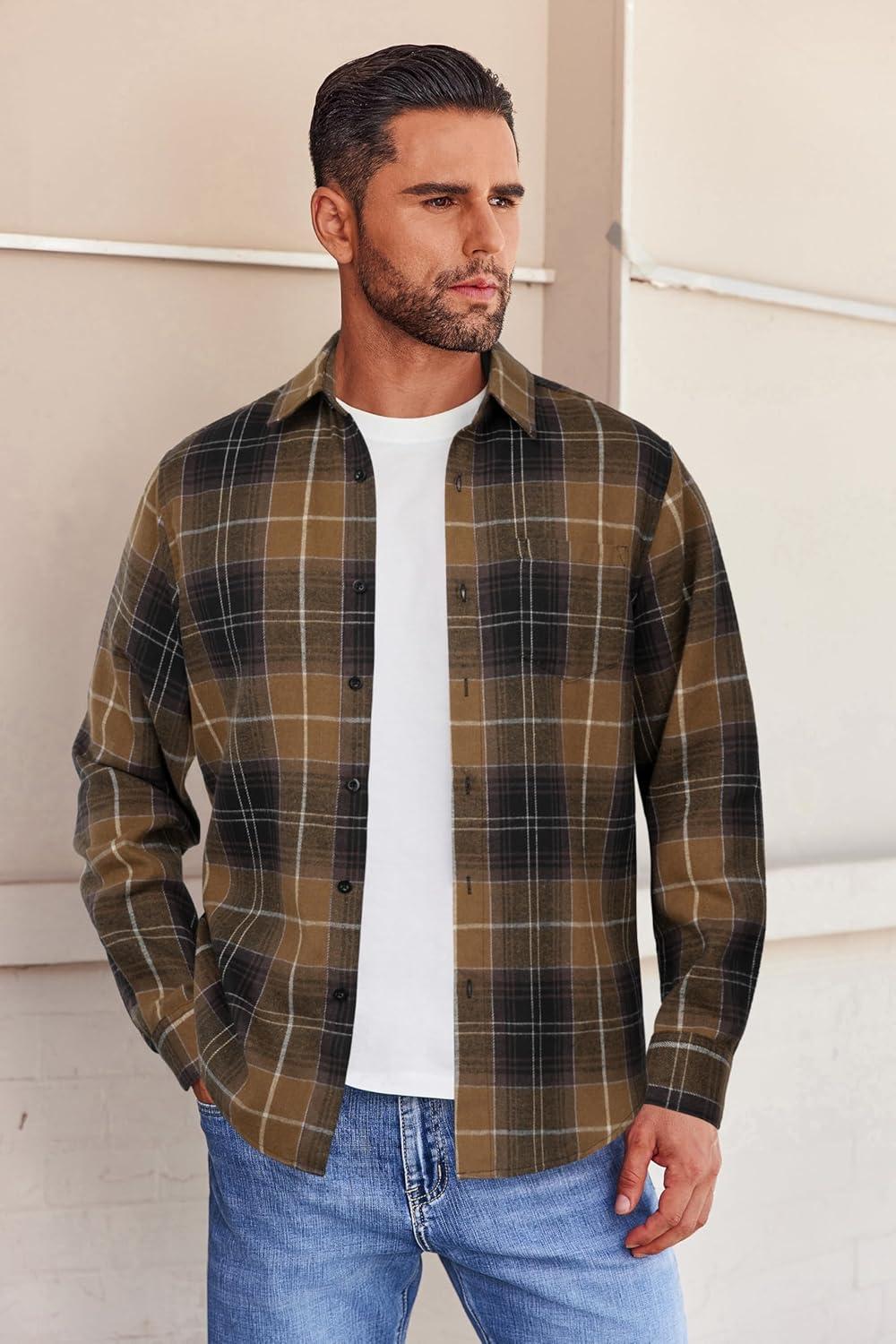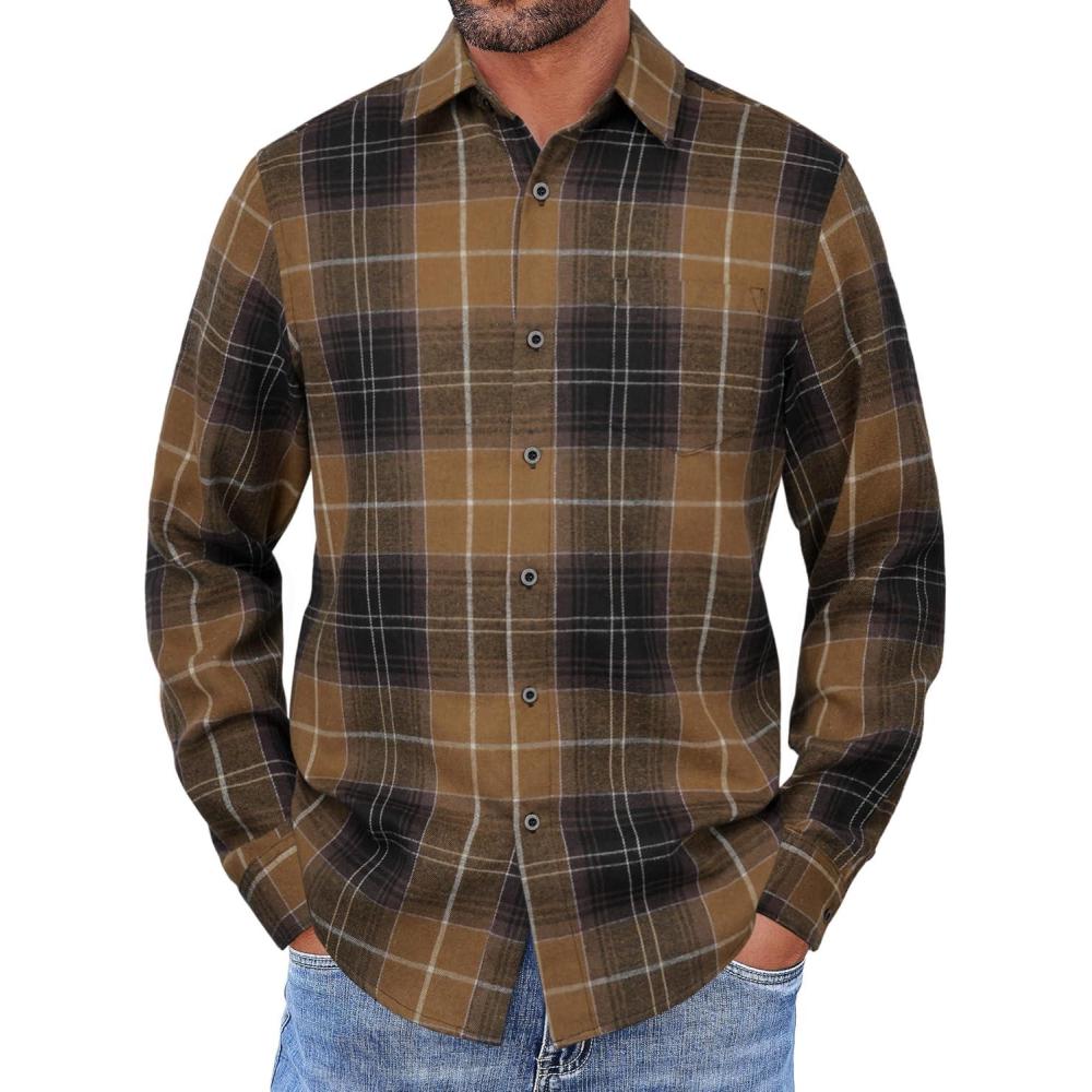COOFANDY Mens Flannel Shirts Long Sleeve Button Down Shirt with Pocket Casual Shirts Work Shirts for Men(Light Coffee Black Plaid)