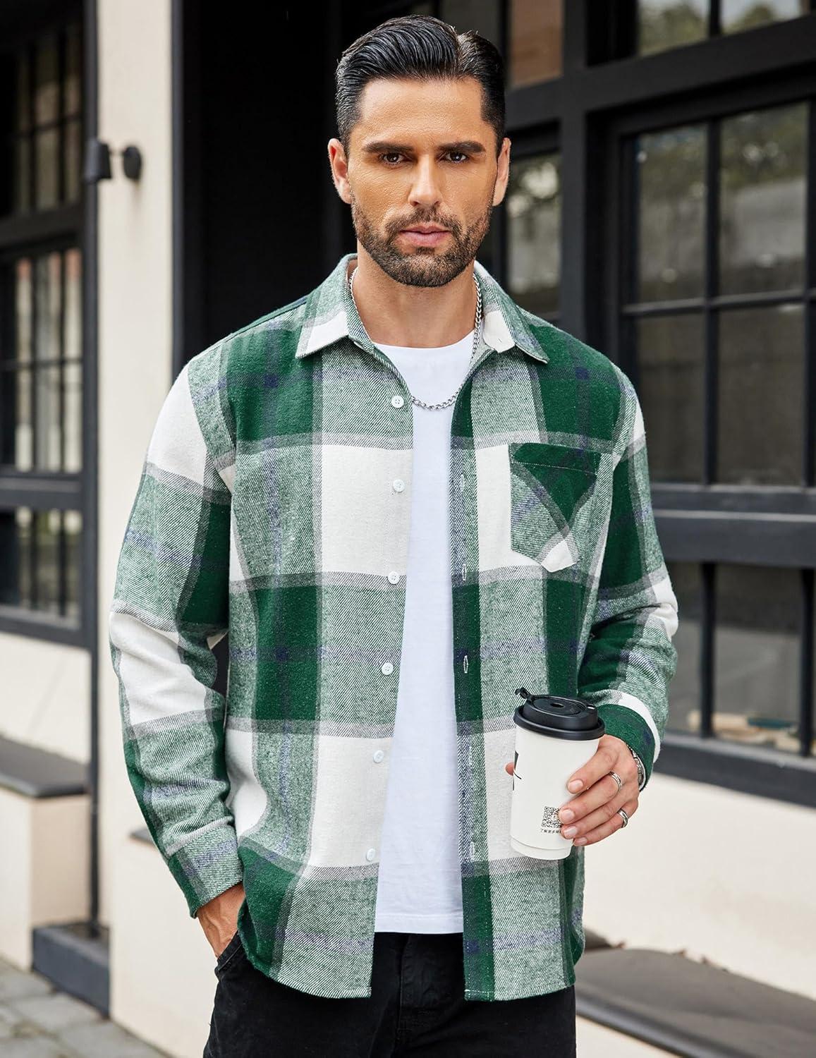 COOFANDY Mens Flannel Shirts Long Sleeve Lightweight Plaid Shirt Casual Button Down Shirts Jacket(Green)