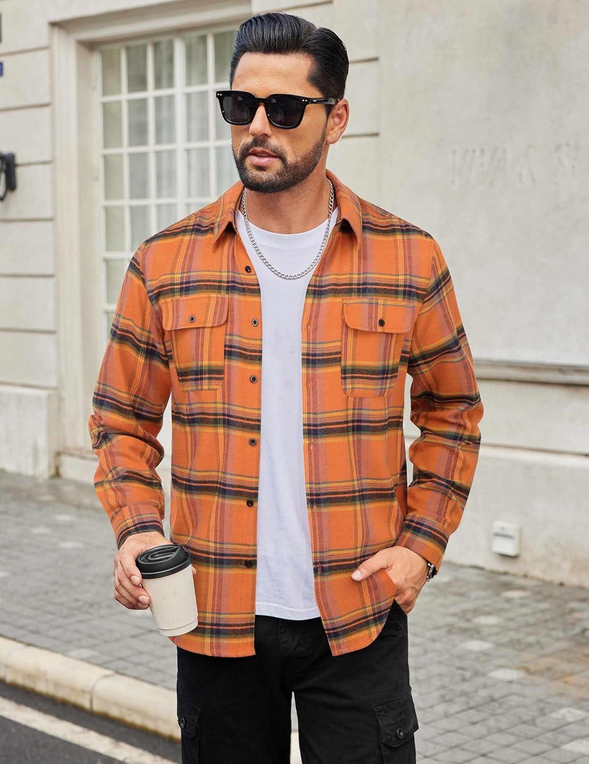 COOFANDY Mens Flannel Shirts Long Sleeve Plaid Button Down Shirt Cotton Casual Work Shirts with Pockets(Orange)