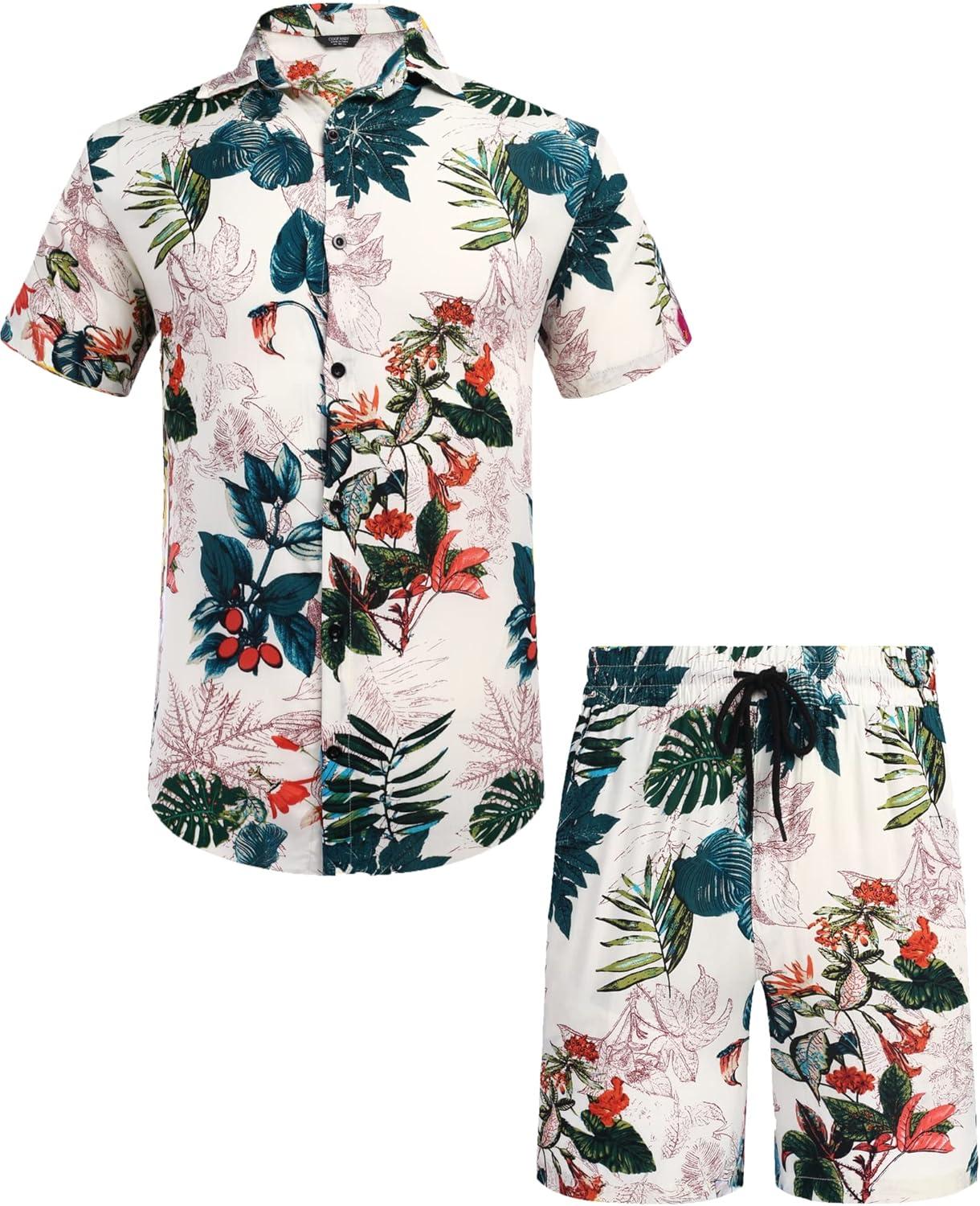 COOFANDY Men’s Hawaiian Matching Set Summer Beach 2 Piece Outfits Flower Button Down Shirts and Shorts Vacation Outfits(Leaves)