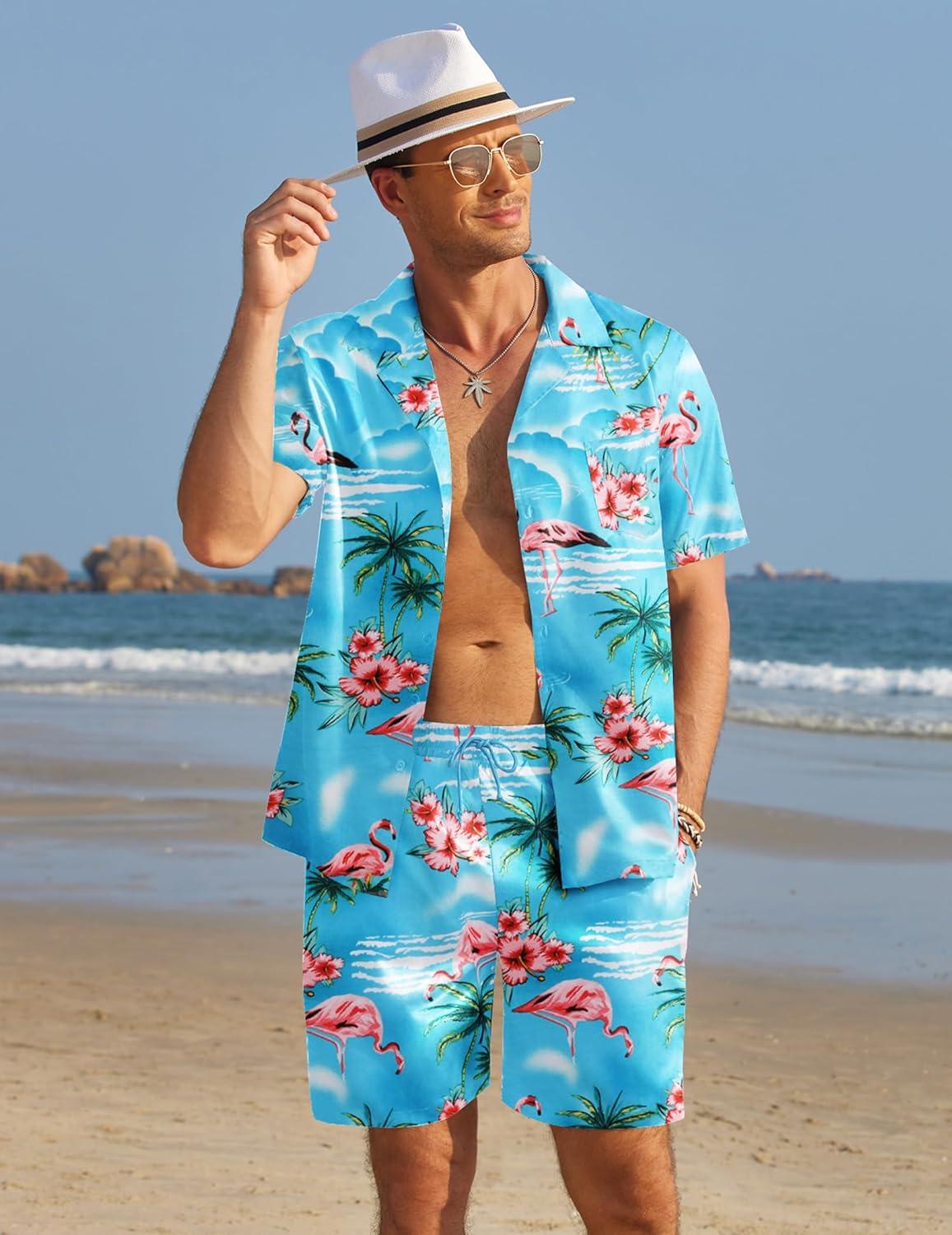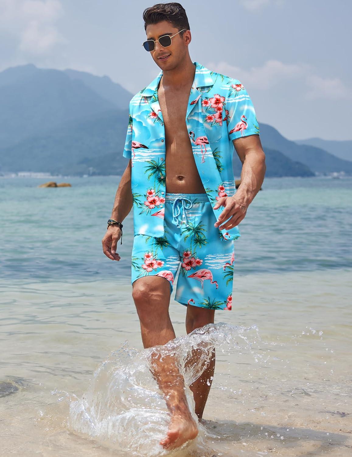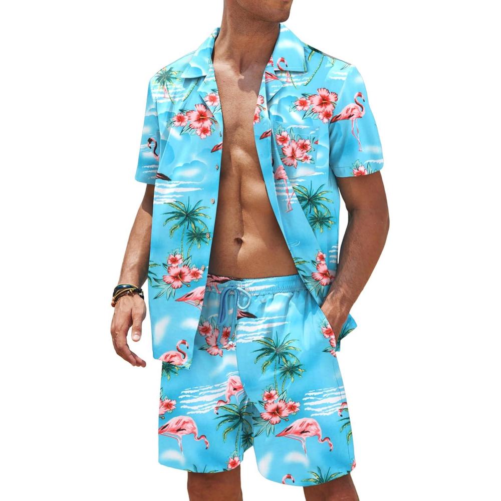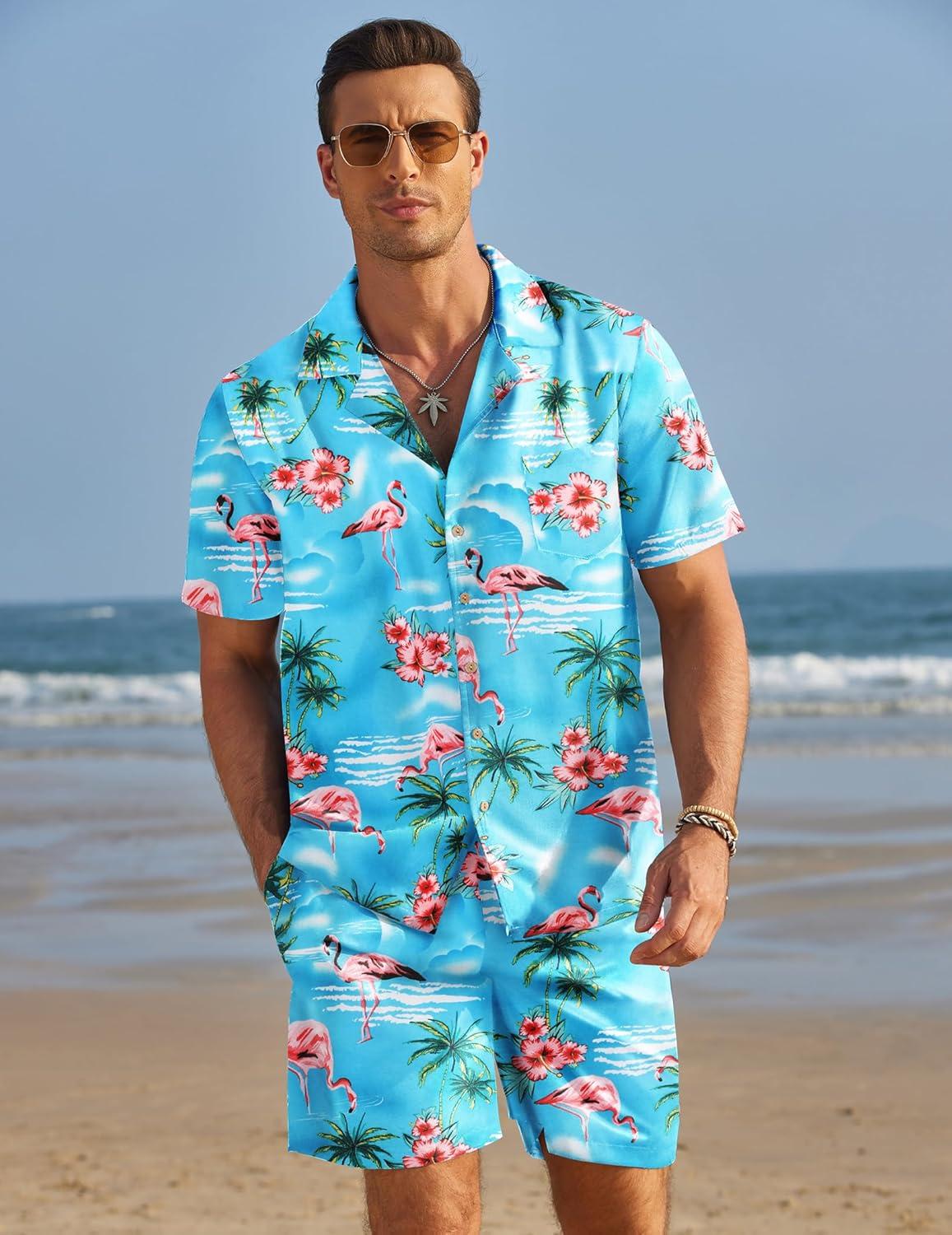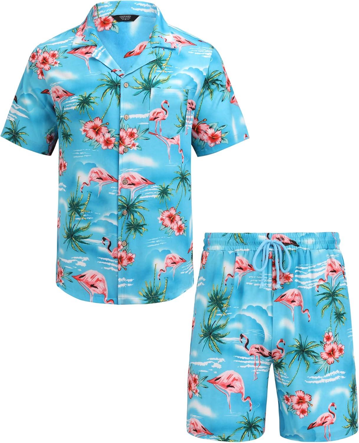 COOFANDY Mens Hawaiian Shirt and Shorts Set 2 Piece Vacation Outfits Floral Button Down Shirt(Blue&flamingo)