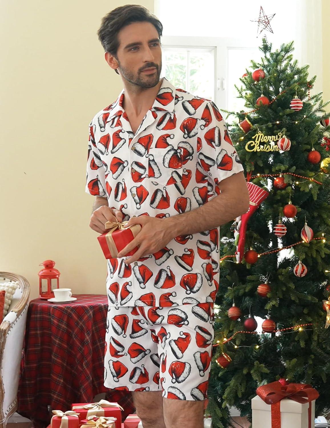 COOFANDY Mens Hawaiian Shirt and Shorts Set 2 Piece Vacation Outfits Floral Button Down Shirt(Santa Hat)