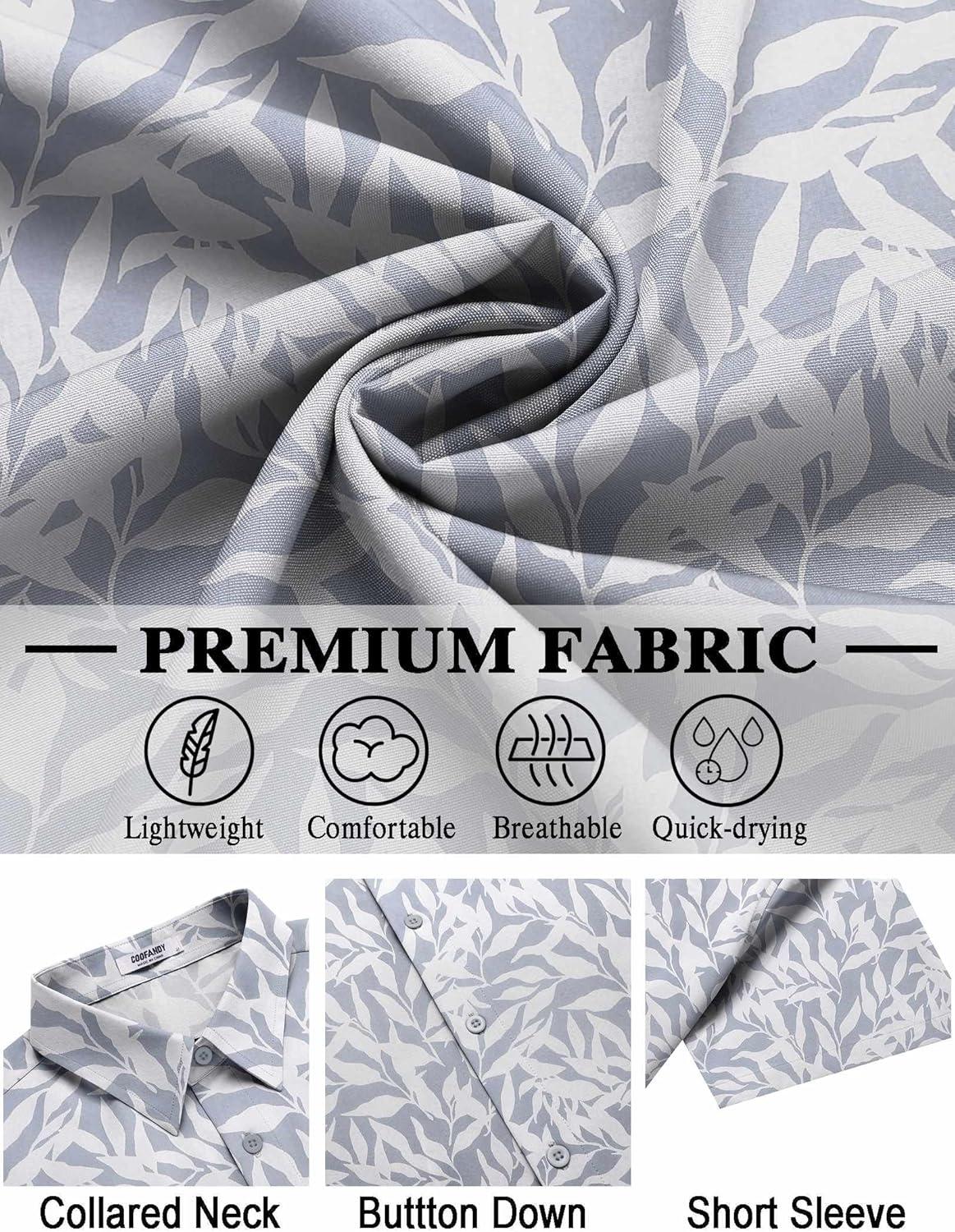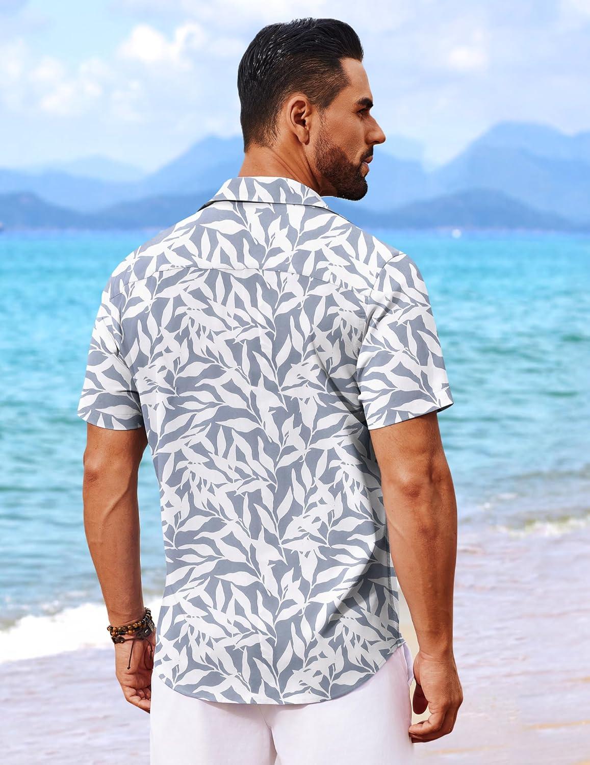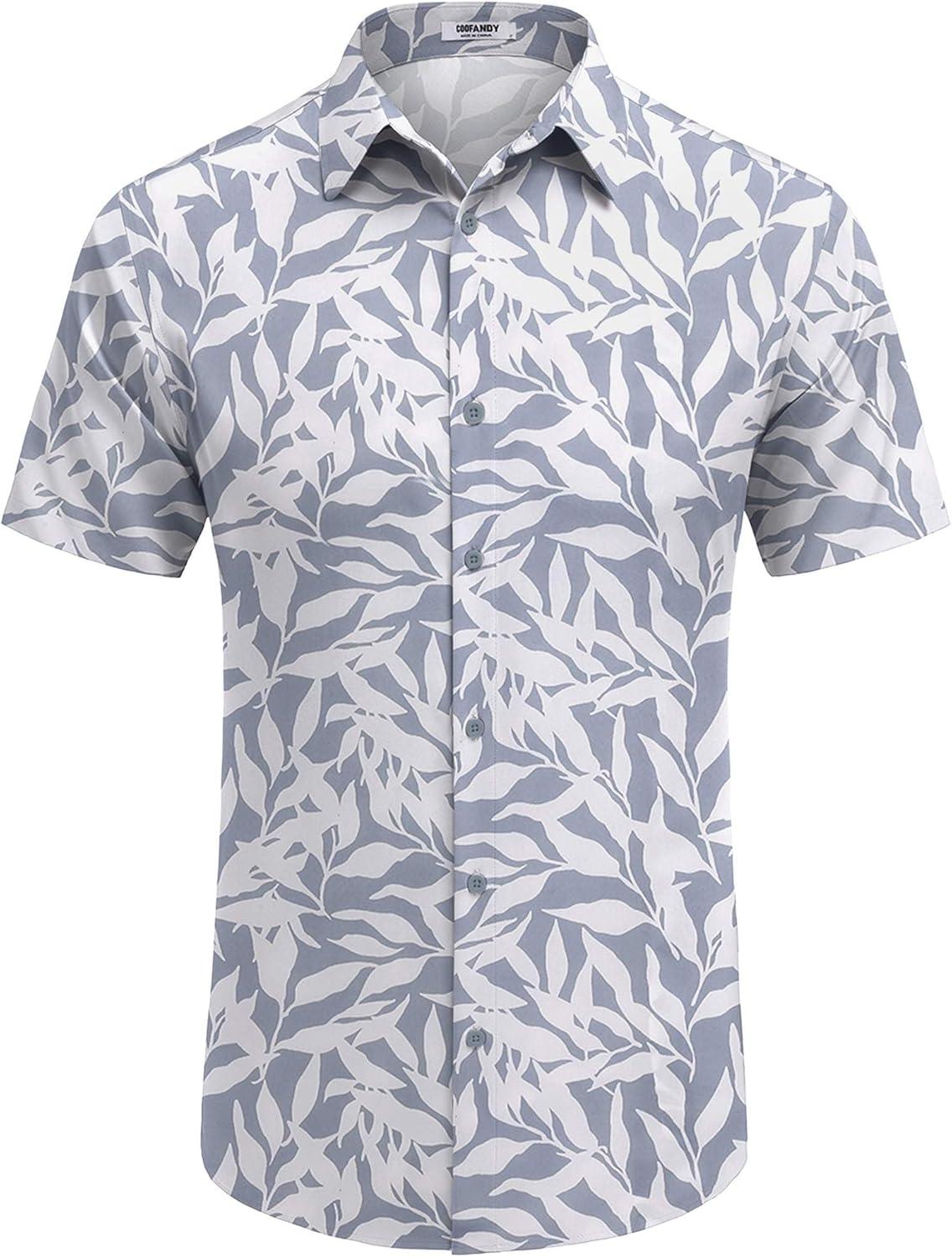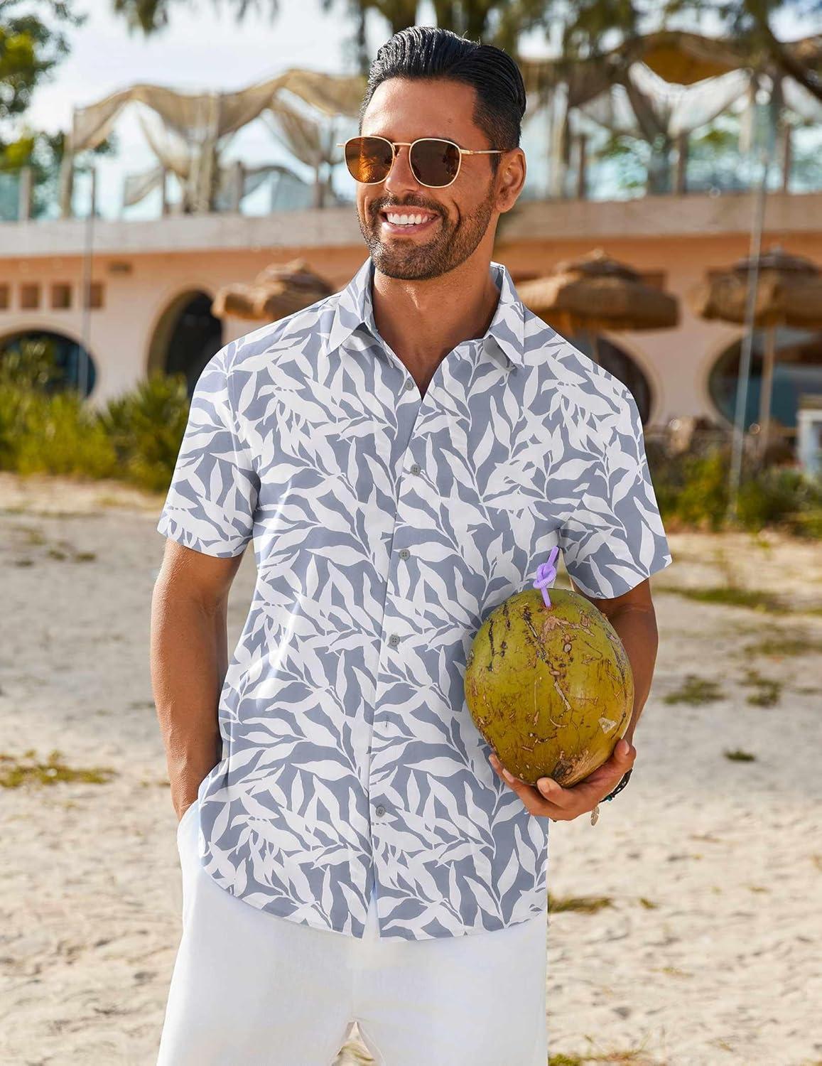 COOFANDY Mens Hawaiian Shirt Short Sleeve Button Down Shirts Tropical Floral Summer Beach Shirts(Light Gray – Leaf)