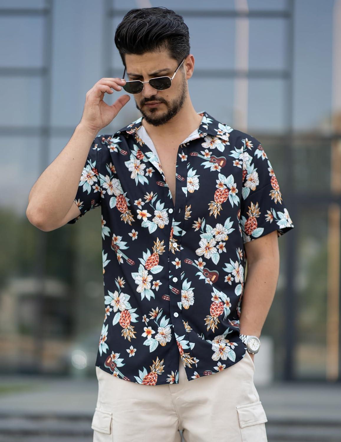 COOFANDY Mens Hawaiian Shirts Short Sleeve Button Down Aloha Shirt Casual Beach Clothes(Black- White Flower)