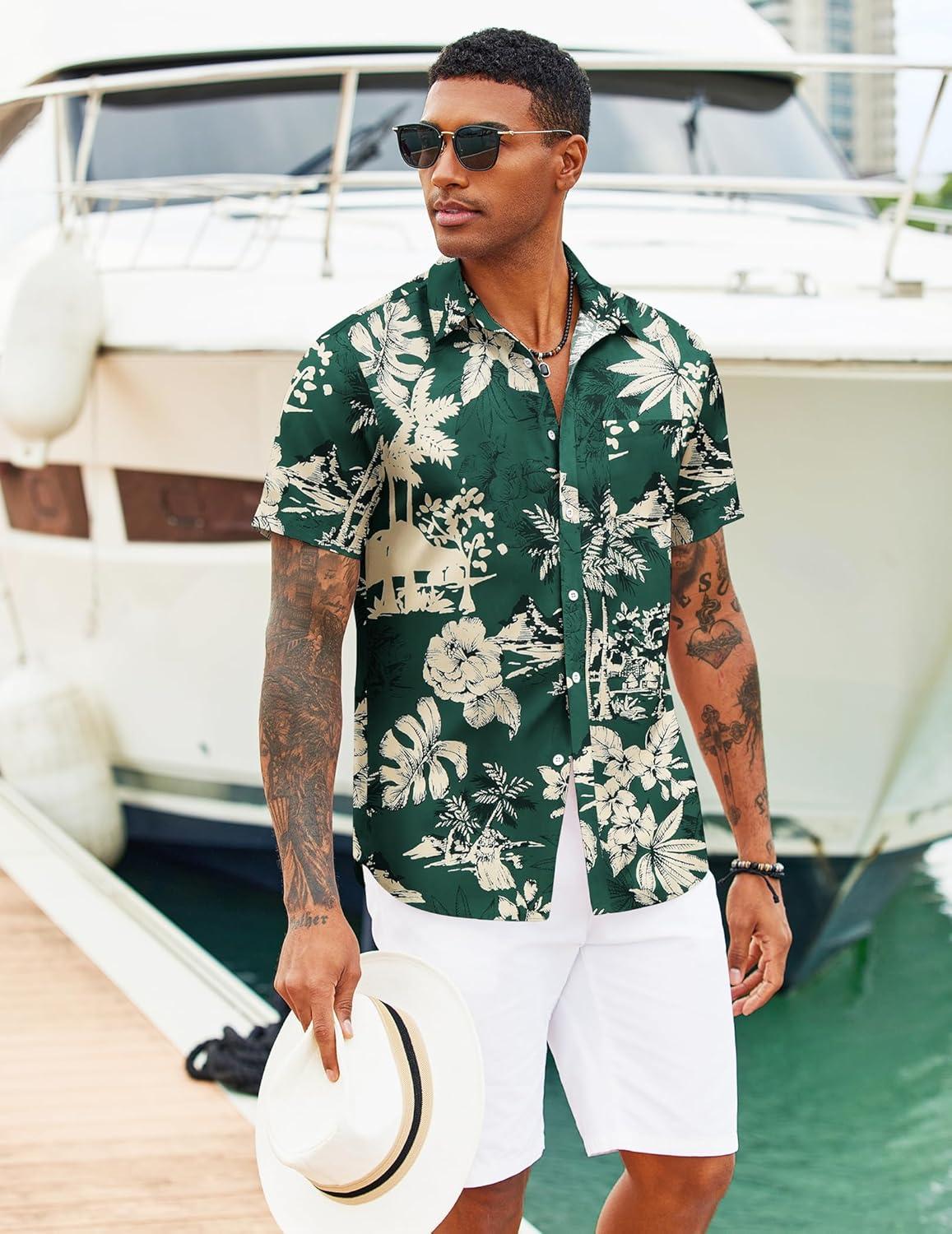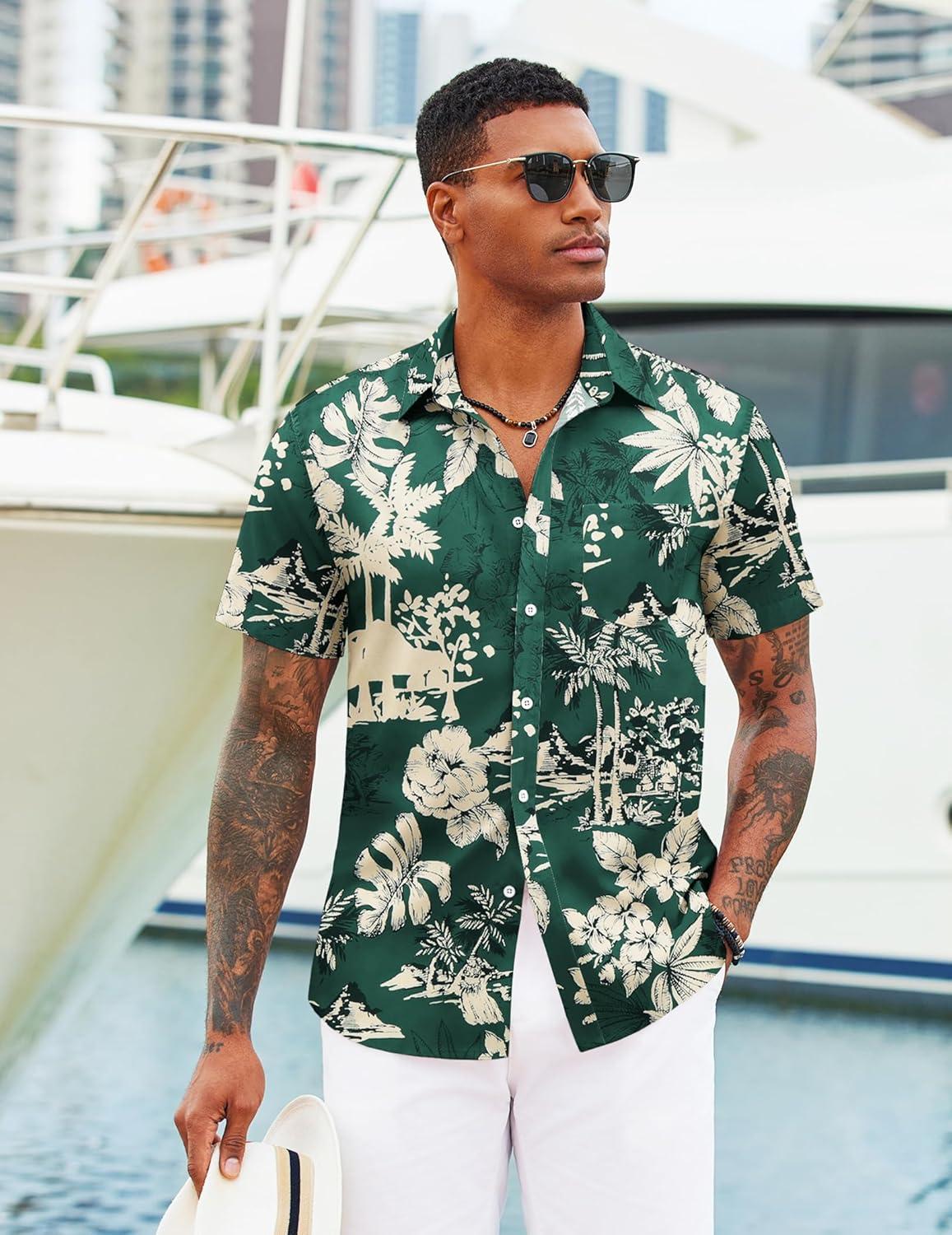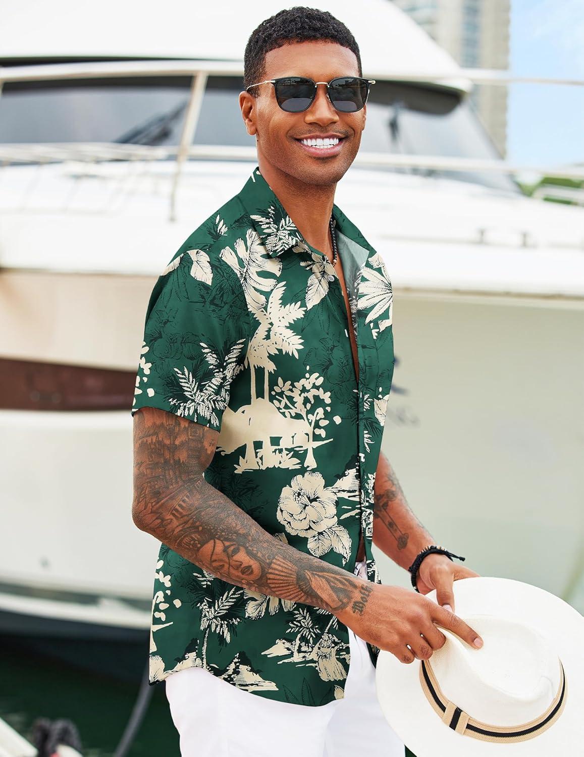 COOFANDY Mens Hawaiian Shirts Short Sleeve Tropical Button Down Shirts Floral Summer Beach Shirt(Green – Palm Tree)