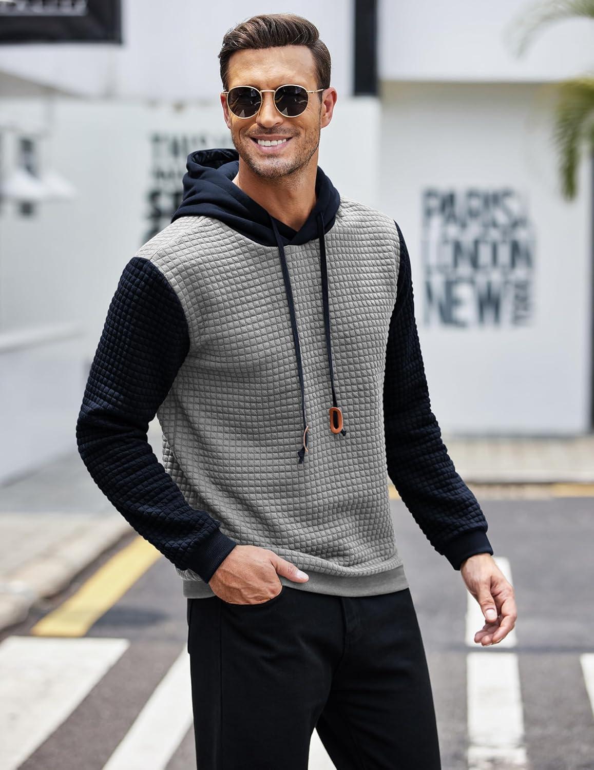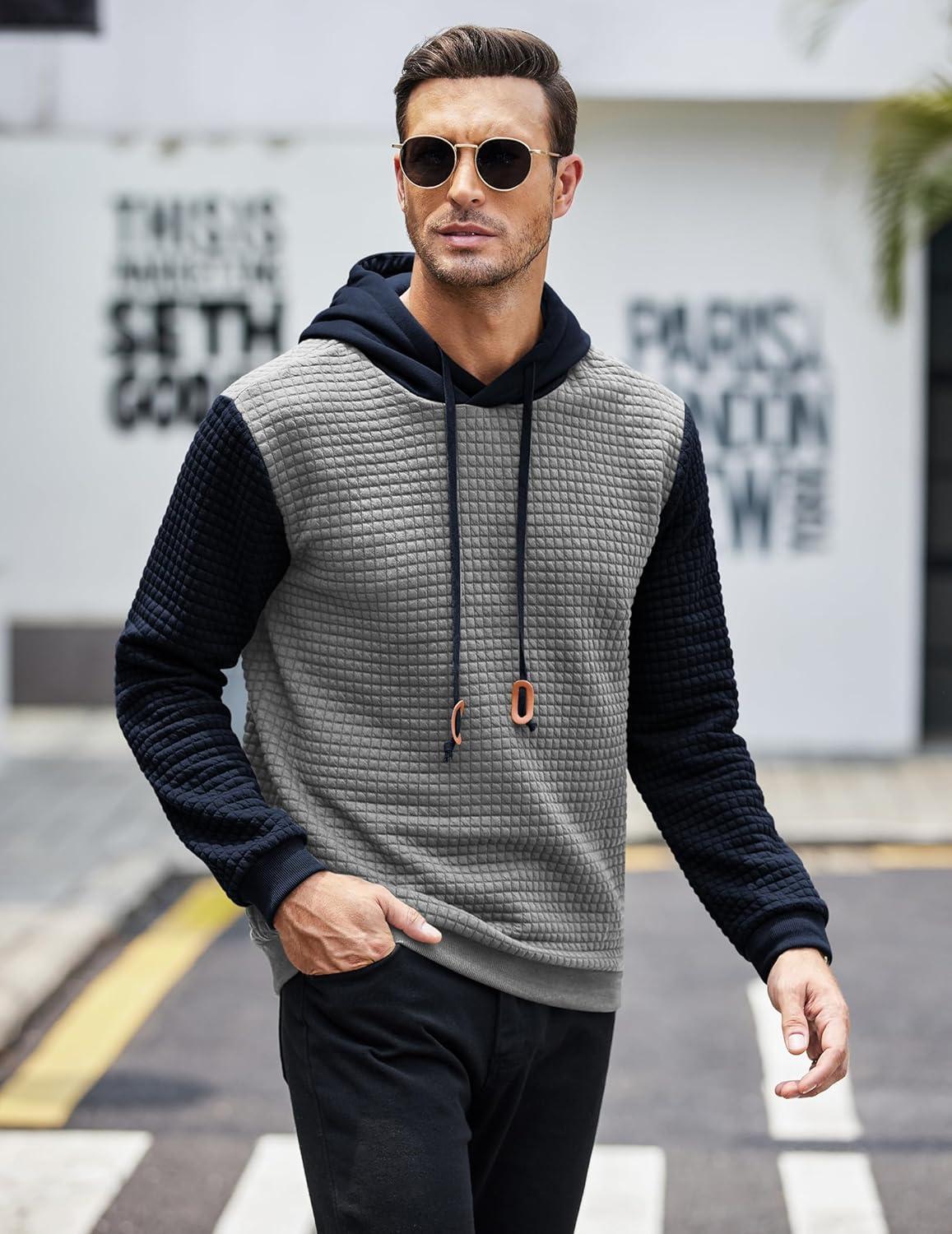 COOFANDY Mens Hooded Sweatshirt Casual Long Sleeve Drawstring Waffle Knit Pullover Hoodies(Pat 2(light Gray&nave Blue))