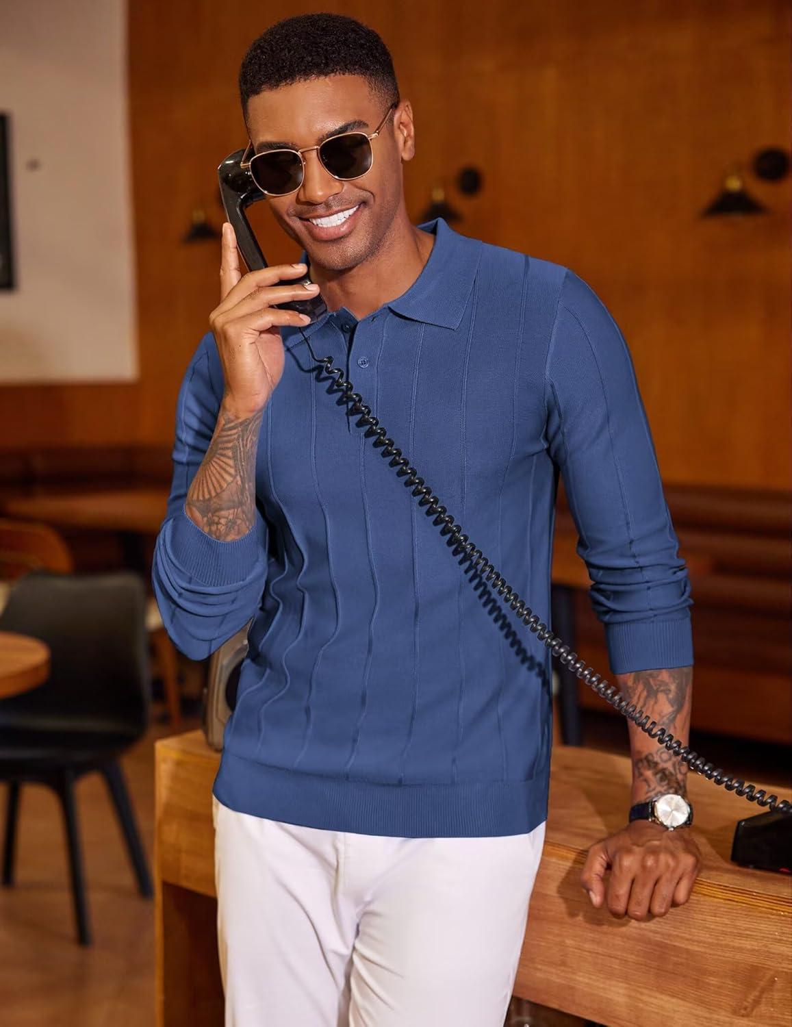 Get your hands on our exclusive COOFANDY Mens Knit Long Sleeve Polo Sweater Business Casual Collared Golf Sweaters Ribbed Textured Activewear Polos(Blue) collection, now at a discounted price.